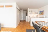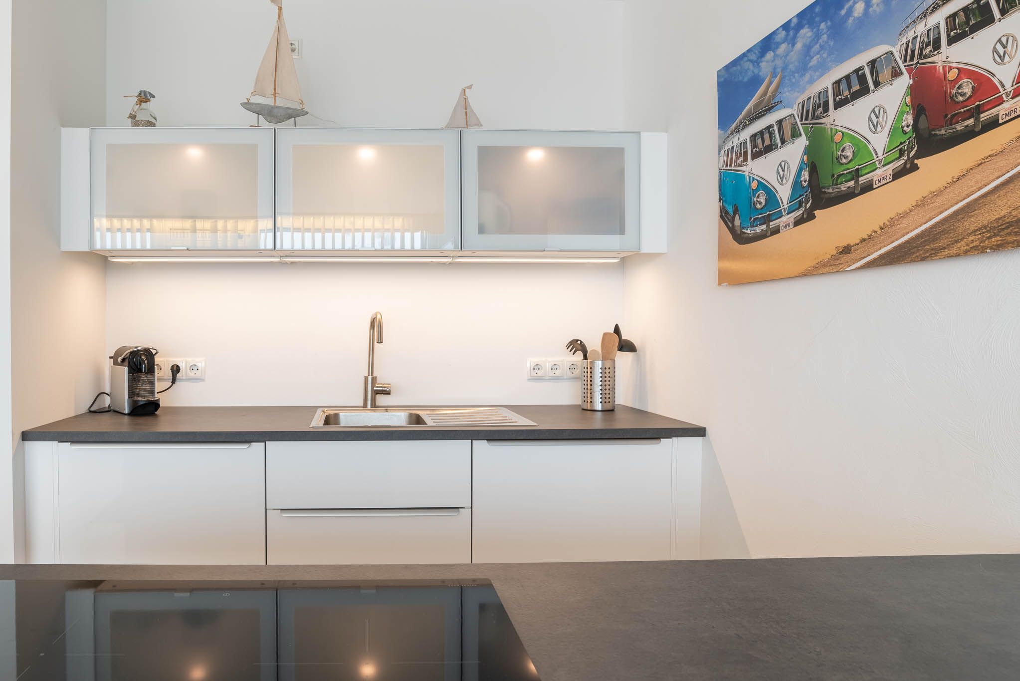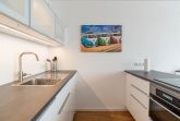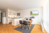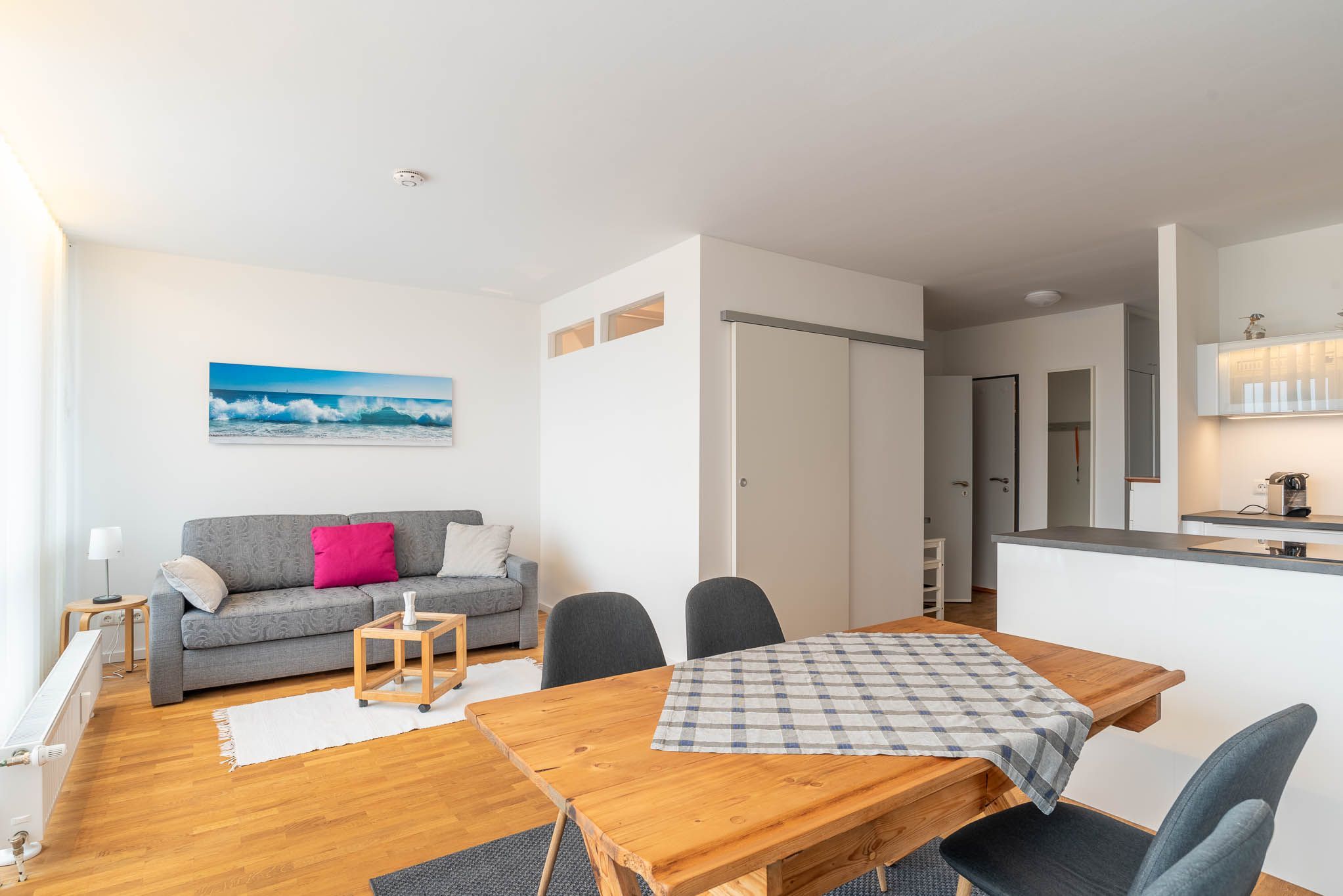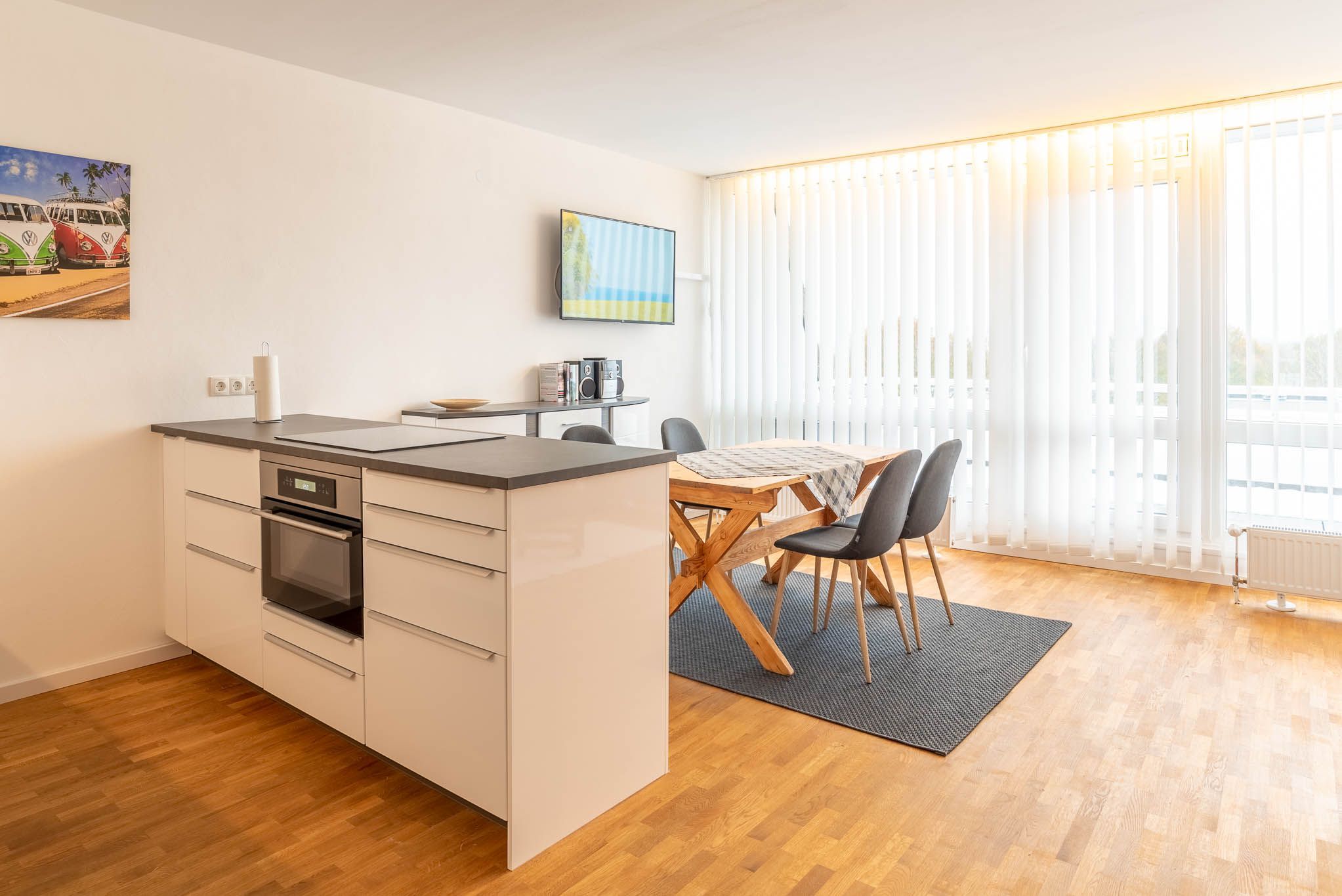 Mit einem Induktionskochfeld, Kühlschrank, Backofen, Wasserkocher und einer Kaffeepadmaschine ist die offene Pantry-Küche eingerichtet und ausgestattet. Auch eine Geschirrspülmaschine steht Ihnen zur Verfügung. Am angrenzenden Esstisch kann man gemütlich zu viert sitzen und essen.