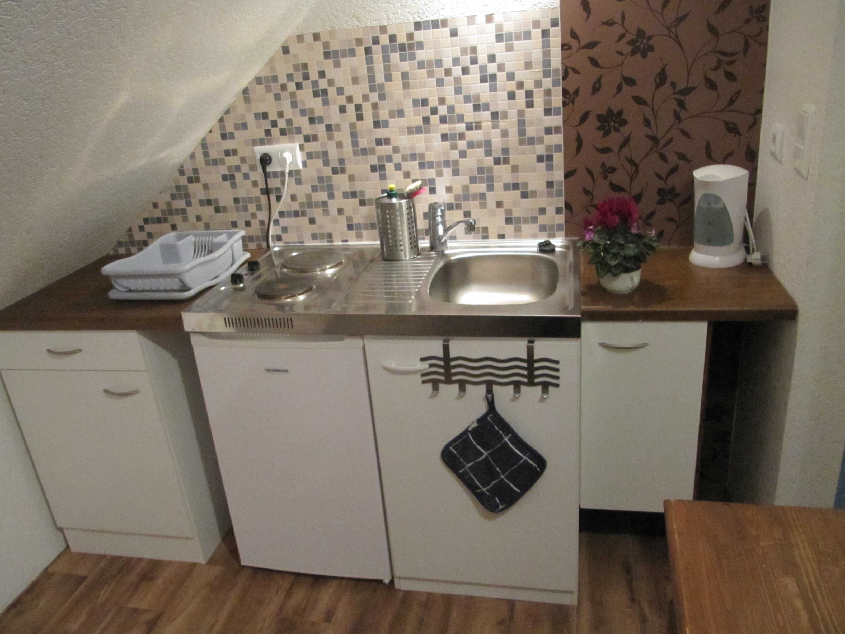 Die Küche ist offen zum Wohnraum (Pantryküche, Mikrowelle, Kaffeemaschine und Wasserkocher)