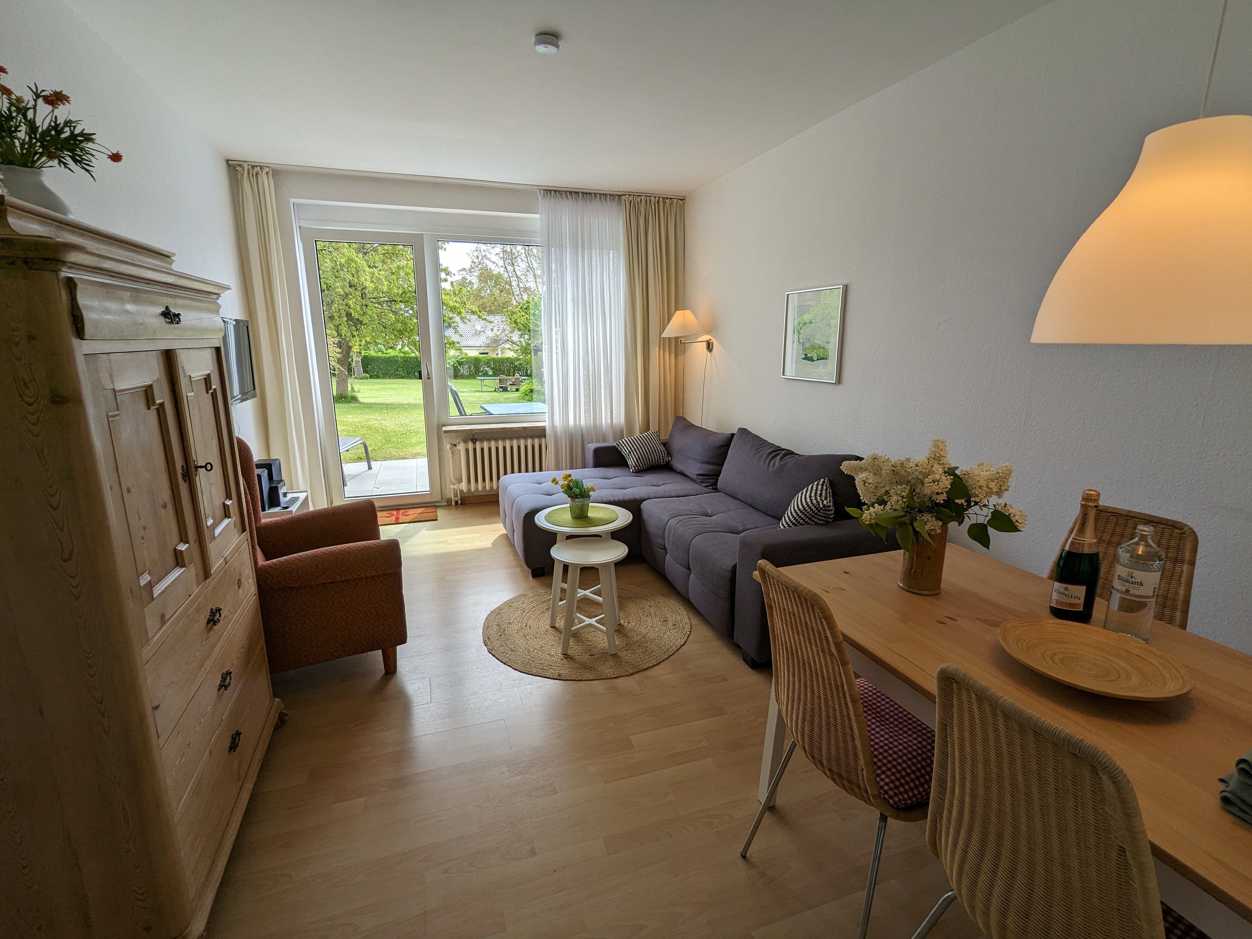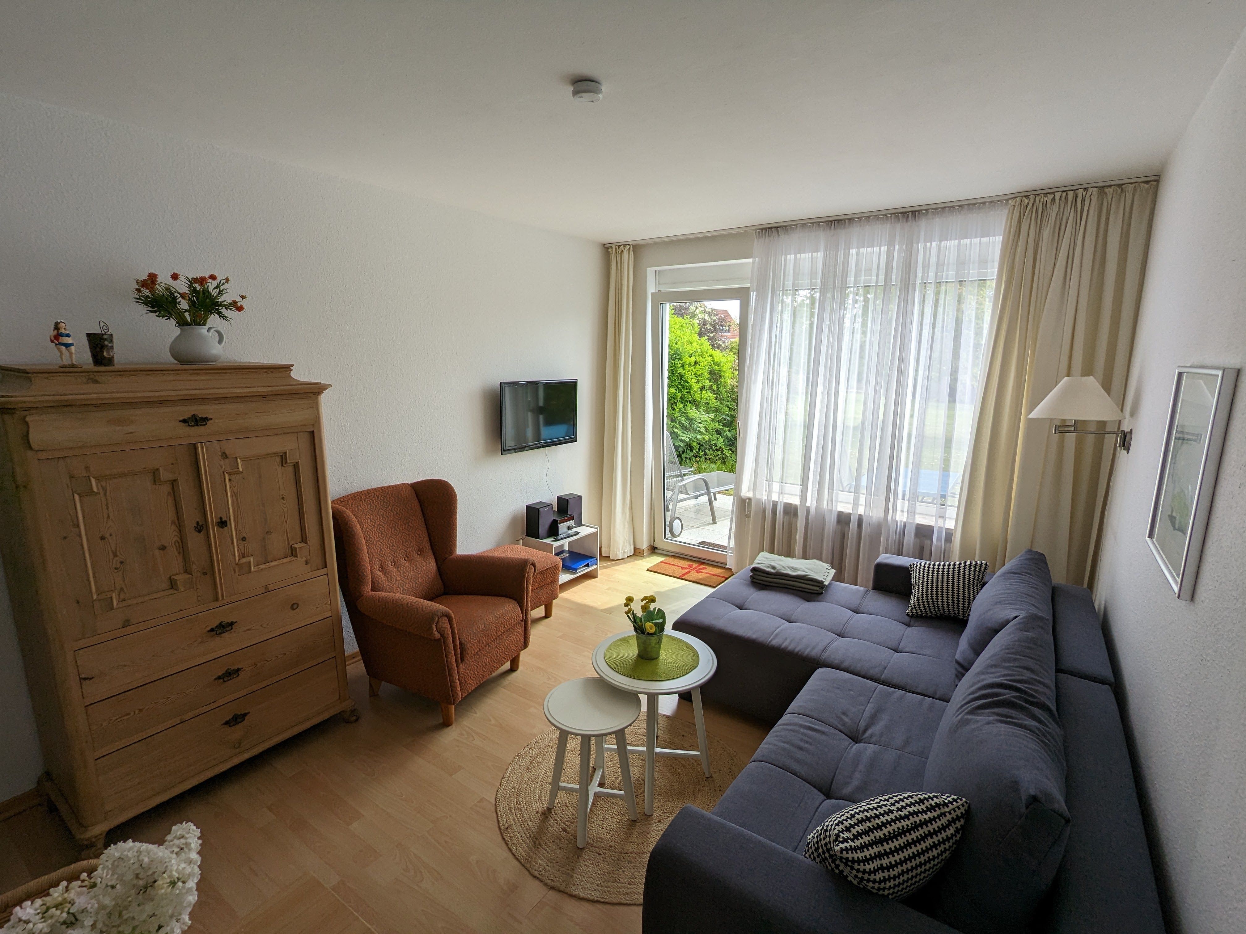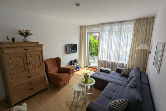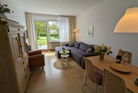 Die ebenerdige 3-Zimmer-Wohnung ist mit Laminat ausgelegt und das Bad gefliest. Das Wohnzimmer verfügt. u.a. über eine bequeme Sitzgruppe mit einem Sofa, einem gemütlichen Ohrensessel mit Fußhocker sowie einer Essecke. Ein Flachbildfernseher ist selbstverständlich vorhanden.