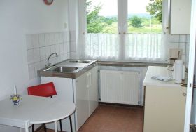 Die Küche bietet alles für die kleine Selbstverpflegung: ein 2-Platten-Kochfeld, Kühlschrank, Wasserkocher, Toaster und Kaffeemaschine.