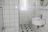 Im gefliesten Bad mit Fenster befinden sich eine Dusche und ein WC.
