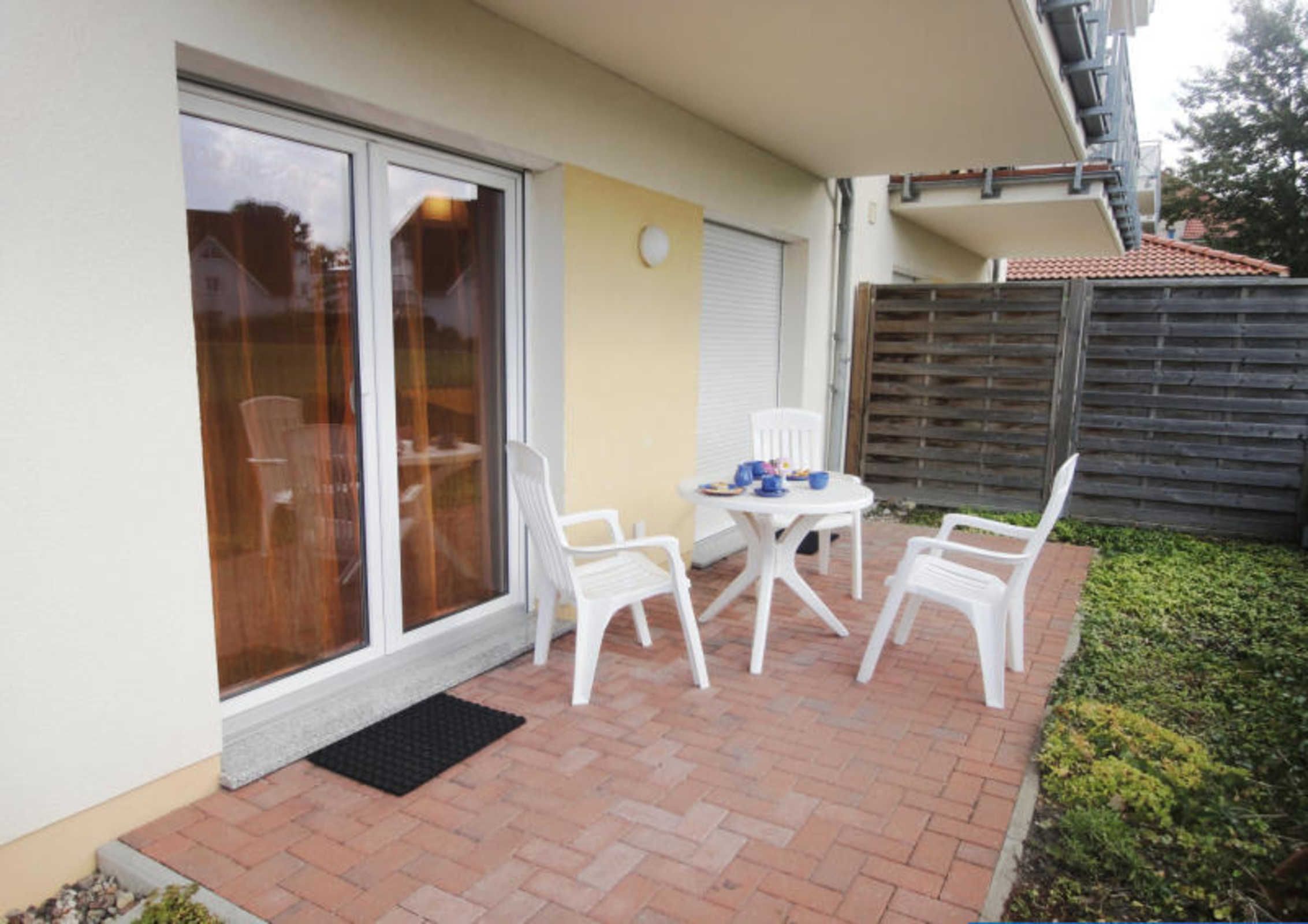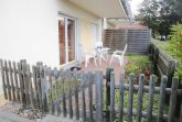 Zu der Ferienwohnung gehören ein Abstellraum und eine umzäunte Terrasse mit Gartenmöbeln.