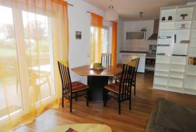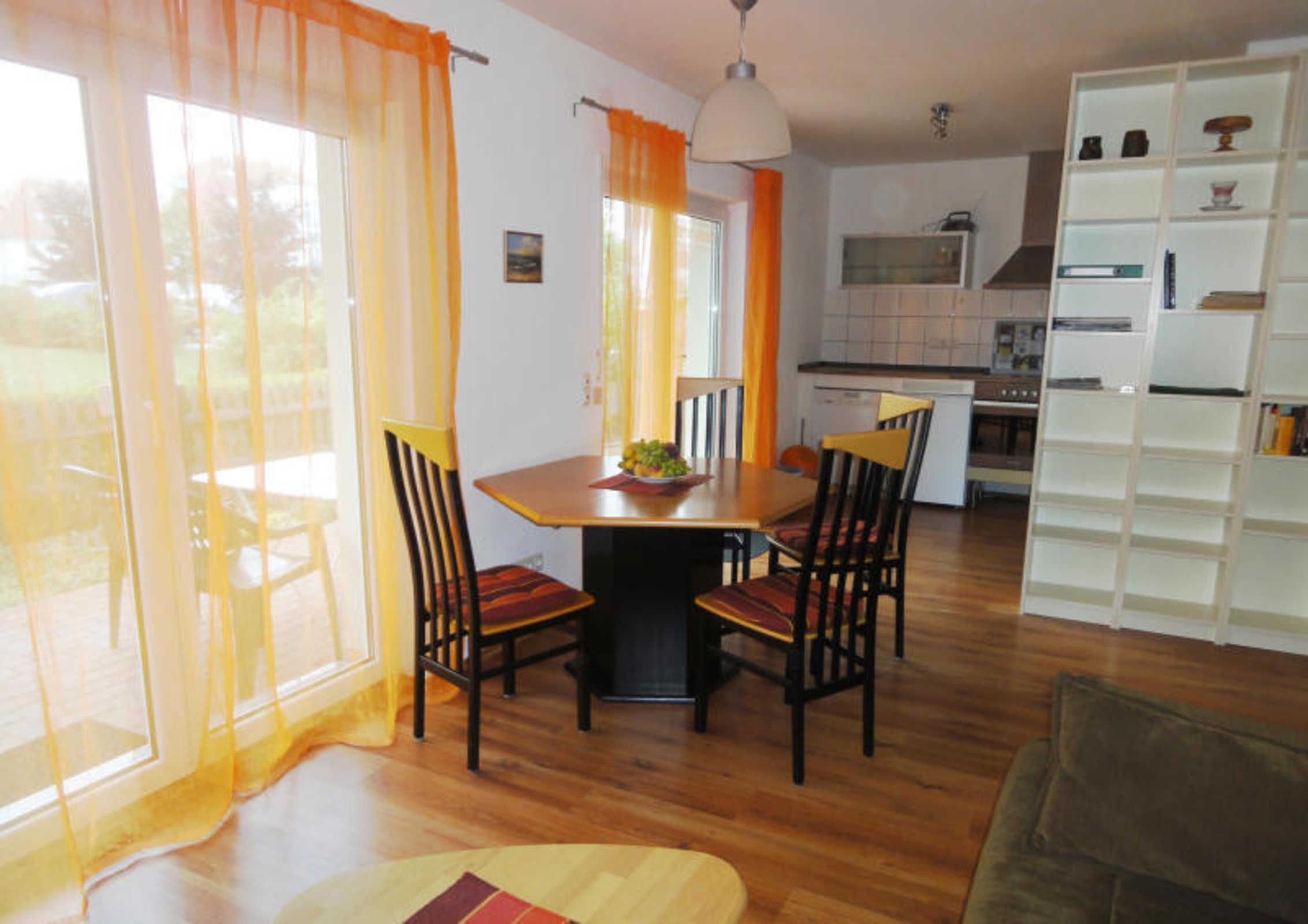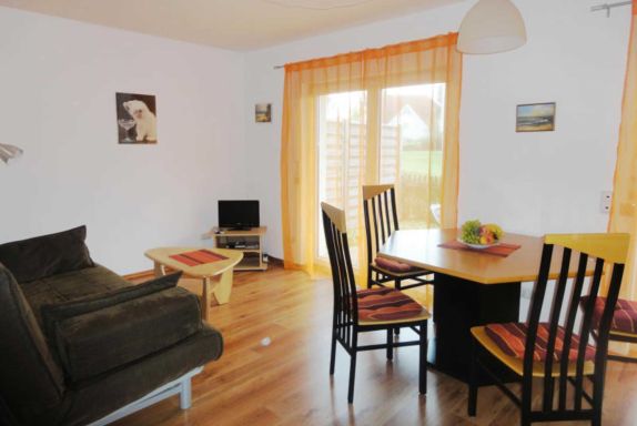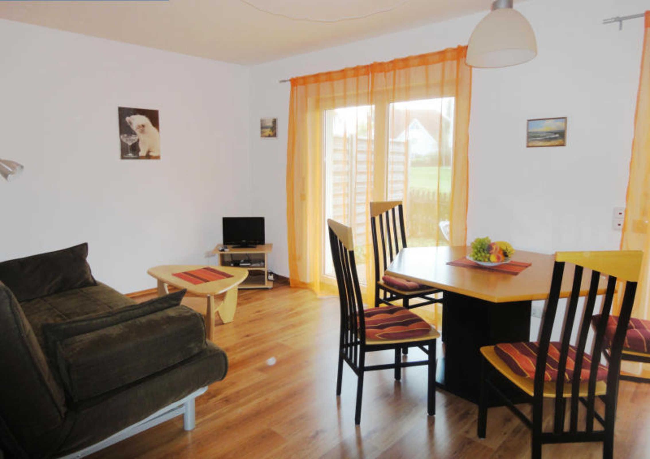 Die 2 Zimmer Ferienwohnung befindet sich im Erdgeschoss im Kiebitzweg in der Ortsmitte. In der Ferienwohnung gibt es ein Wohnzimmer mit einer Couch und einem Fernseher, eine offene Küche mit Geschirrspüler, Backofen und Kühlschrank, ein Schlafzimmer mit einem Doppelbett, einem Etagenbett und einem Kleiderschrank sowie ein Bad mit Dusche, WC und Waschtisch. Zu der Ferienwohnung gehören ein PKW-Stellplatz und eine Terrasse.