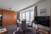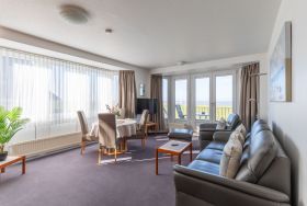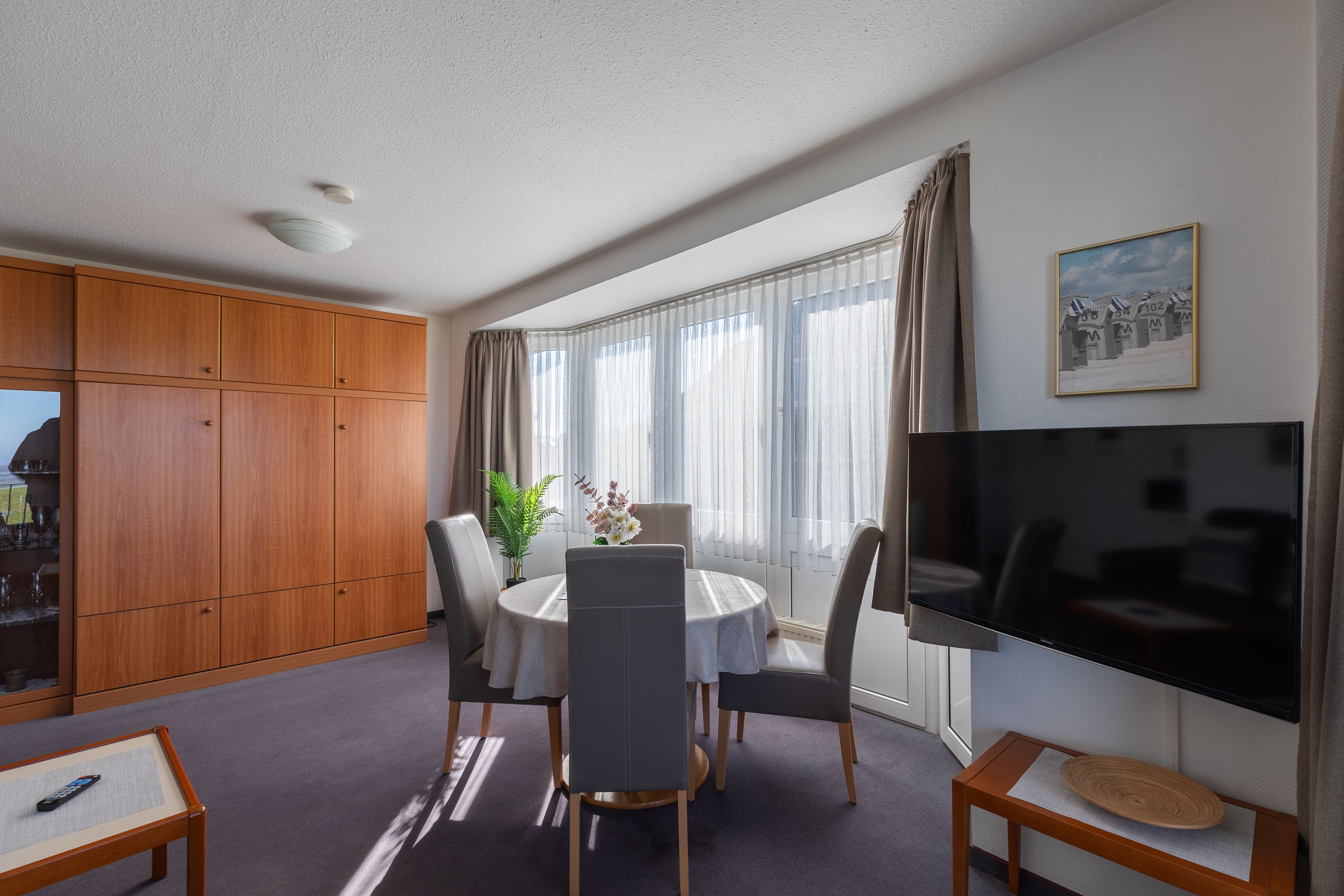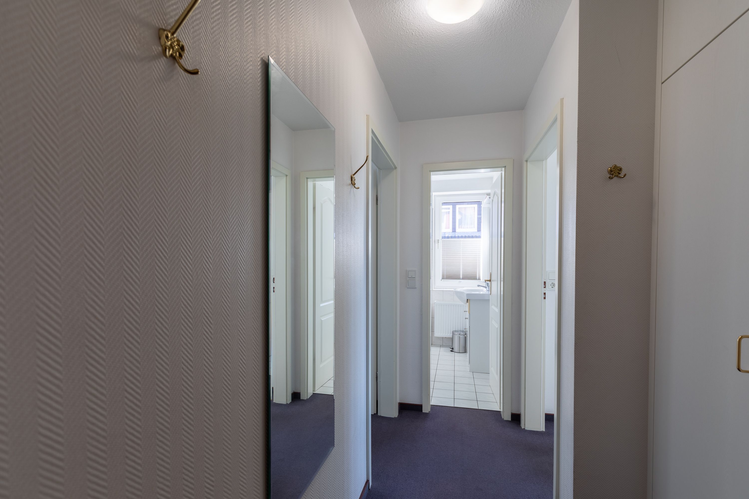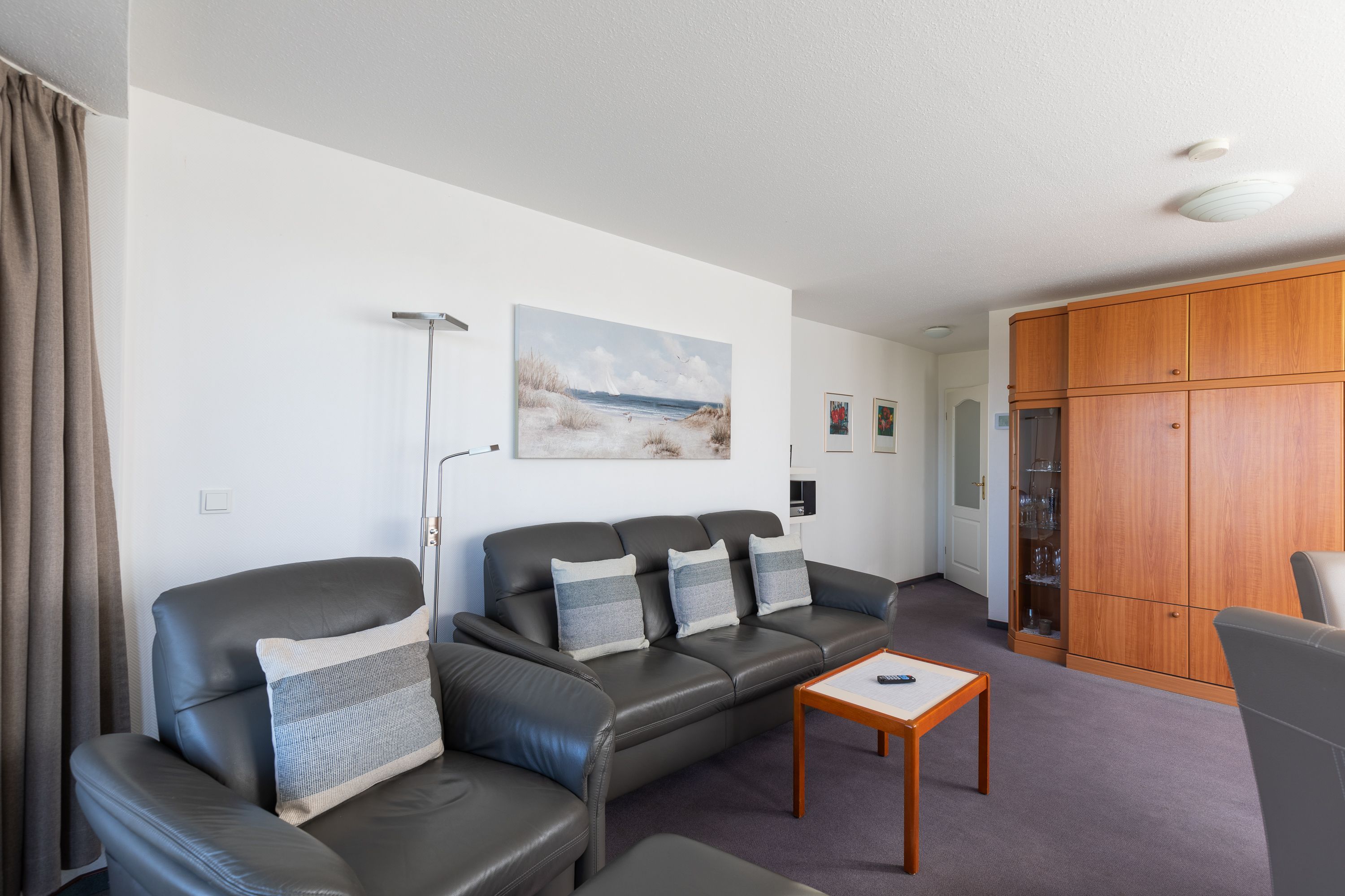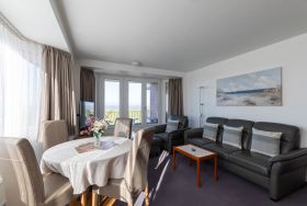 Die Wohnung verfügt über ein Wohnzimmer mit direkter Seesicht, Sessel, Sofa, Essplatz, Schrankbett (mit 2 einzelnen Matratzen), TV und Zugang zum Balkon, vom Balkon aus können Sie einen herrlichen Blick auf das Meer genießen. In der separaten Küche befindet sich eine Einbauküche mit Cerankochfeld (4 Felder), Kühlschrank, Geschirrspüler, Kaffeemaschine, Wasserkocher und Toaster. Vom Flur aus gelangt man in das Tageslichtbad (mit WC, Dusche und Waschbecken) und in das Schlafzimmer mit Doppelbett, Kleiderschrank und TV.