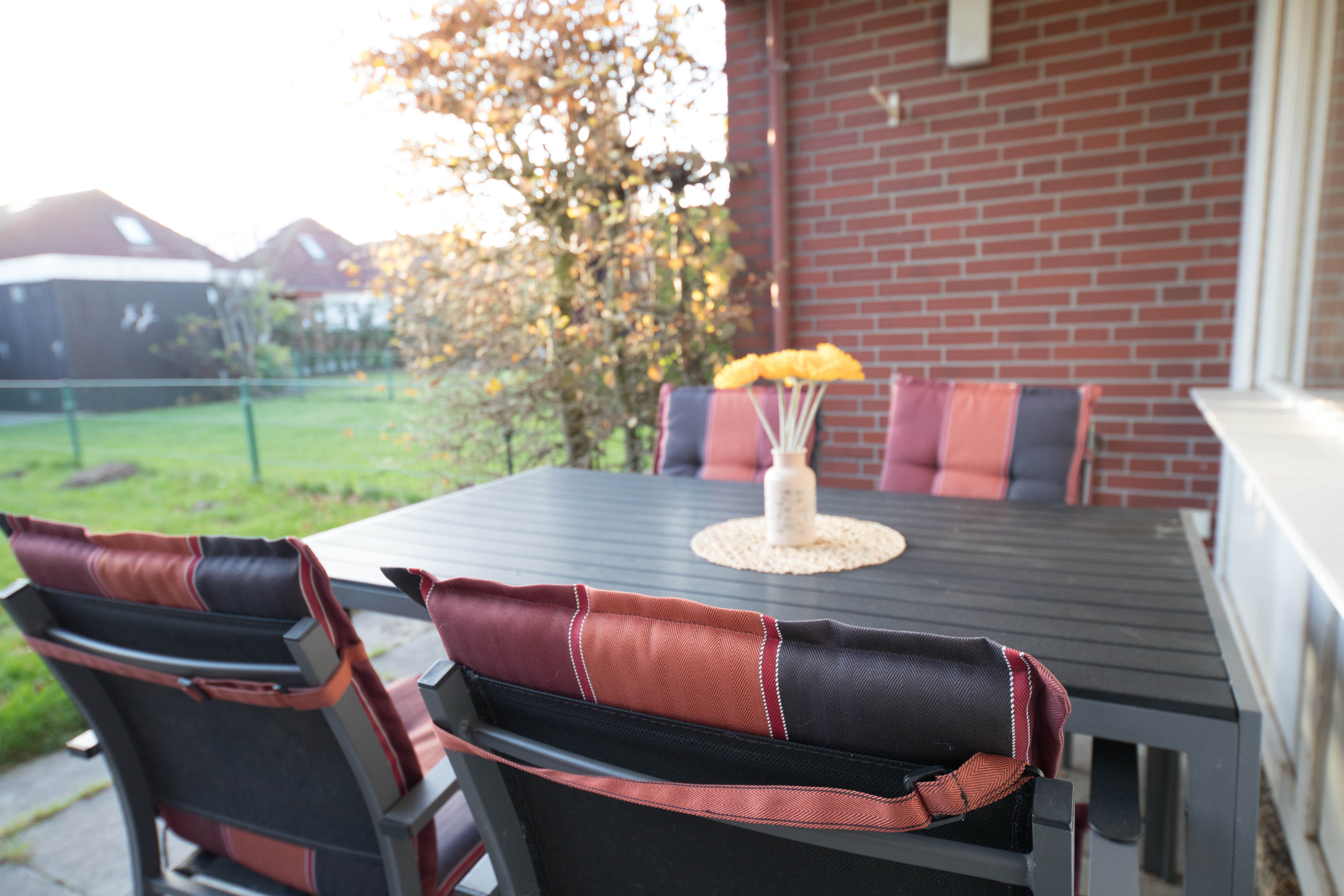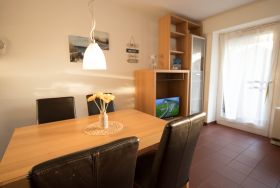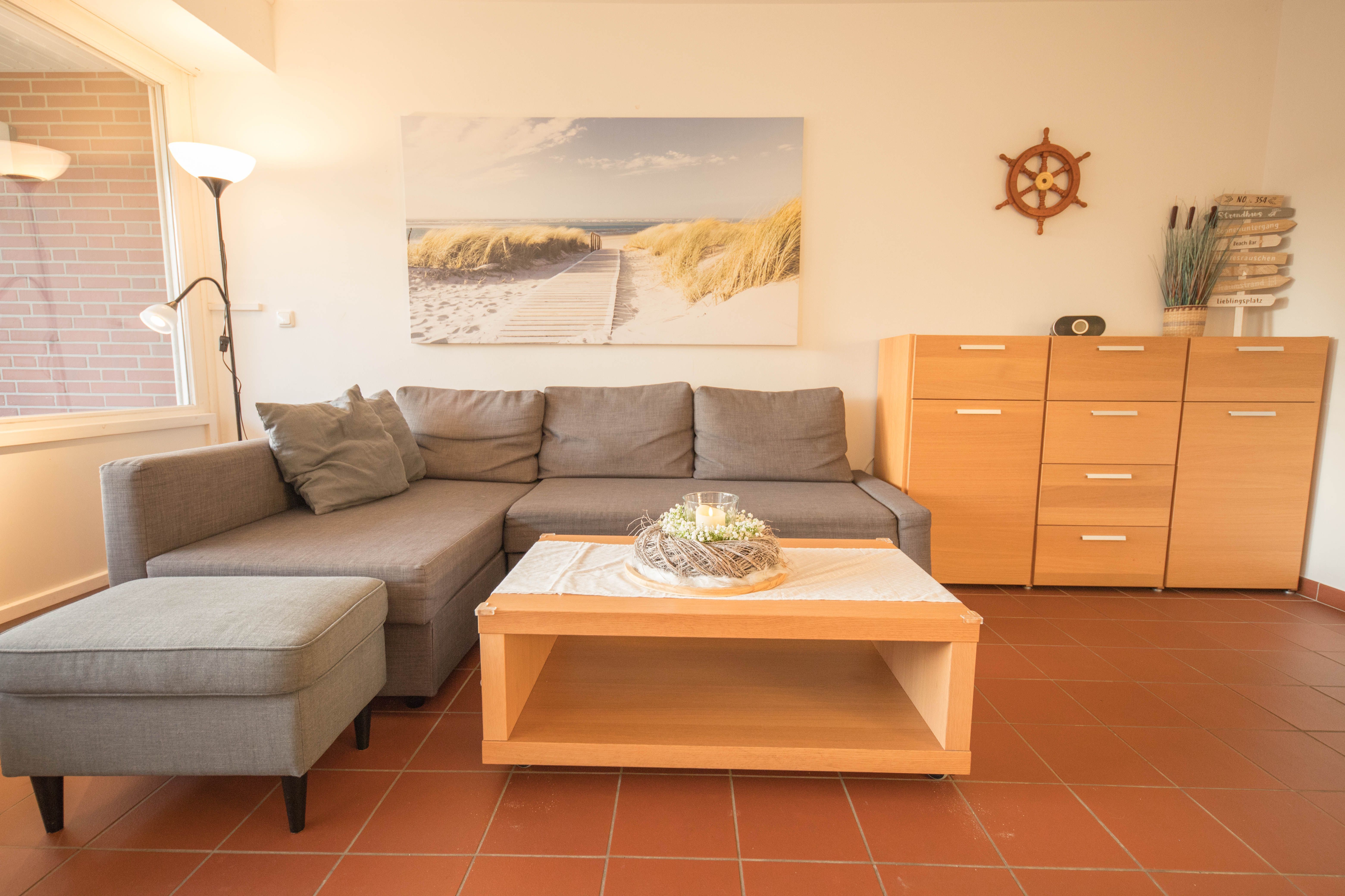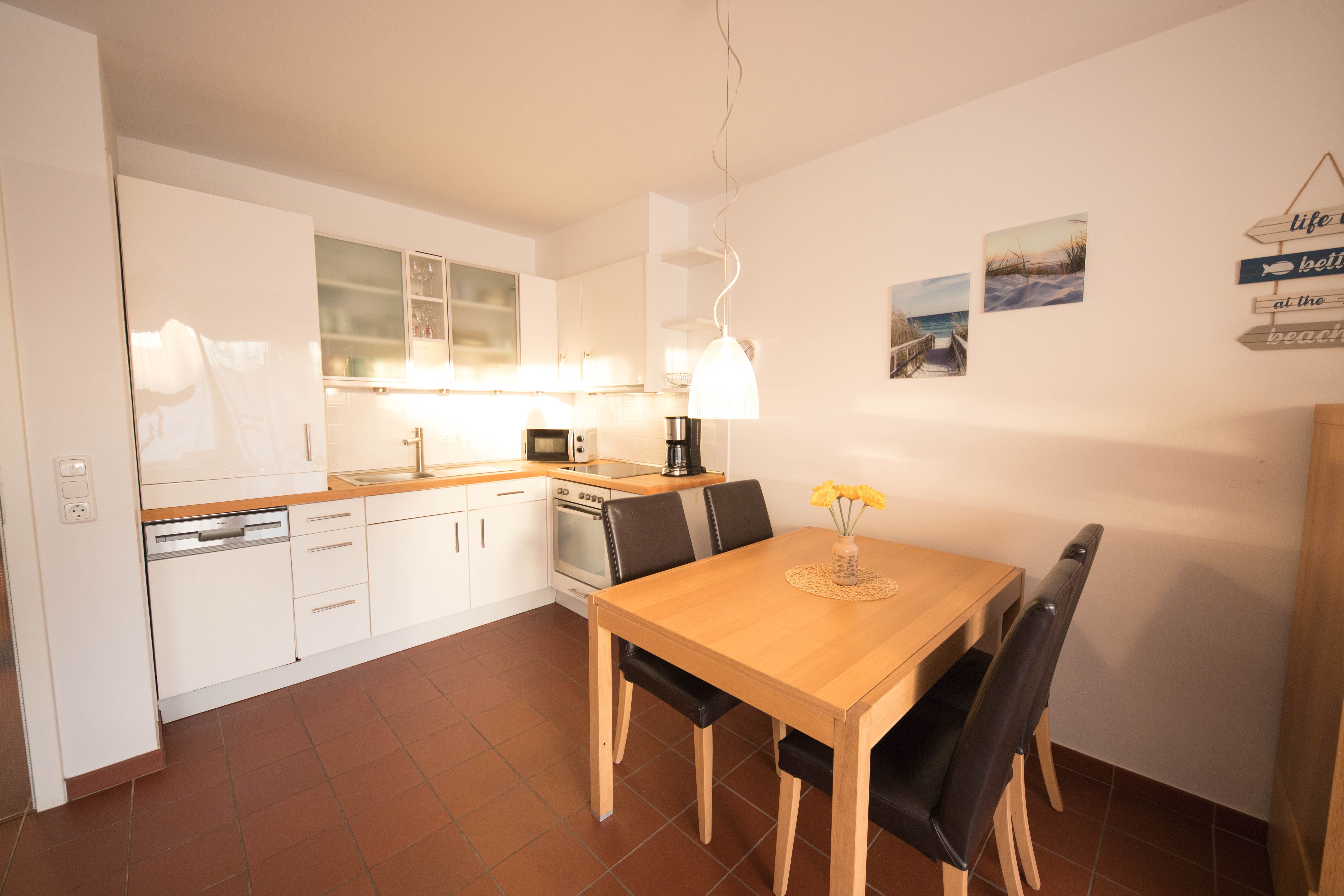 Genießen Sie die freundliche Atmosphäre in unserem offenen Wohn- und Essbereich. Die geschmackvolle Einrichtung sorgt dafür, dass Sie sich sofort wie zu Hause fühlen. Die voll ausgestattete Küchenzeile lässt keine Wünsche offen! Bereiten Sie leckere Mahlzeiten mit modernen Geräten zu. Vorhanden sind ein Backofen mit Ceranfeld, ein Geschirrspüler, Mikrowelle, Kaffeemaschine, Toaster, Wasserkocher, elektrischer Kontaktgrill und Co. Mit einem großzügigen Schlafsofa (1.40 x 2.00m) im Wohnbereich und einem Doppelbett (1.80 x 2.00m) im Schlafzimmer schlafen Sie einfach himmlisch! Verdunkelungsmöglichkeiten durch Rollläden sorgen für erholsame Nachtruhe. Im Flur der sonnendurchfluteten Wohnung befindet sich eine kleine Bilder Dauerausstellung, die zum Betrachten einlädt und für ein zusätzliches Ferienfeeling sorgt. Treten Sie vom Wohnzimmer direkt hinaus auf unsere überdachte Südterrasse und genießen Sie den Blick in den kleinen, eingezäunten Garten perfekt für entspannte Grillabende mit unserem Kugelgrill.
