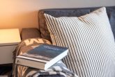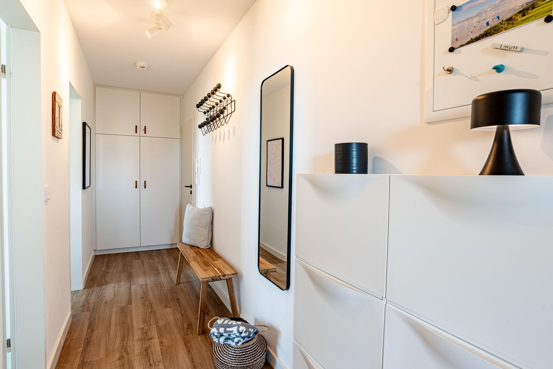 Die Wohnung verfügt über ein separates Schlafzimmer mit einem Doppelbett (1,80m x 2,00m) und einem Einzelbett (0,80m x 2,00m), das als zusätzliche Ebene über dem Doppelbett angebracht ist. Von hier aus haben Sie einen herrlichen Blick auf den Flugplatz von Wyk. Das Badezimmer ist stilvoll in passenden Farben gehalten und bietet eine große Dusche mit Regendusche sowie eine Toilette.