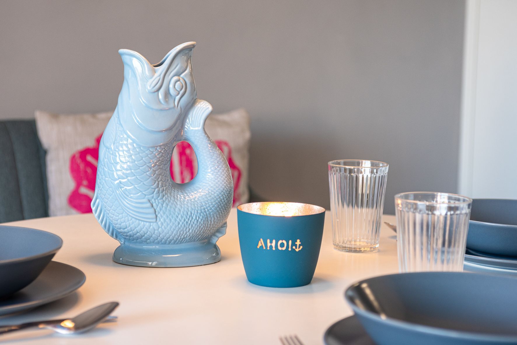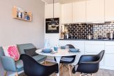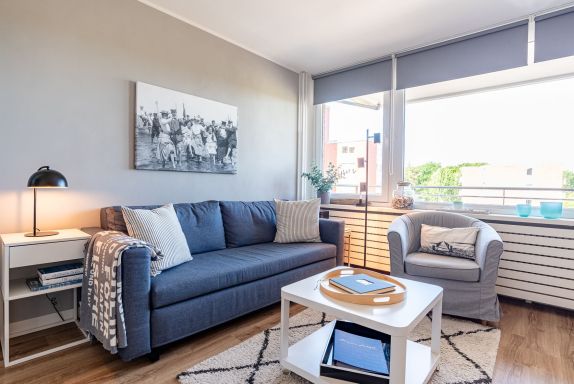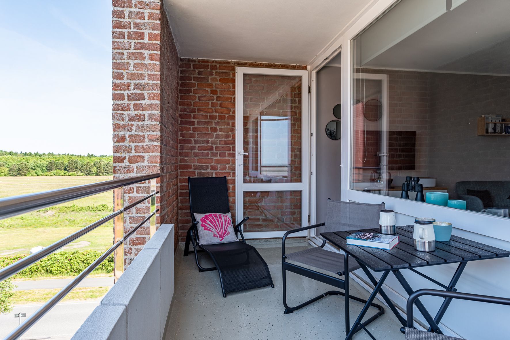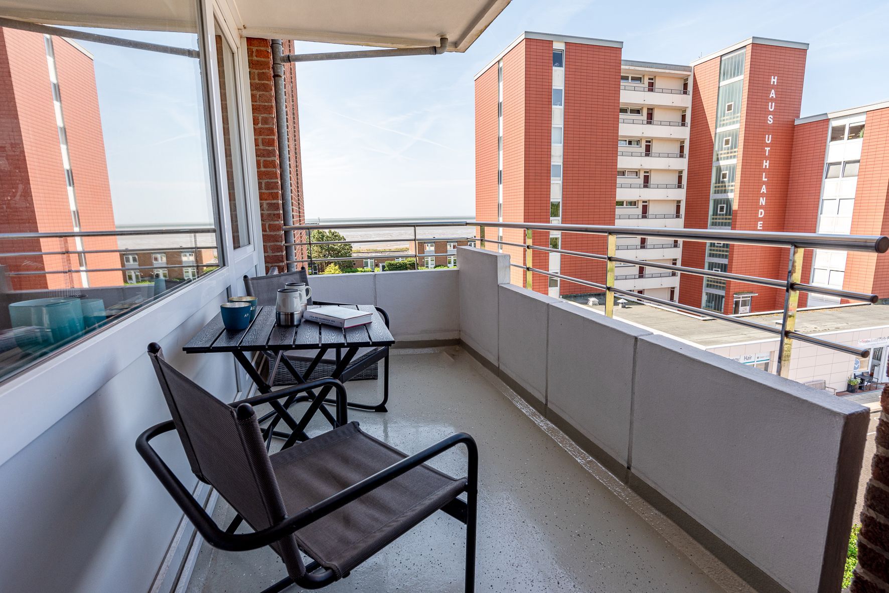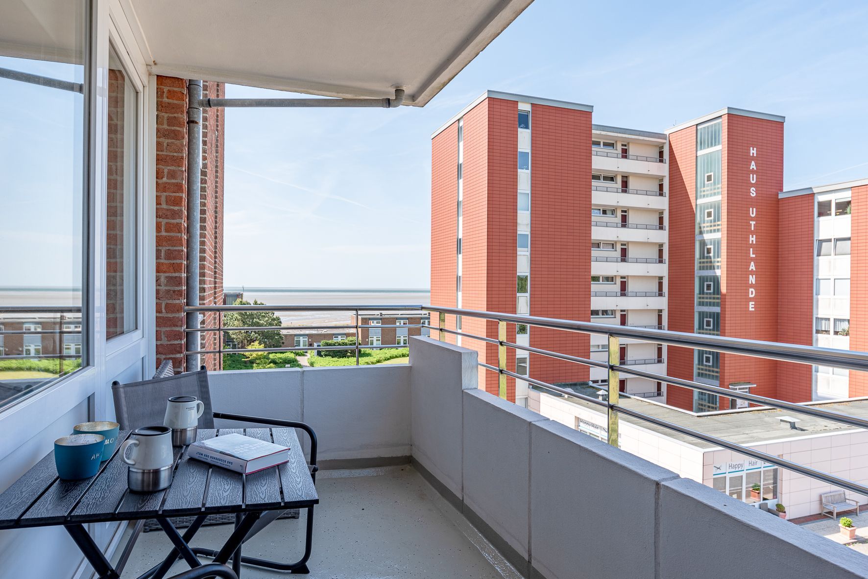 Im großzügigen Wohn- und Essbereich finden Sie eine voll ausgestattete, moderne Küchenzeile mit Induktionskochfeld, Backofen-Mikrowellen-Kombigerät, Nespresso-Kapselmaschine und weiteren technischen Geräten vor. Eine bequeme Sitzgelegenheit, ein 42 Smart-TV und eine Bose-Bluetooth-Box sorgen für Unterhaltung und Entspannung. Der zweite Balkon bietet einen Blick auf die Nordsee und lädt mit einem Lounge-Sessel zum Verweilen ein oder zum gemütlichen Frühstücken.