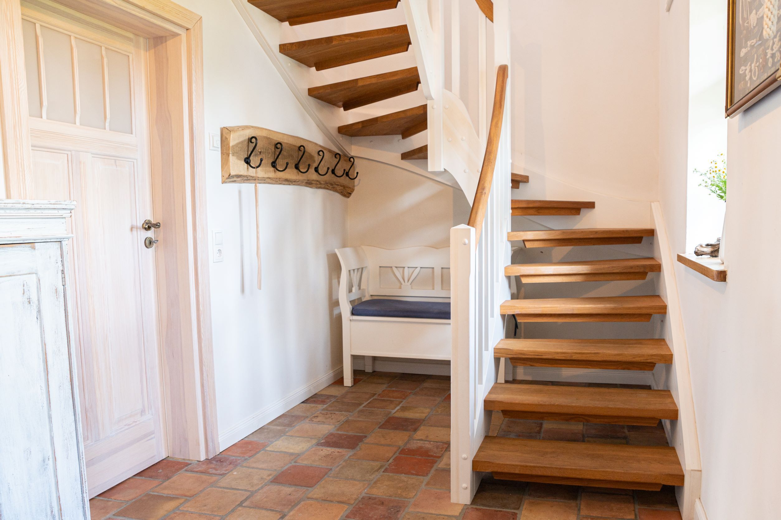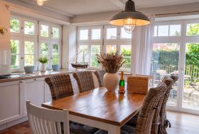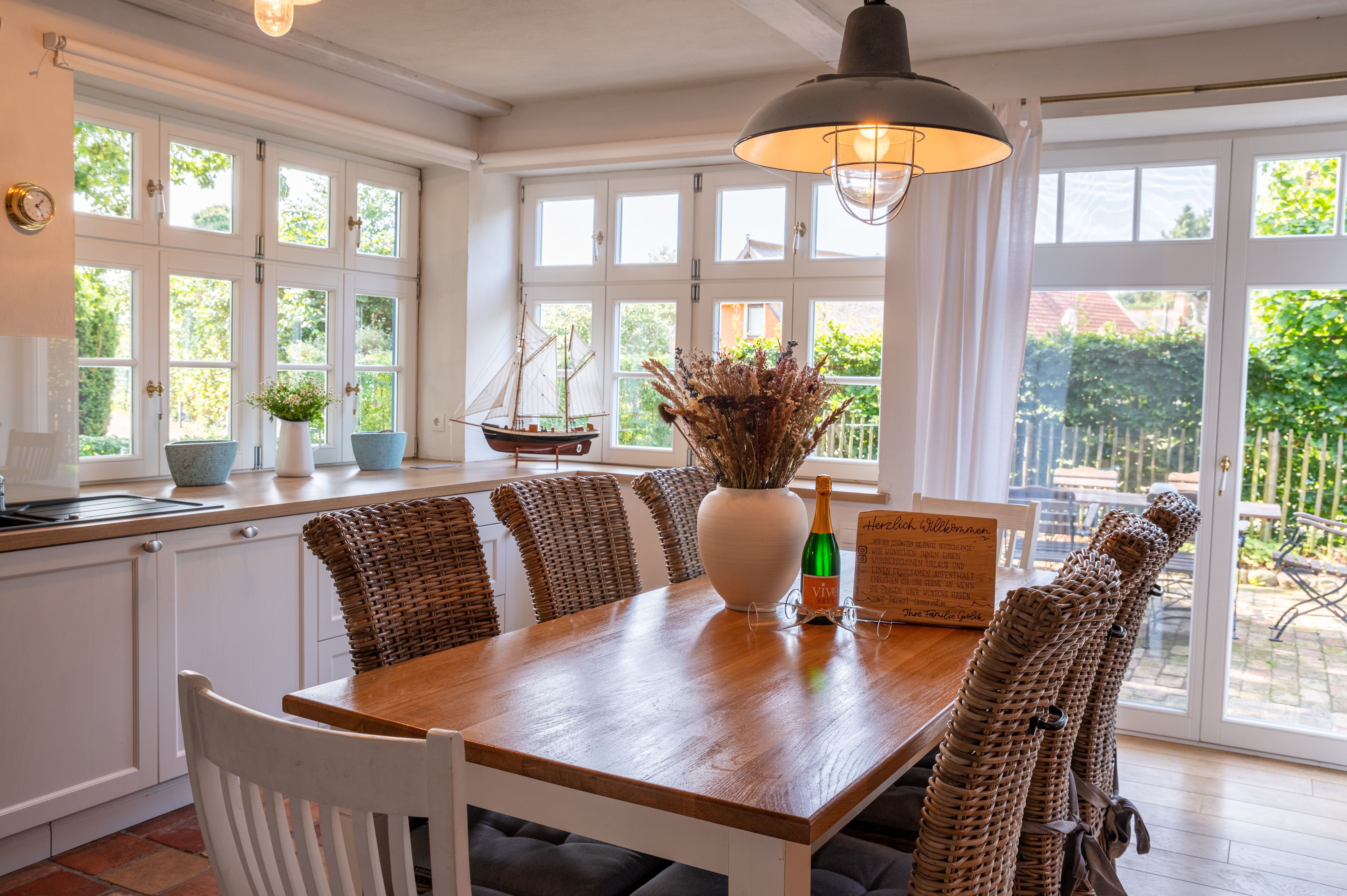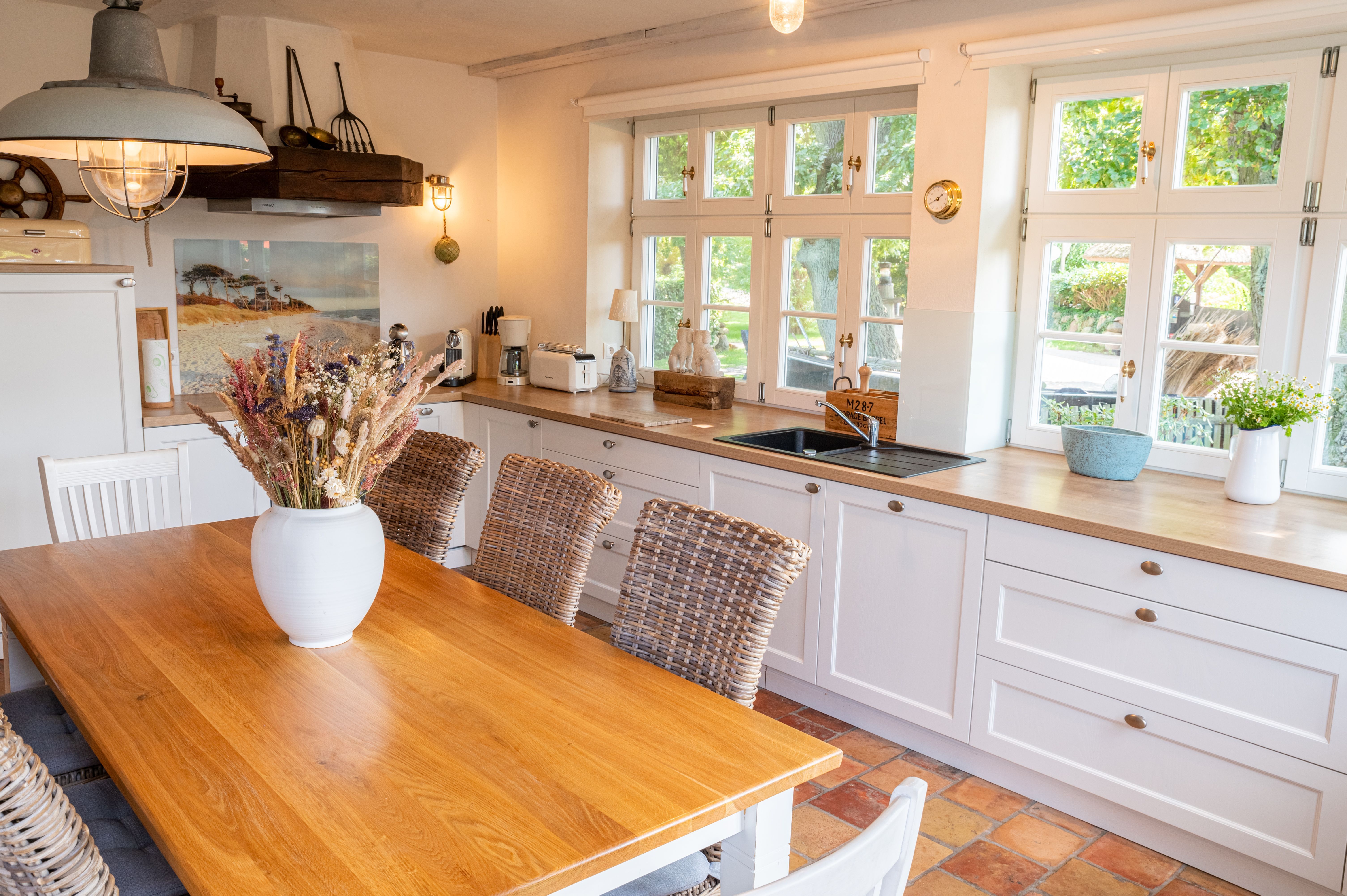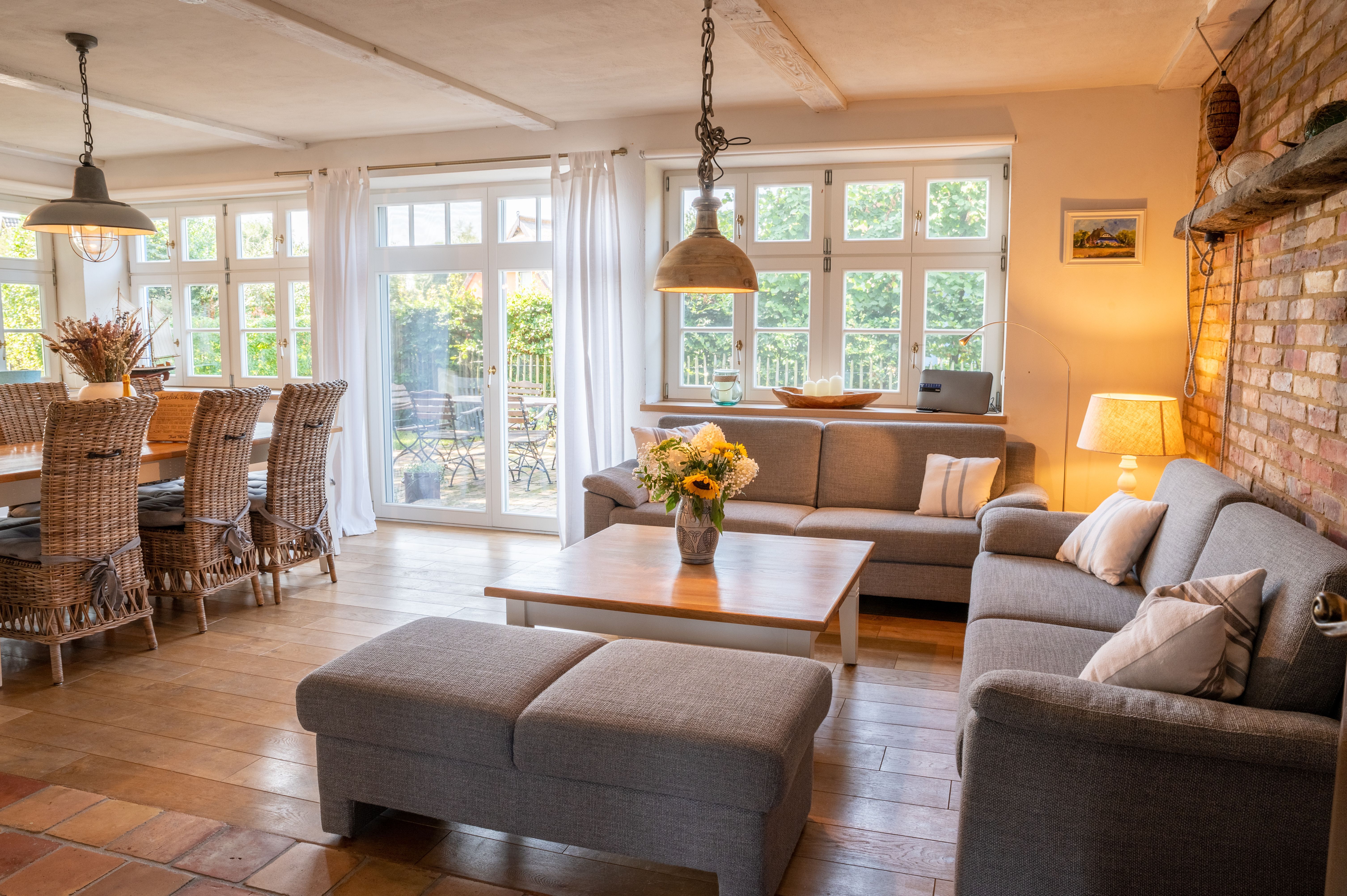 Erleben Sie großzügigen Komfort in unserem liebevoll gestalteten Wohn-/Essbereich, der mit originalen Darßer Fliesen und Eichen-Echtholzdielen ausgestattet ist. Genießen Sie wohlige Wärme durch die Fußbodenheizung oder entspannen Sie am Kamin, für den Ihnen kostenlos Holz zur Verfügung steht. Der helle Raum bietet direkten Zugang zur nordöstlich ausgerichteten Terrasse.
