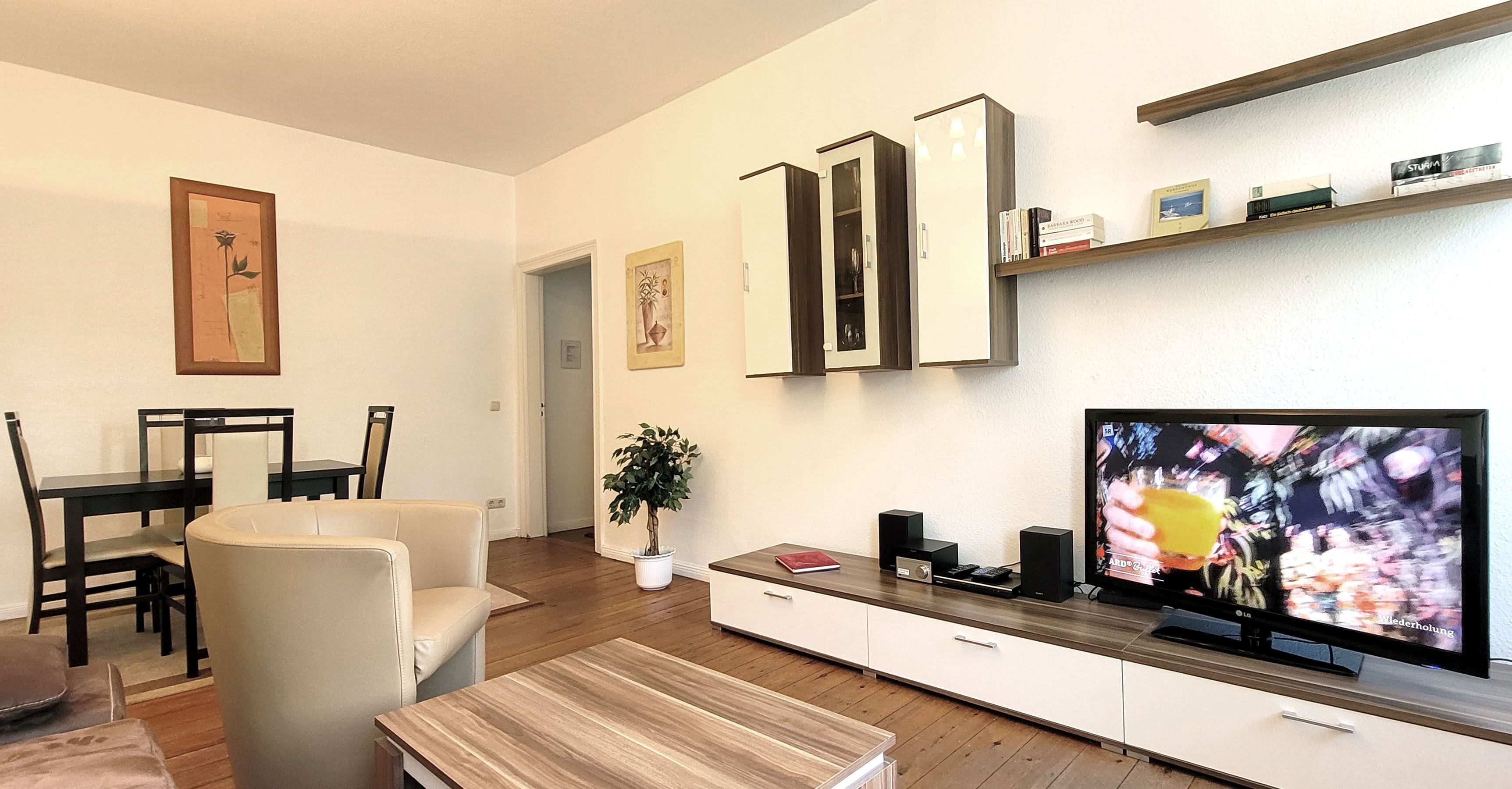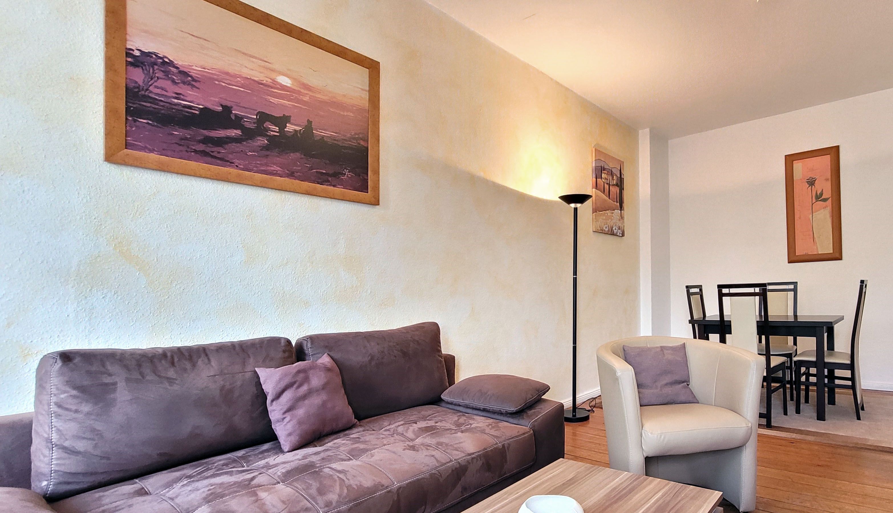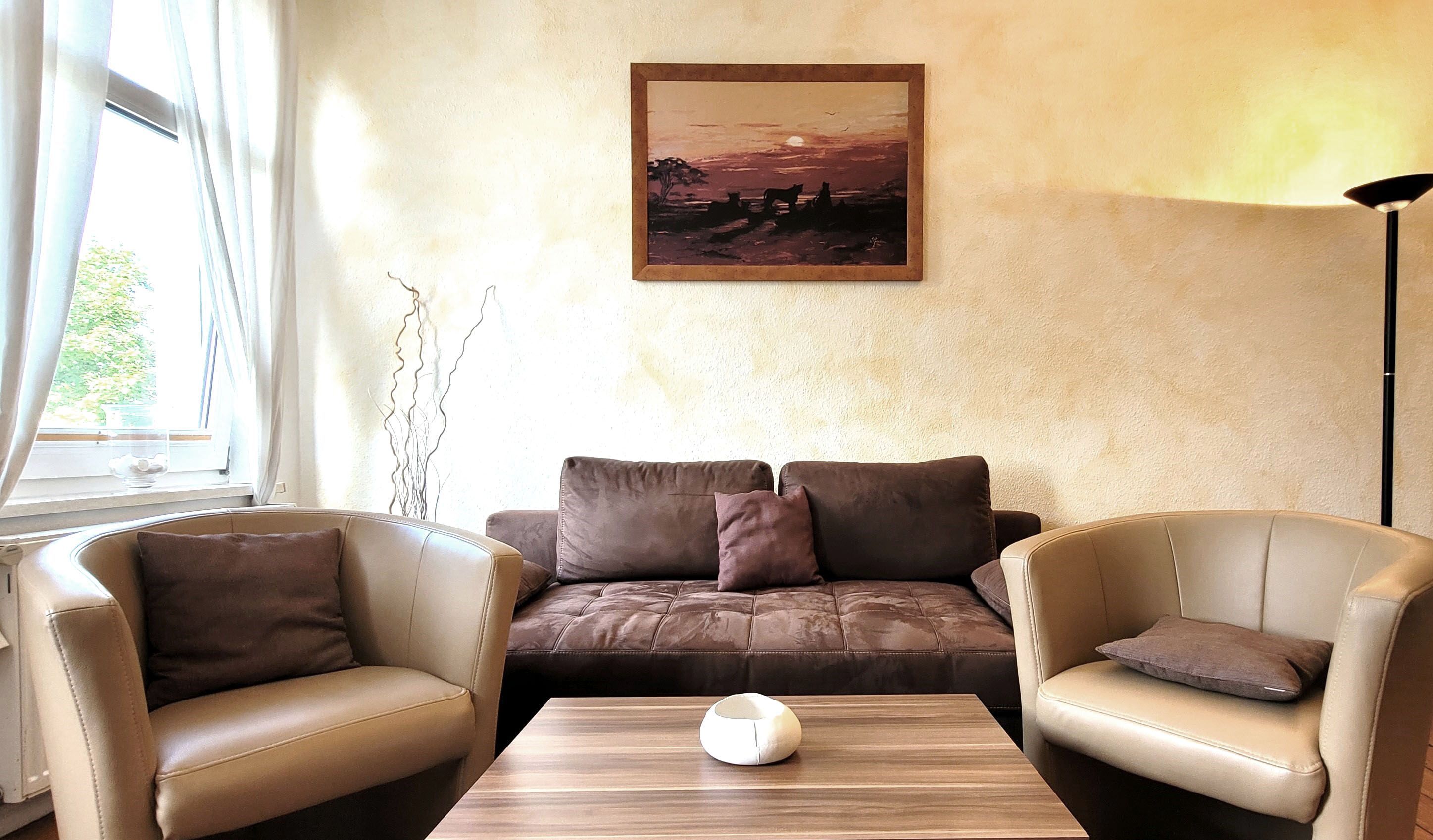 Modern eingerichtete Ferienwohnung für 2 Personen. Nach Absprache können 2 weitere Personen auf dem Schlafsofa im Wohnzimmer übernachten. Im Wohnzimmer befinden sich ebenfalls eine gemütliche Sitzecke sowie ein Essbereich. Ihnen stehen ein 42 Flachbildfernseher im Wohnzimmer zur Verfügung und ein weiterer, etwas kleinerer Flatscreen im Schlafzimmer. Das Schlafzimmer ist zusätzlich mit Doppelbett und großem Schlafzimmerschrank ausgestattet.