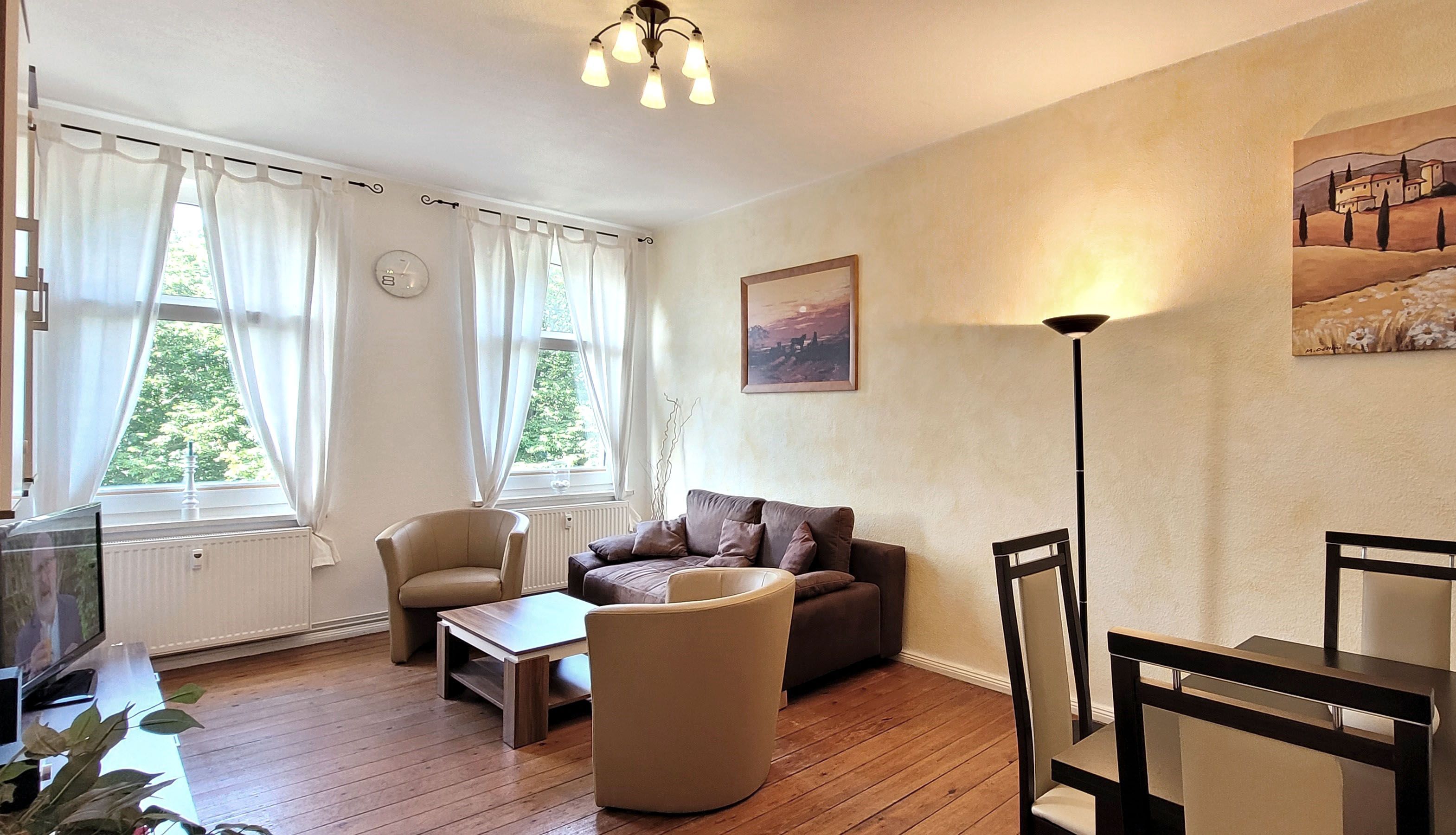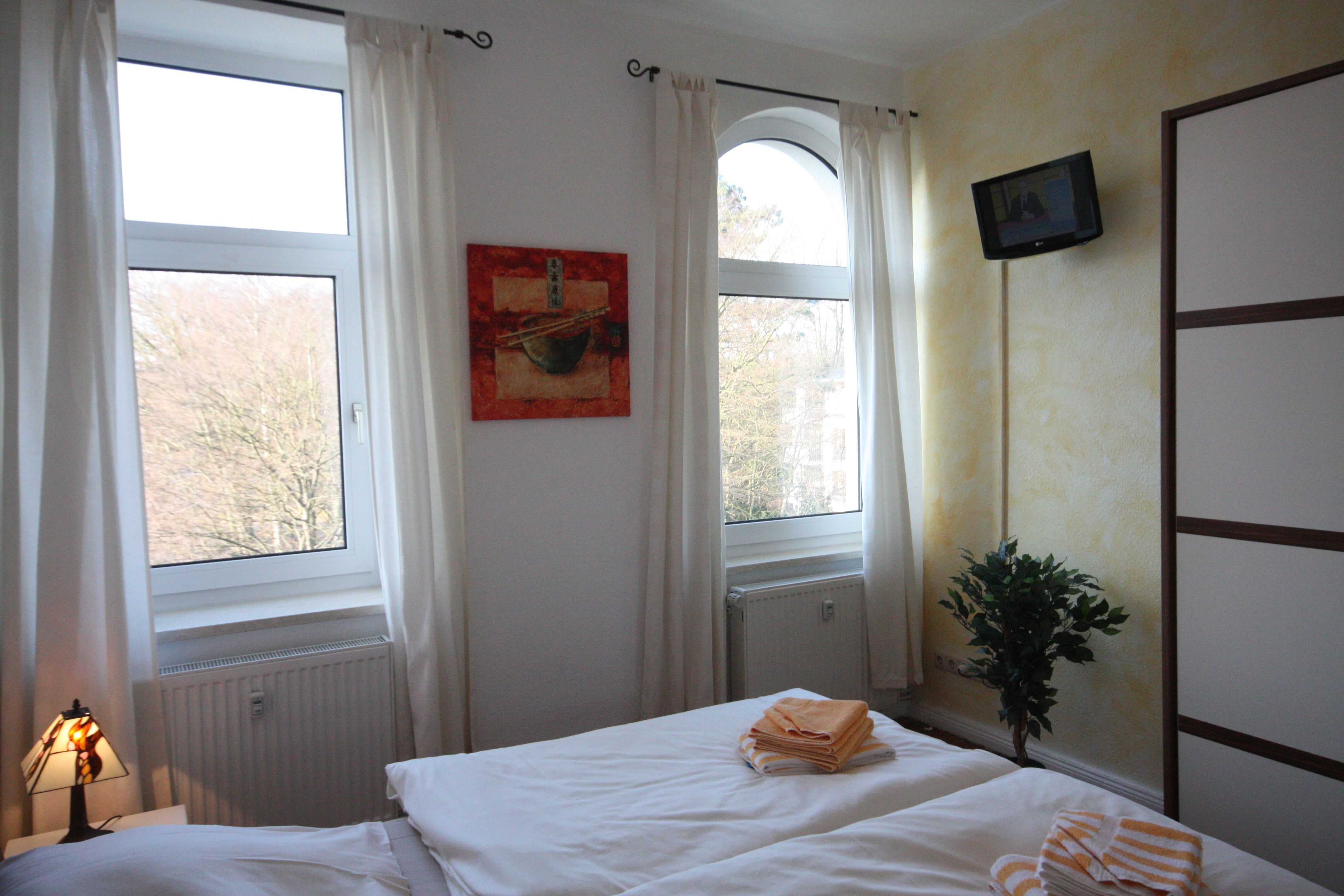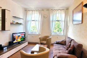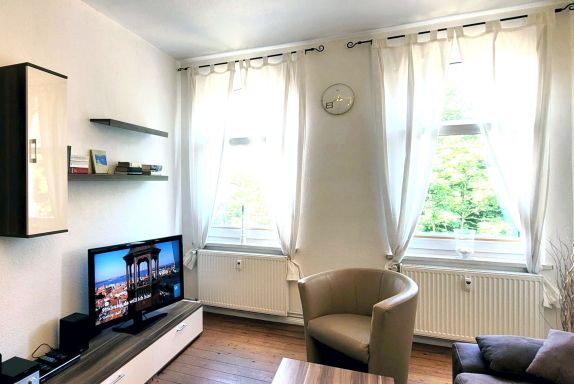 Modern eingerichtete Ferienwohnung für 2 Personen. Nach Absprache können 2 weitere Personen auf dem Schlafsofa im Wohnzimmer übernachten. Im Wohnzimmer befinden sich ebenfalls eine gemütliche Sitzecke sowie ein Essbereich. Ihnen stehen ein 42 Flachbildfernseher im Wohnzimmer zur Verfügung und ein weiterer, etwas kleinerer Flatscreen im Schlafzimmer. Das Schlafzimmer ist zusätzlich mit Doppelbett und großem Schlafzimmerschrank ausgestattet.