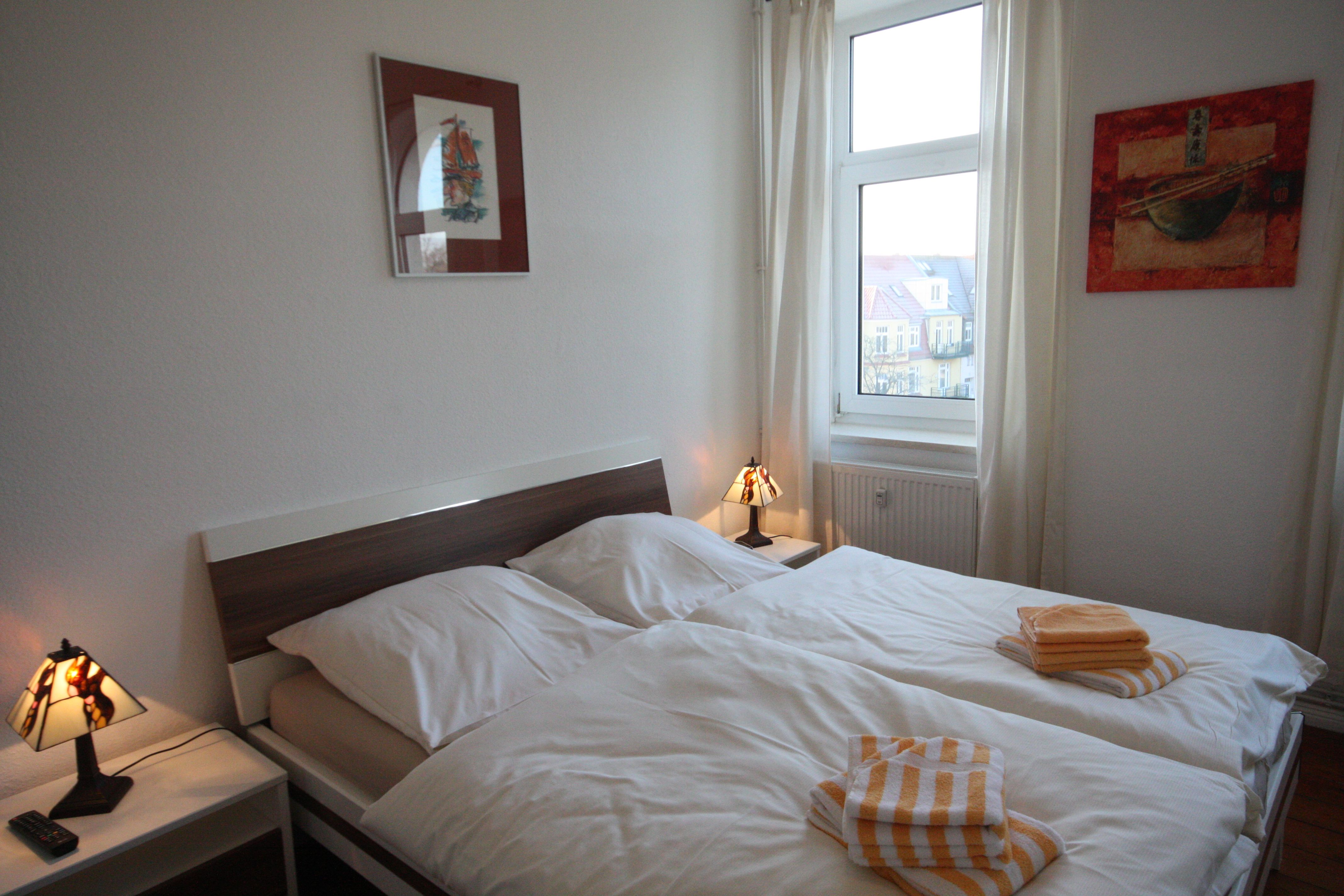 Helle Ferienwohnung für 2 Personen plus 2 Personen zusätzlich auf Anfrage (Schlafsofa). Die Ferienwohnung befindet sich in der 3. Etage einer alten Seebadvilla in Warnemünde und der lange weiße Ostseestrand ist nur 200 Meter entfernt.