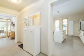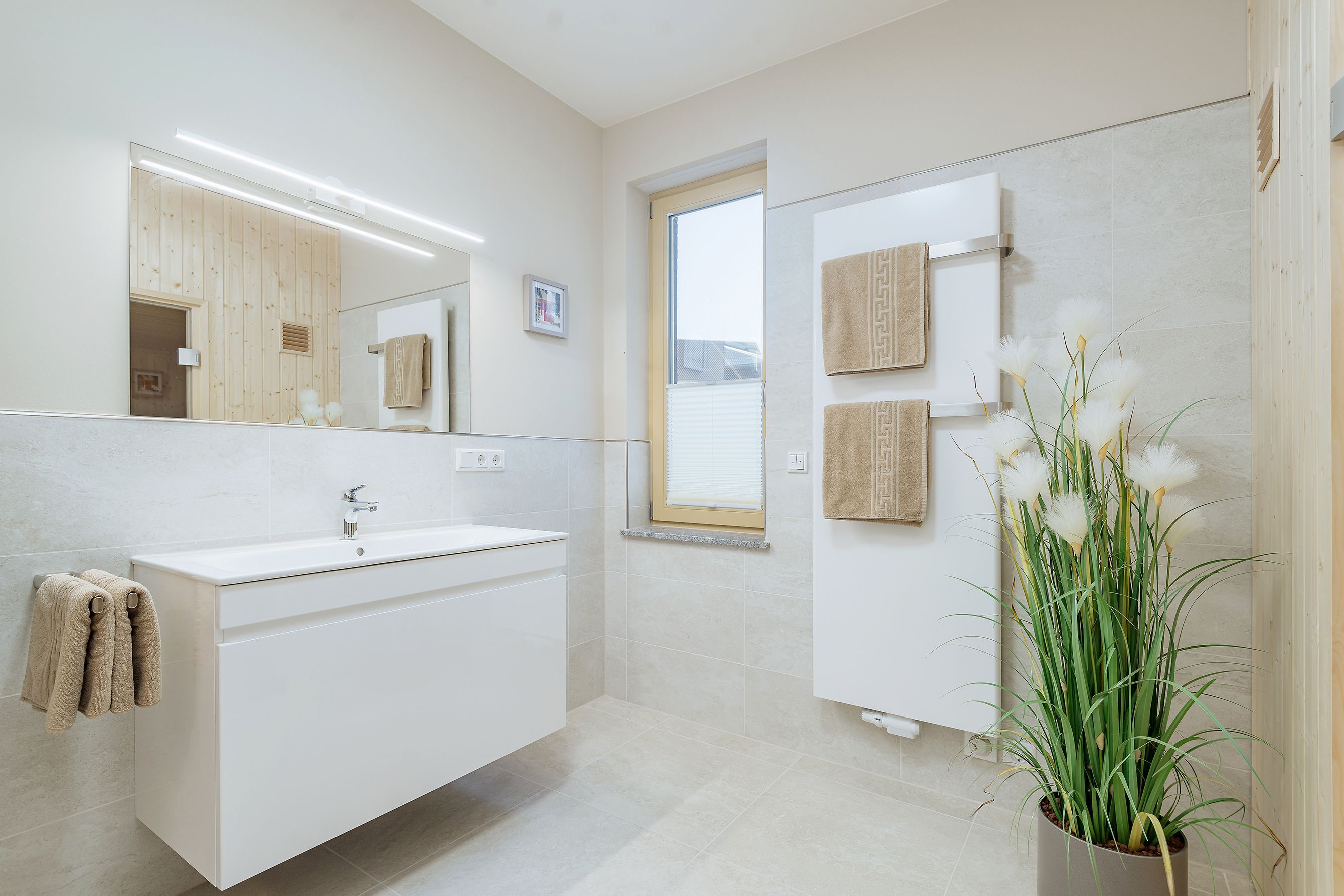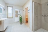 • Tageslichtbad mit elektr. Fußbodenheizung, ebenerdiger Dusche, großer Waschtisch, Handtuchheizkörper und Sauna