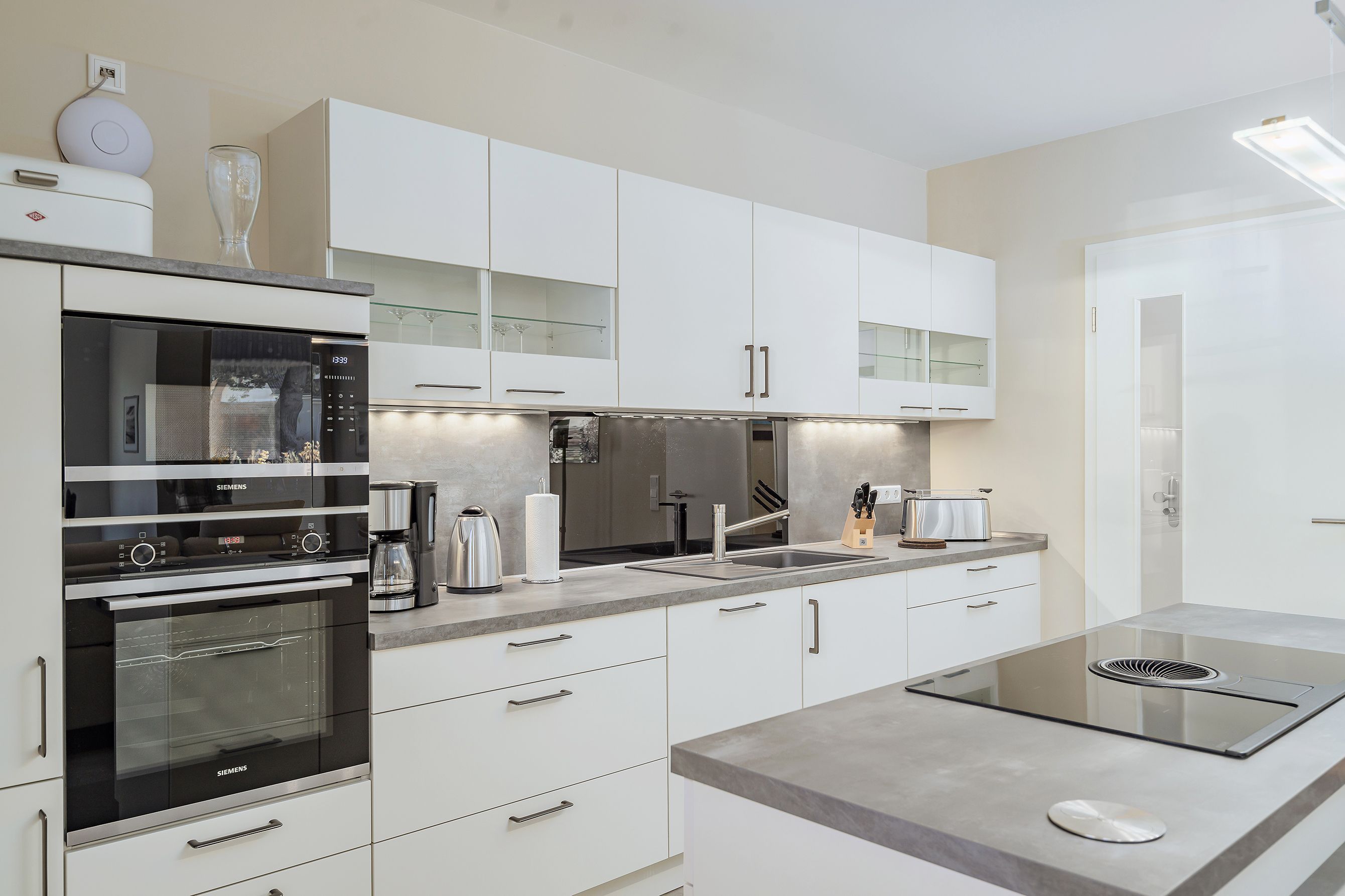 • Einbauküche mit Kücheninsel + Induktionskochfeld, Backofen, Geschirrspüler, Kühl-/Gefrierkombination, Wasserkocher, Toaster, Kaffeemaschine, Kochutensilien von Zwilling, Mikrowelle