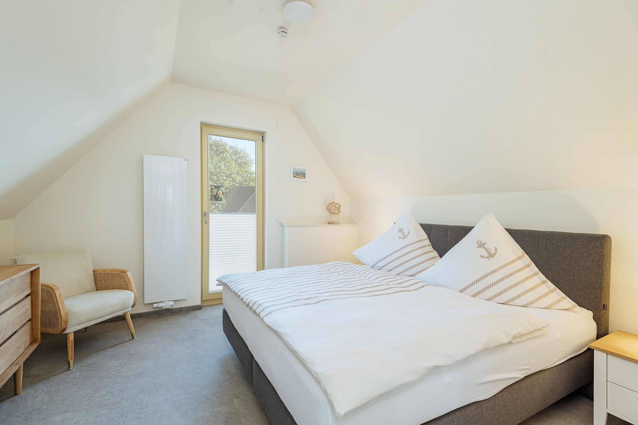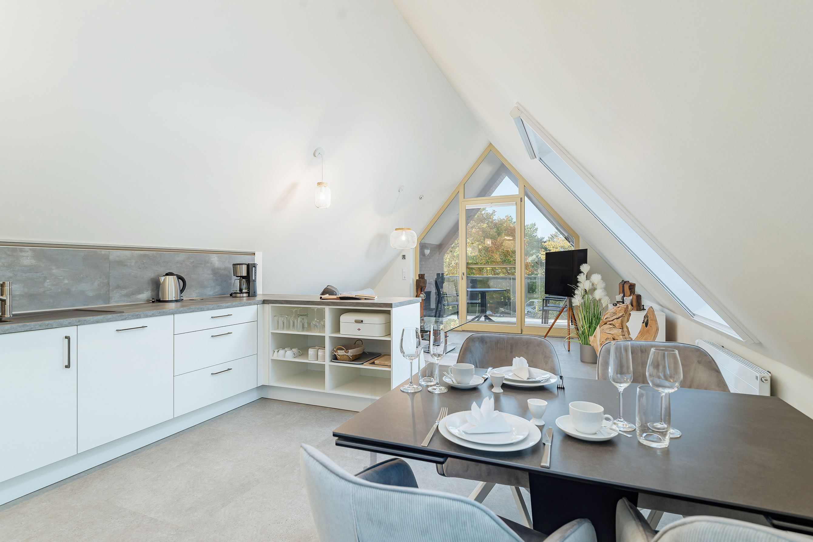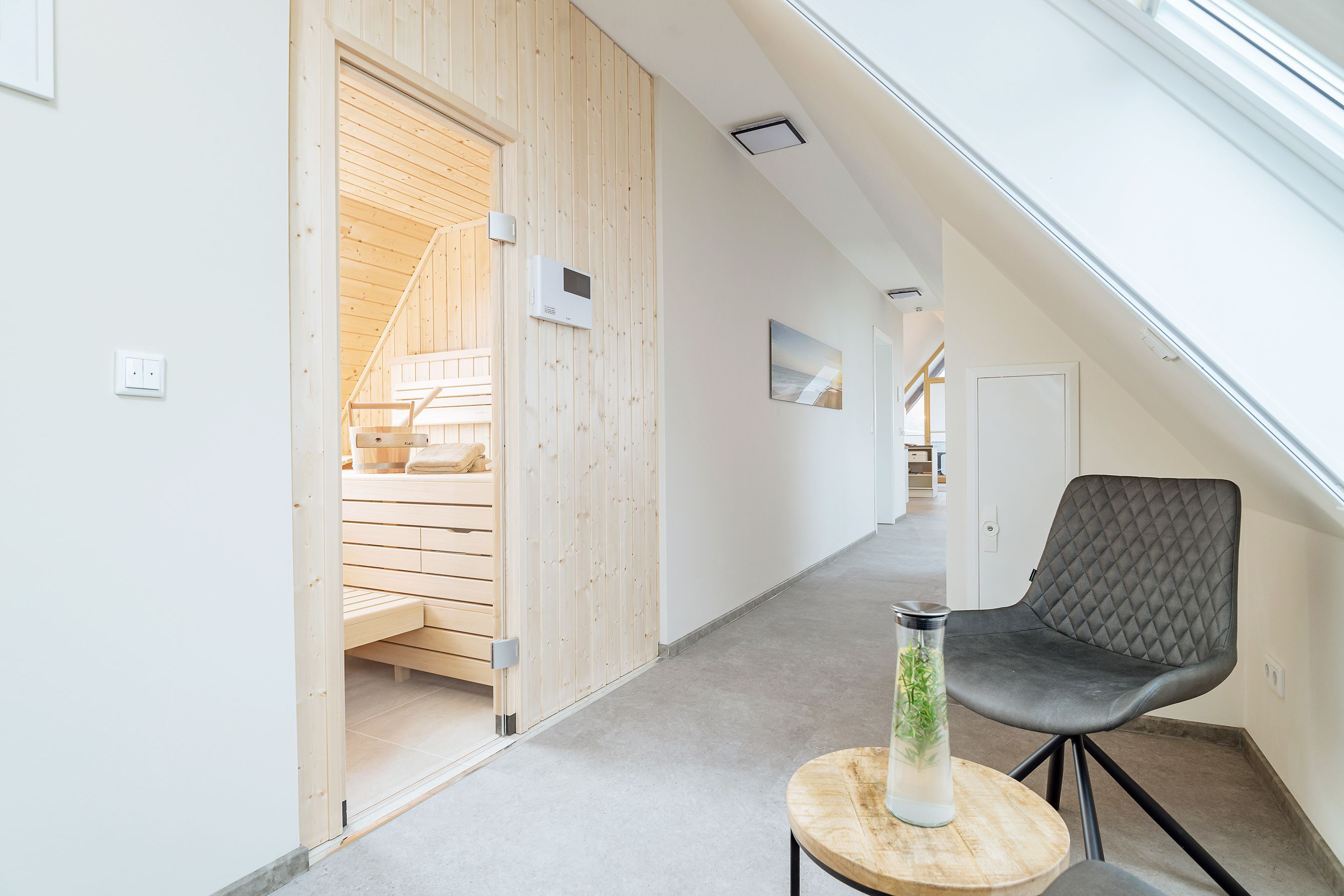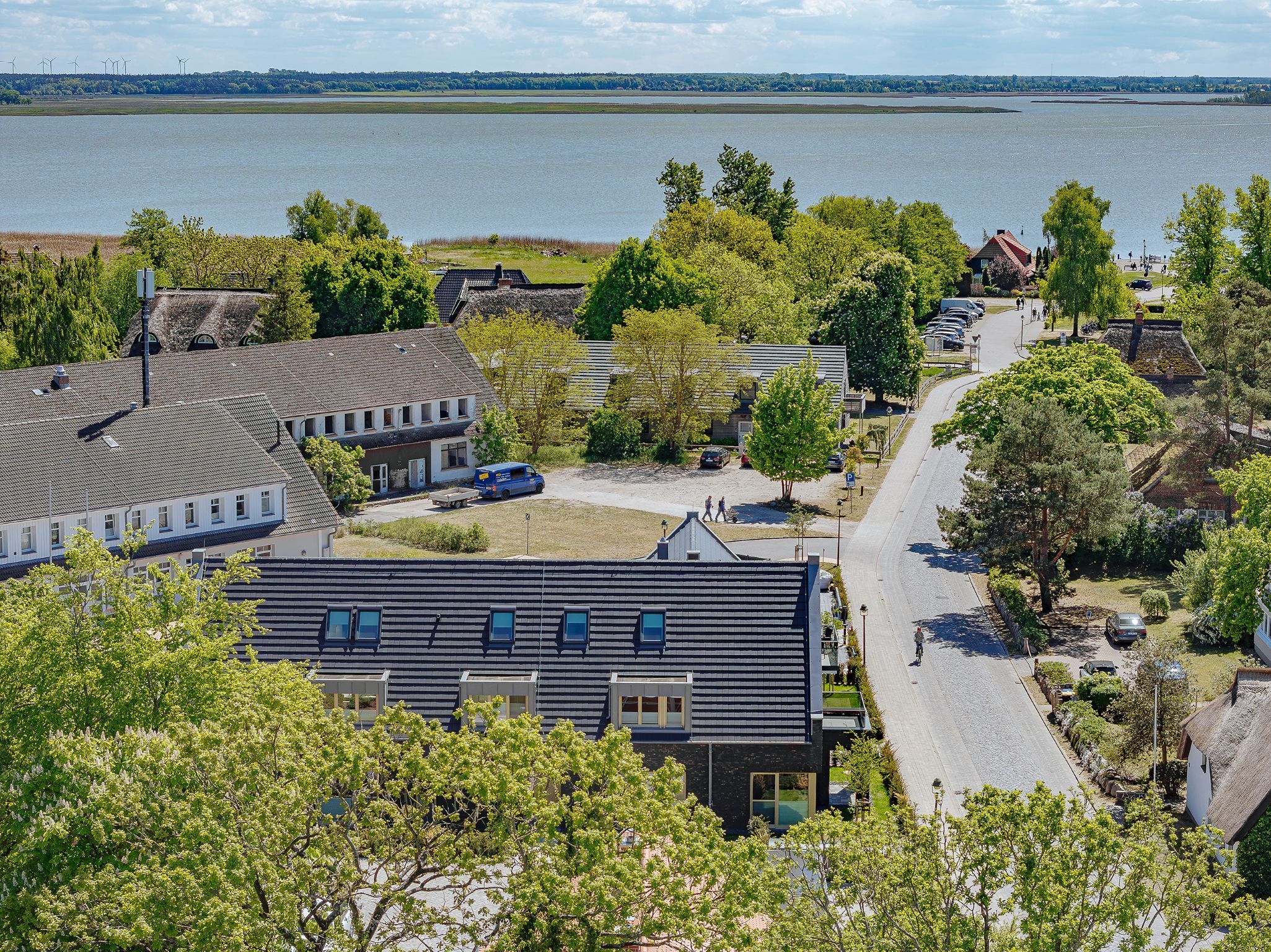 Der Boddenschnacker liegt im Dachgeschoß eines neugebauten Areals. Die Wohnung mit ihren 83 m² ist geeignet für max. 2 Pers. Das Schlafzimmer ist mit einem bequemen Boxspringbett in der Größe 2,00 m x 1,80 m ausgestattet. Der offene Wohn-/Küchenbereich mit sich anschließendem Balkon in Westausrichtung ist hell und freundlich. Das Tageslichtbad ist versehen mit einem großen Waschtisch, einem Handtuchheizkörper, einer elektr. Fußbodenheizung und einer ebenerdigen Dusche. Die vorhandene Sauna besticht durch Ihren Blick Richtung Bodden.