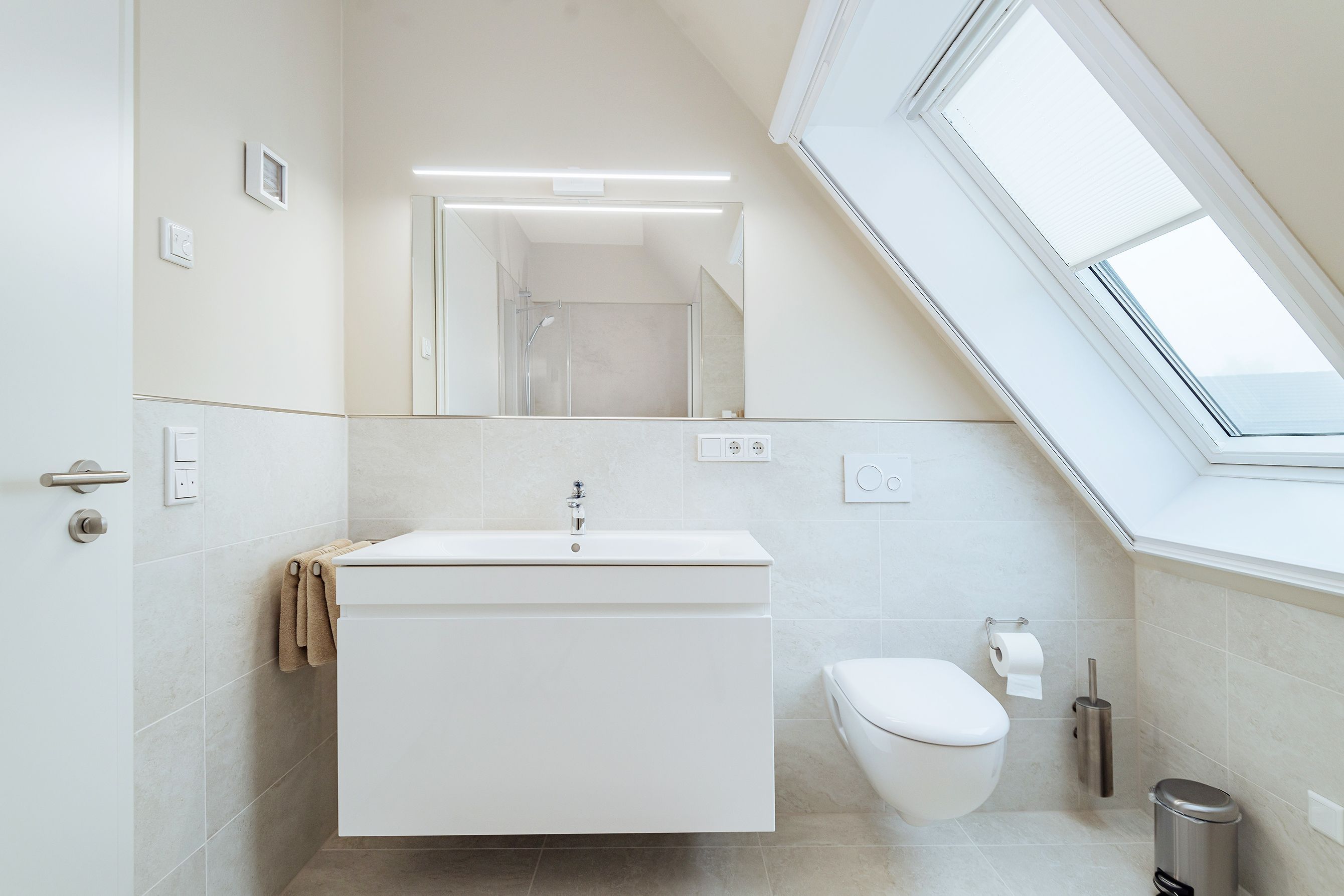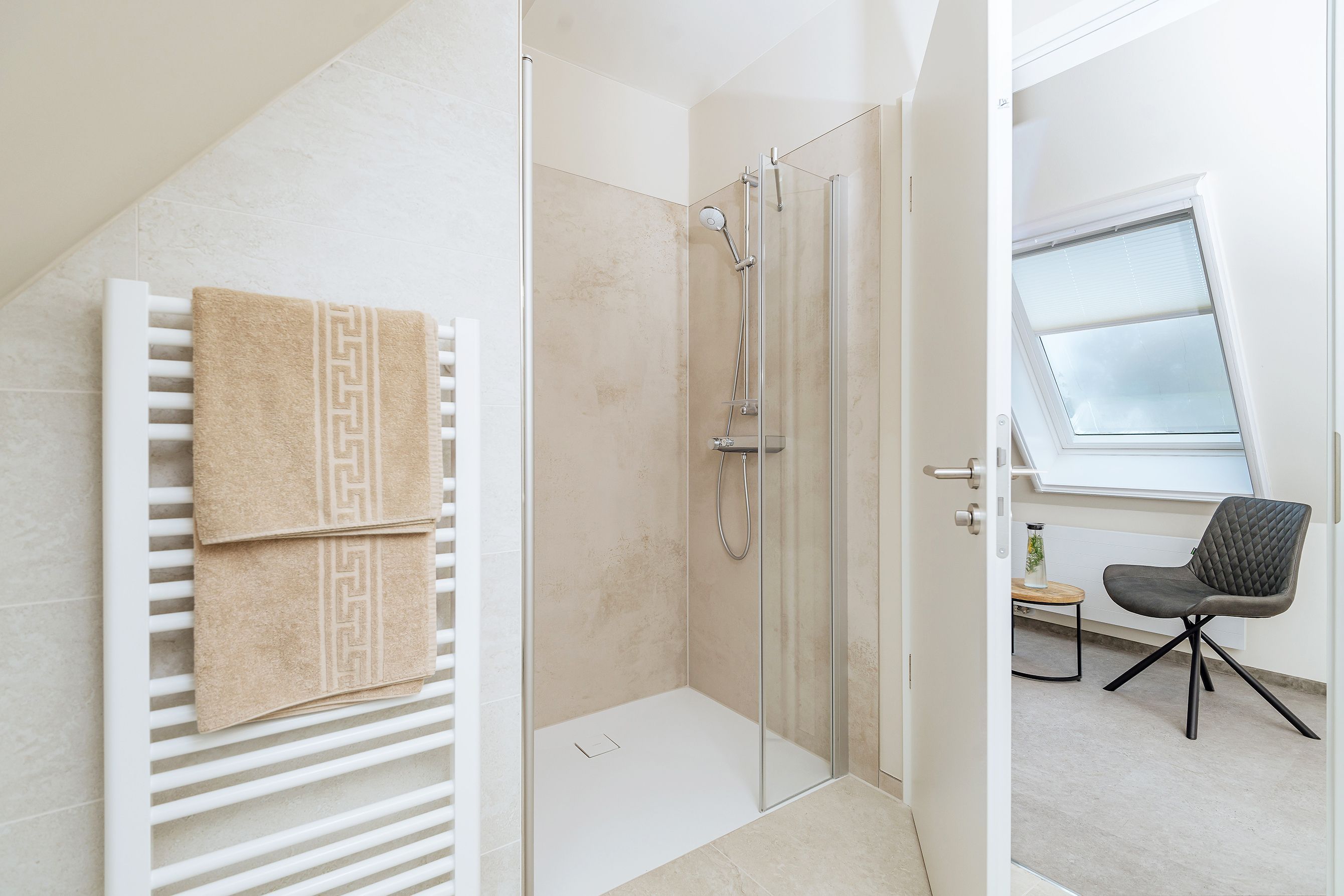 • Bad mit elektr. Fußbodenheizung, ebenerdiger Dusche, großer Waschtisch
