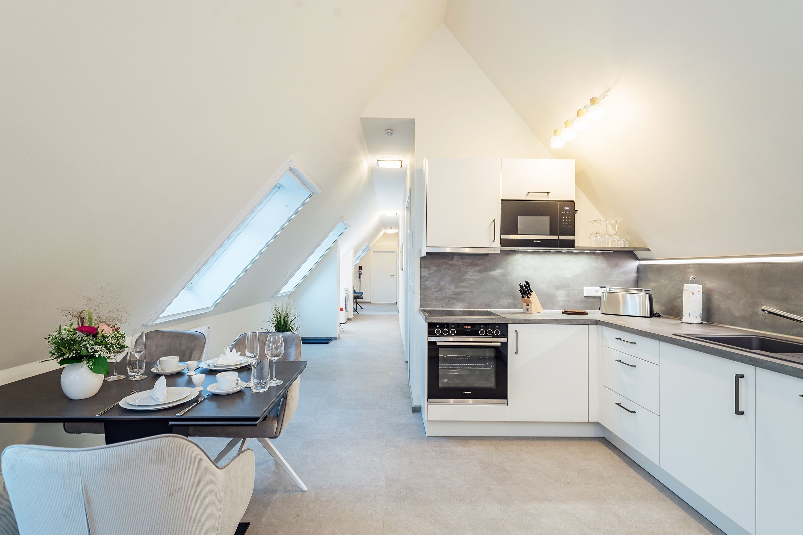 • Einbauküche mit Ceranfeld, Backofen, Geschirrspüler, Kühlschrank mit Gefrierfach, Wasserkocher, Toaster, Kaffeemaschine, Kochutensilien von Zwilling, Mikrowelle