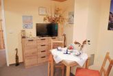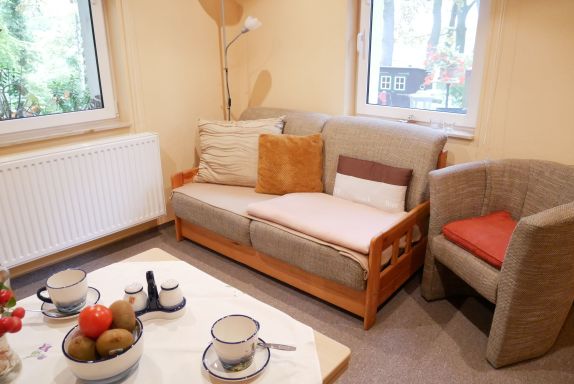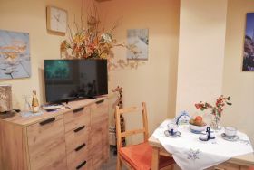 Die gemütliche und modern eingerichtete Ferienwohnung befindet sich im Erdgeschoss. Sie verfügt über ein Schlafzimmer mit 2 getrennten Boxspringbetten und einem Kleiderschrank. Im Wohnzimmer gibt es eine Couch (ausziehbar 140 x 200) mit Tisch, TV, Radio mit CD-Player und einen Essplatz mit 2 Stühlen. Im Dielenbereich befindet sich ein Pantry-Küche mit 2 Platten Herd und Kühlschrank mit Gefrierfach, sowie ein Minibackofen. Ein großes Tageslichtbad mit Dusche/WC und Fön. Eine Sitzecke im Garten, neben der Ferienwohnung lädt zum Verweilen ein. Ein Parkplatz steht kostenfrei auf dem Grundstück zur Verfügung. Nebenkosten inklusive. Bettwäsche kann mitgebracht werden oder gegen Gebühr dazugebucht werden. Bei Anreise liegt eine Erstausstattung Seife, Toilettenpapier, Spülmittel und ein Geschirrhandtuch für Sie bereit.