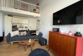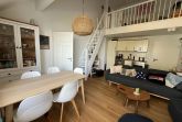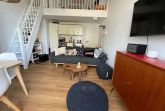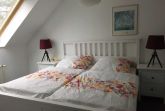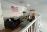 Offene Galerie vom Wohnraum über eine Treppe ins Dachgeschoss (leichte Dachschrägen) mit kleiner Sitzgruppe