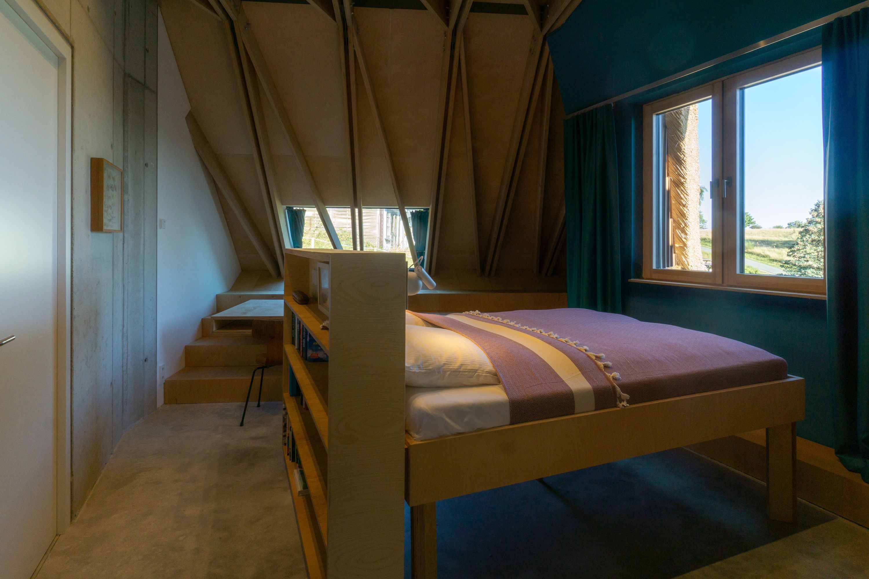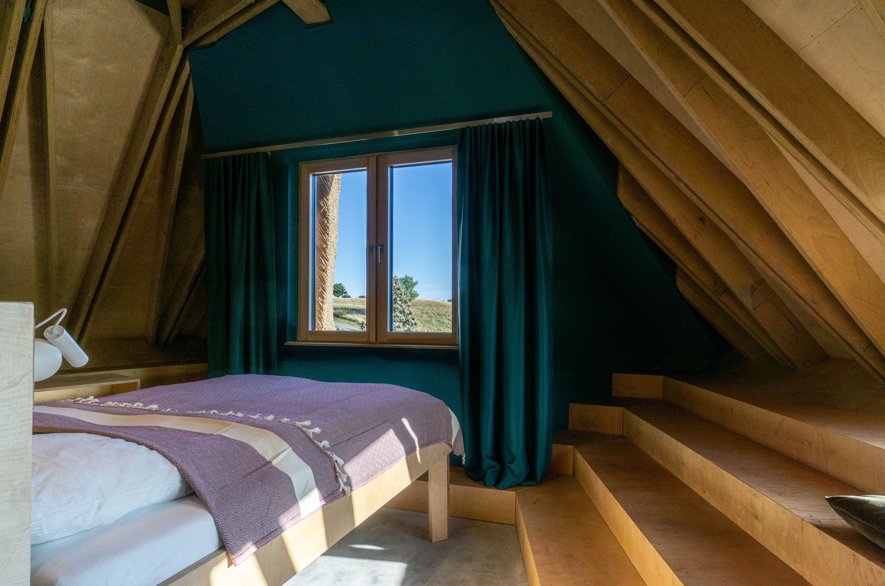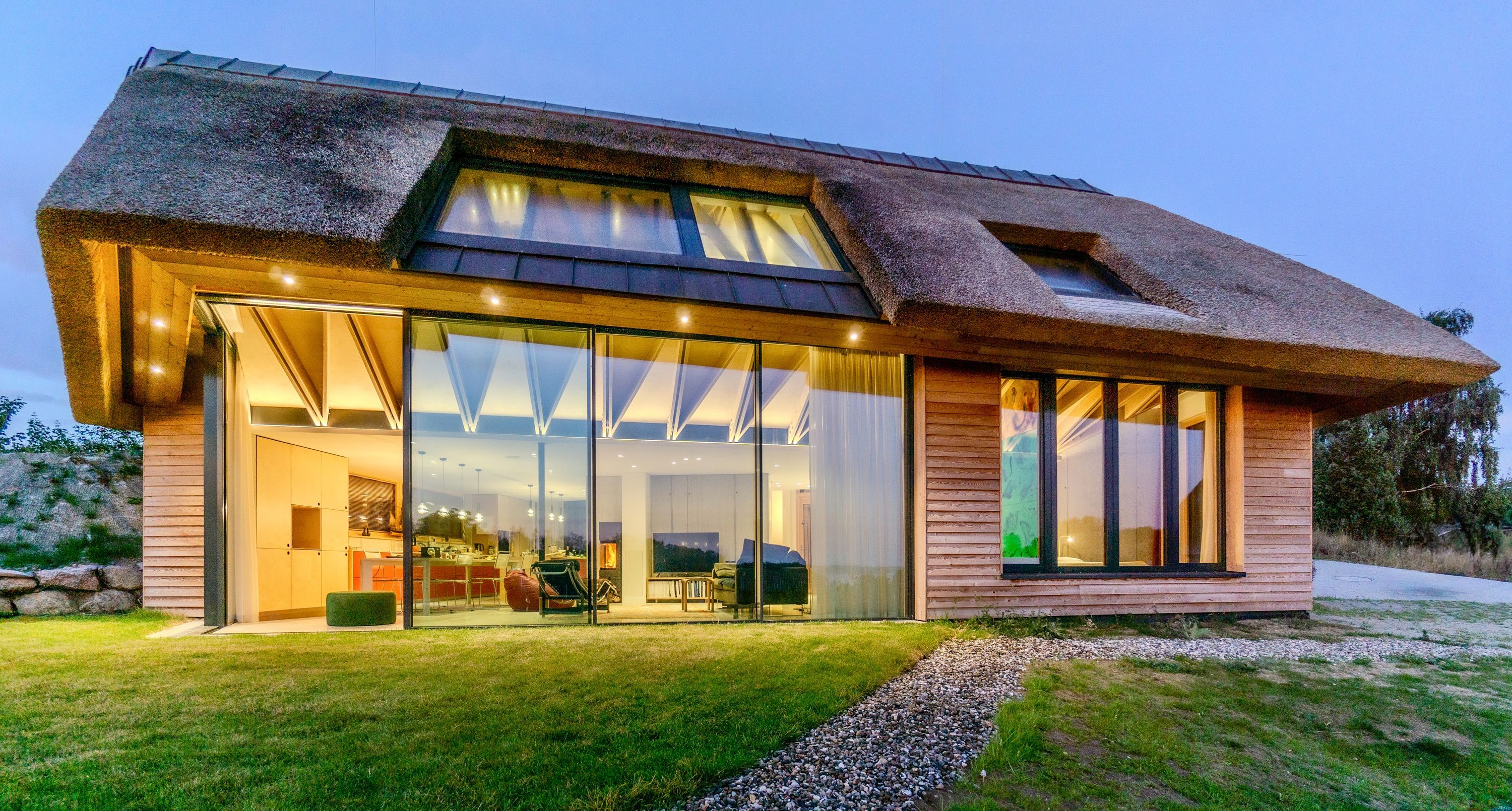 Die hölzerne Konstruktion, inspiriert von der Tradition, alte Boote durch Umdrehen in Behausungen zu verwandeln, integriert die Wohnräume direkt in die umgebende Landschaft. Der Boden des Erdgeschosses geht fließend in den Garten über, getrennt nur durch große, über Eck laufende Schiebetüren, die den Innenraum mit der Natur verschmelzen lassen. Das traditionelle Reetdach und die begrünten Flächen des Daches fügen sich nahtlos in die natürliche Umgebung ein, während die verwendeten Materialien wie Holz, Glas, Beton und Kupfer zeitlose Eleganz ausstrahlen.