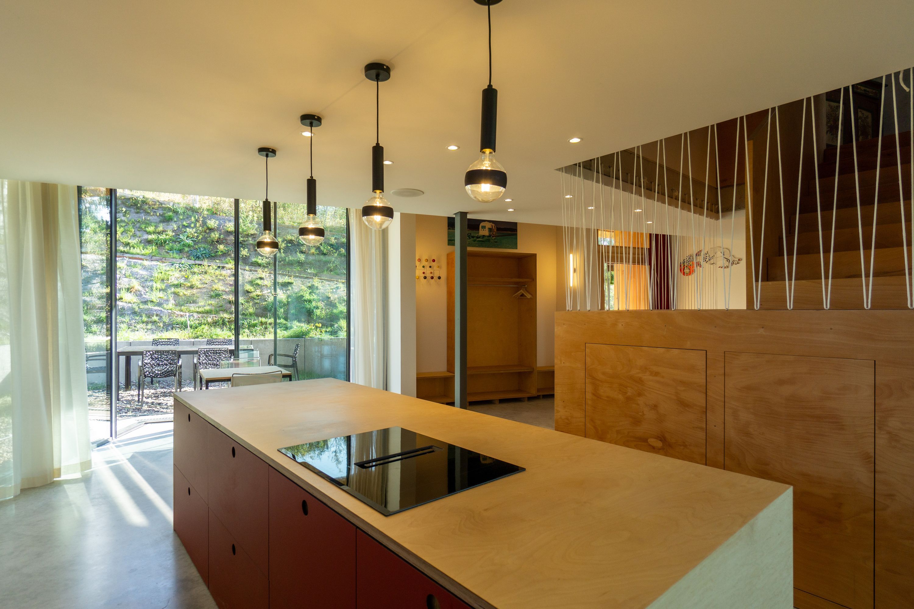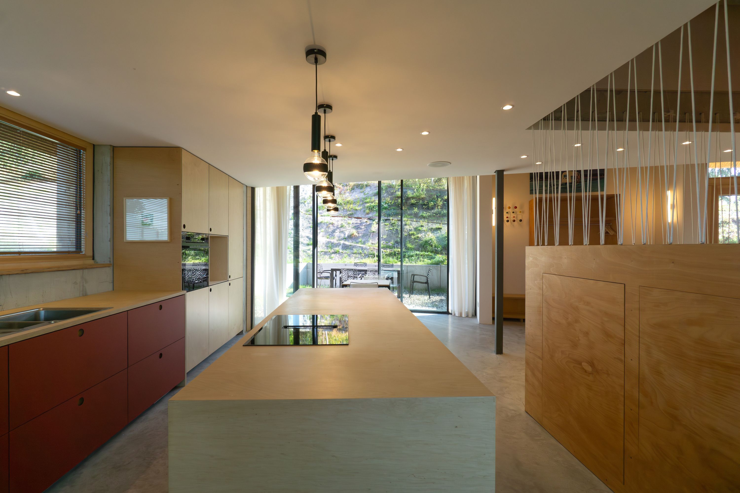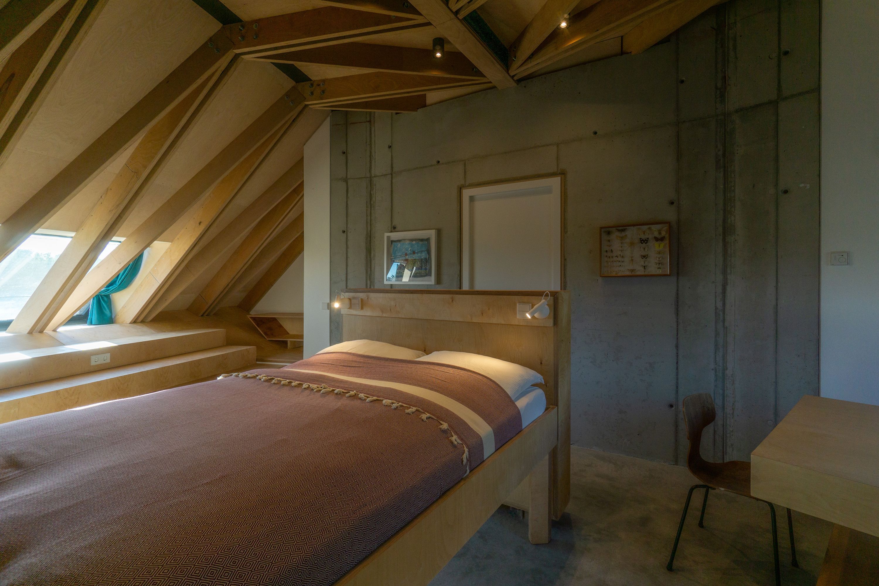Die hölzerne Konstruktion, inspiriert von der Tradition, alte Boote durch Umdrehen in Behausungen zu verwandeln, integriert die Wohnräume direkt in die umgebende Landschaft. Der Boden des Erdgeschosses geht fließend in den Garten über, getrennt nur durch große, über Eck laufende Schiebetüren, die den Innenraum mit der Natur verschmelzen lassen. Das traditionelle Reetdach und die begrünten Flächen des Daches fügen sich nahtlos in die natürliche Umgebung ein, während die verwendeten Materialien wie Holz, Glas, Beton und Kupfer zeitlose Eleganz ausstrahlen.