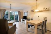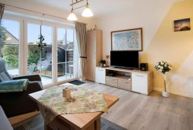 Das Besondere an dieser Unterkunft ist der private Außenbereich mit Garten, Gartenmöbeln, Strandkorb und überdachter Terrasse.