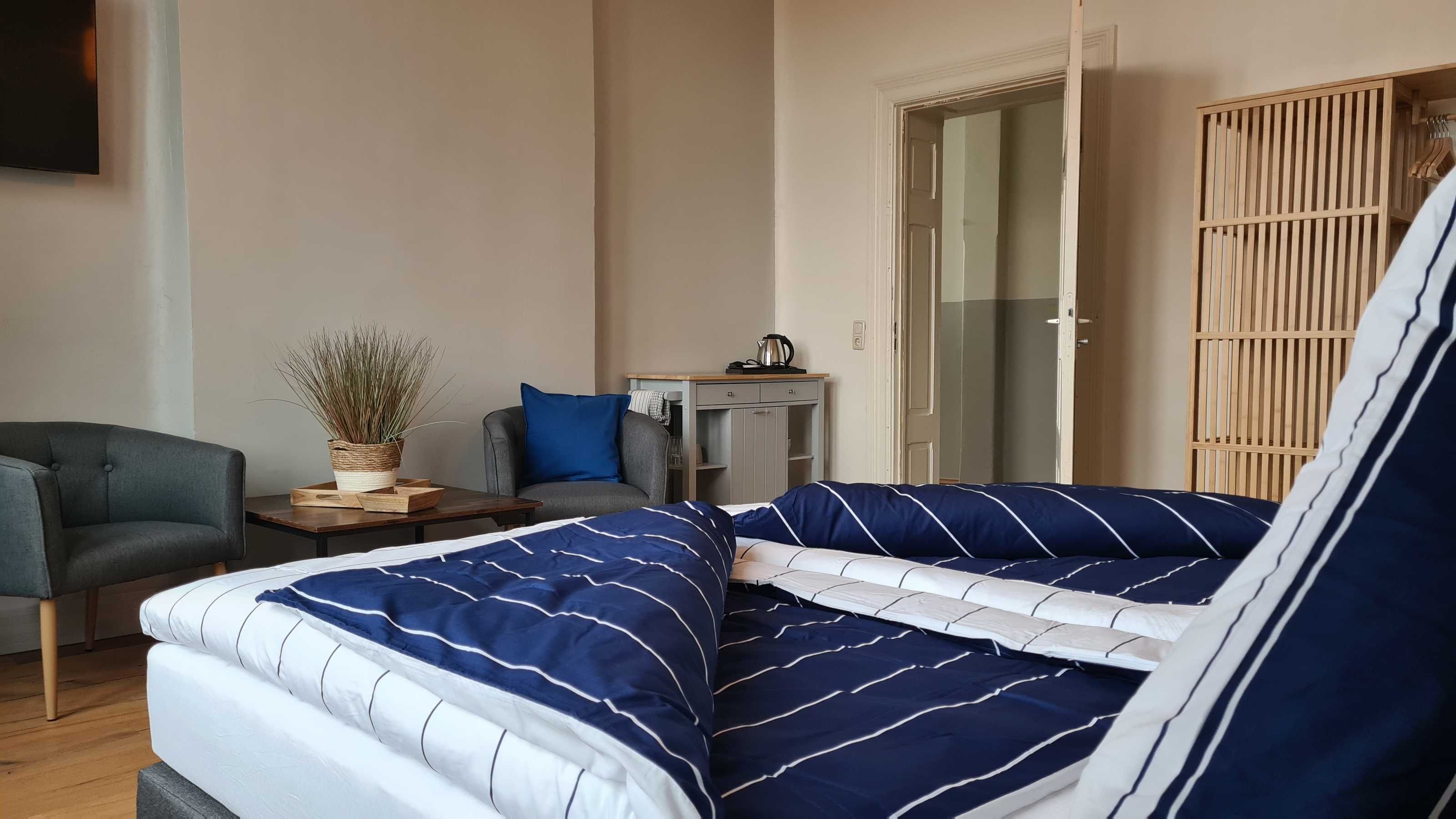 Alle Zimmer Nichtraucherzimmer mit Boxspringbett (Doppelbett), Flachbild-TV, Smart-TV, W-LAN, Bad mit Dusche oder Badewanne, WC. Minikühlschrank, Wasserkocher und Geschirr.
