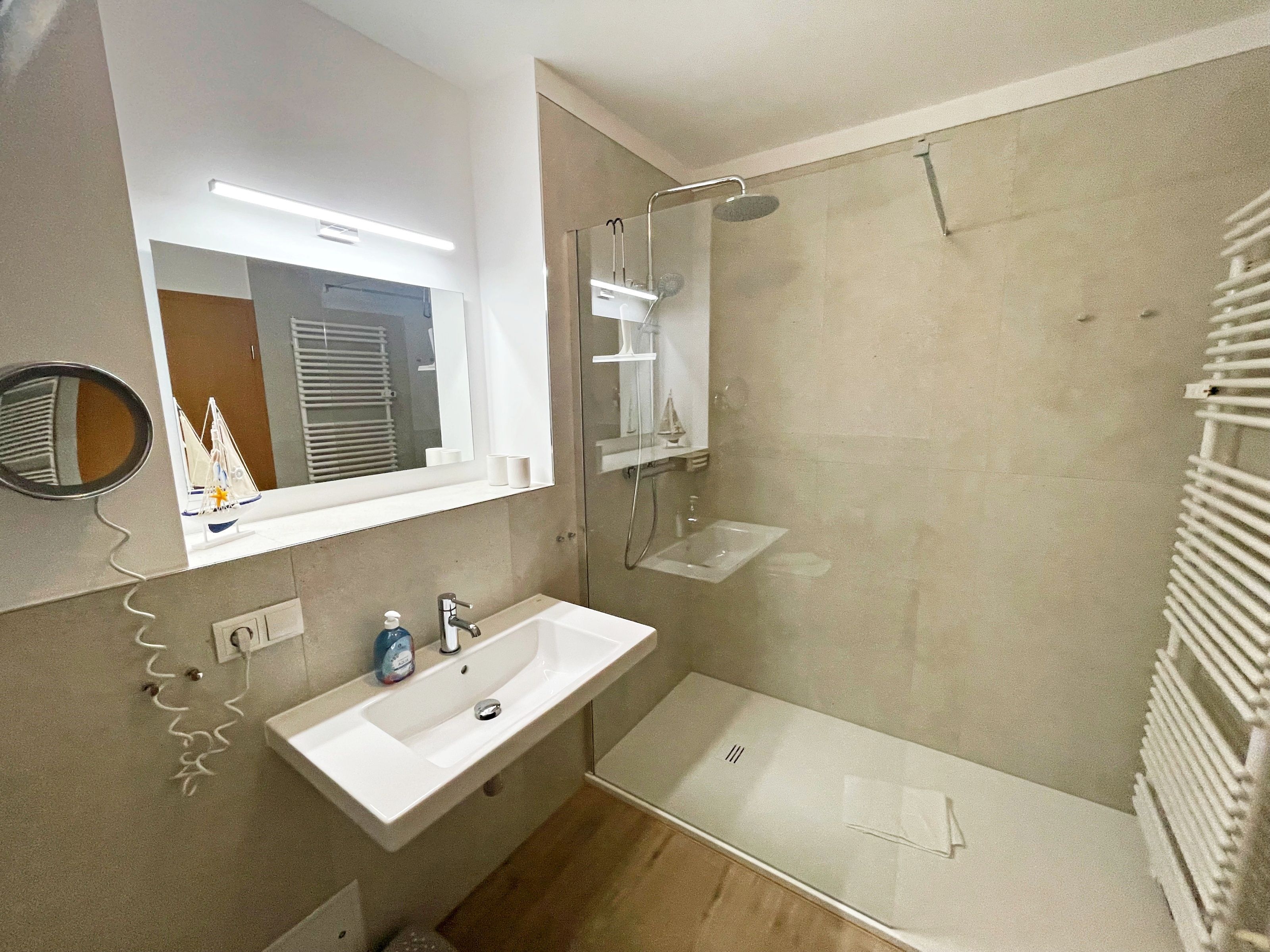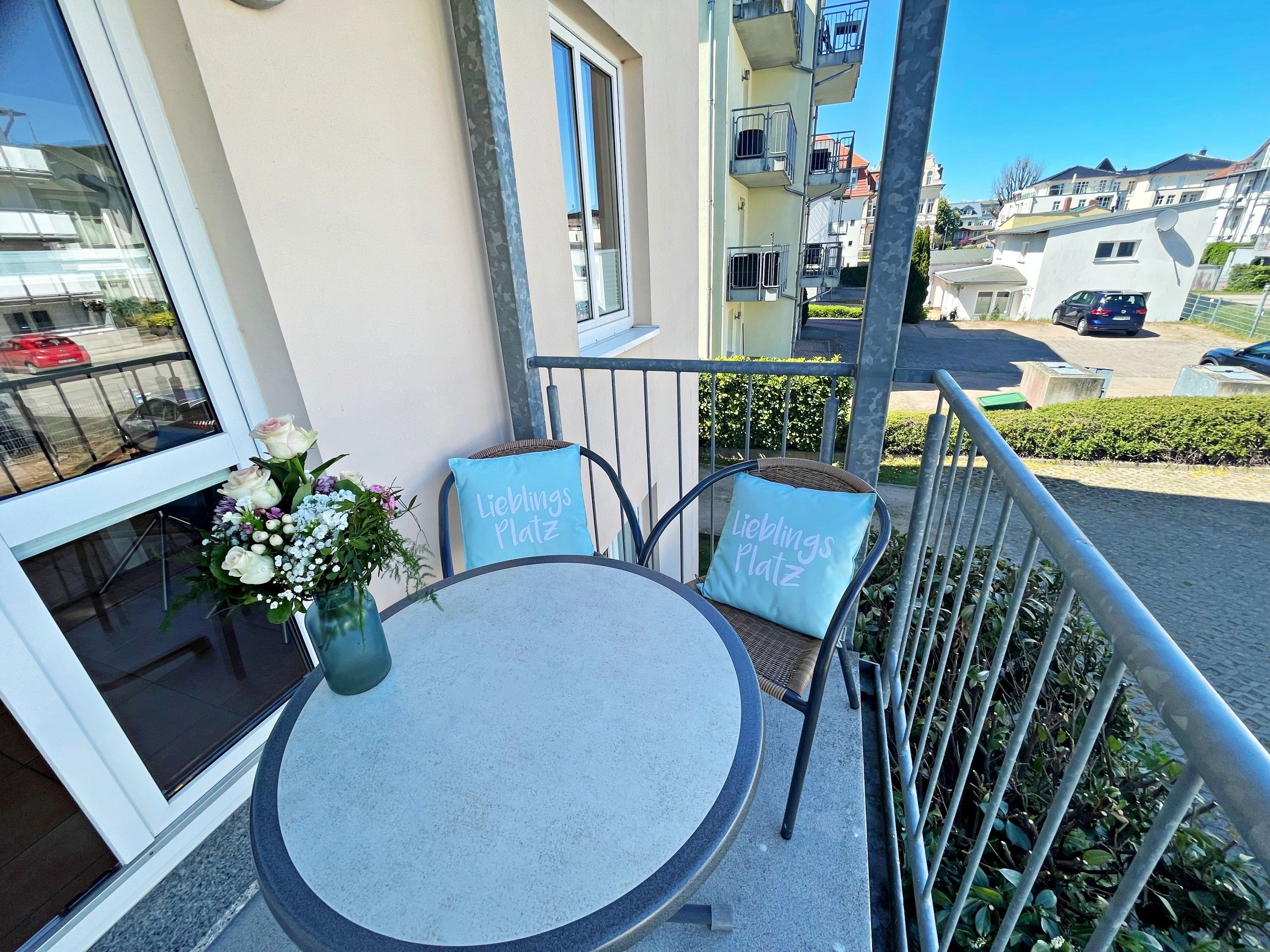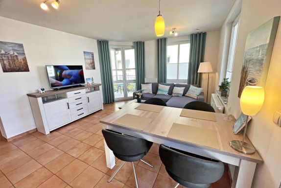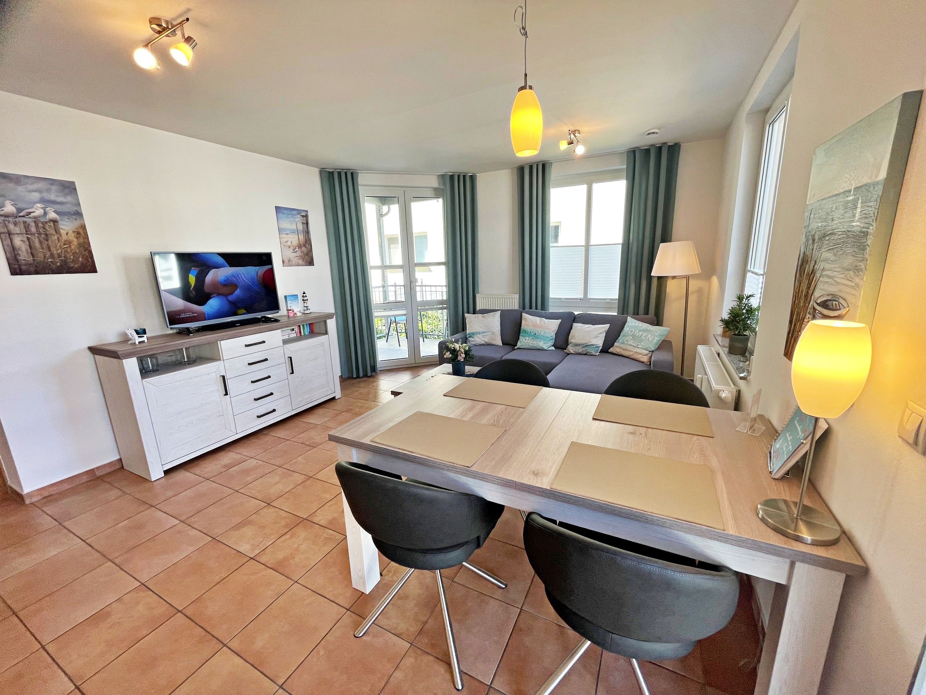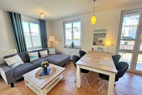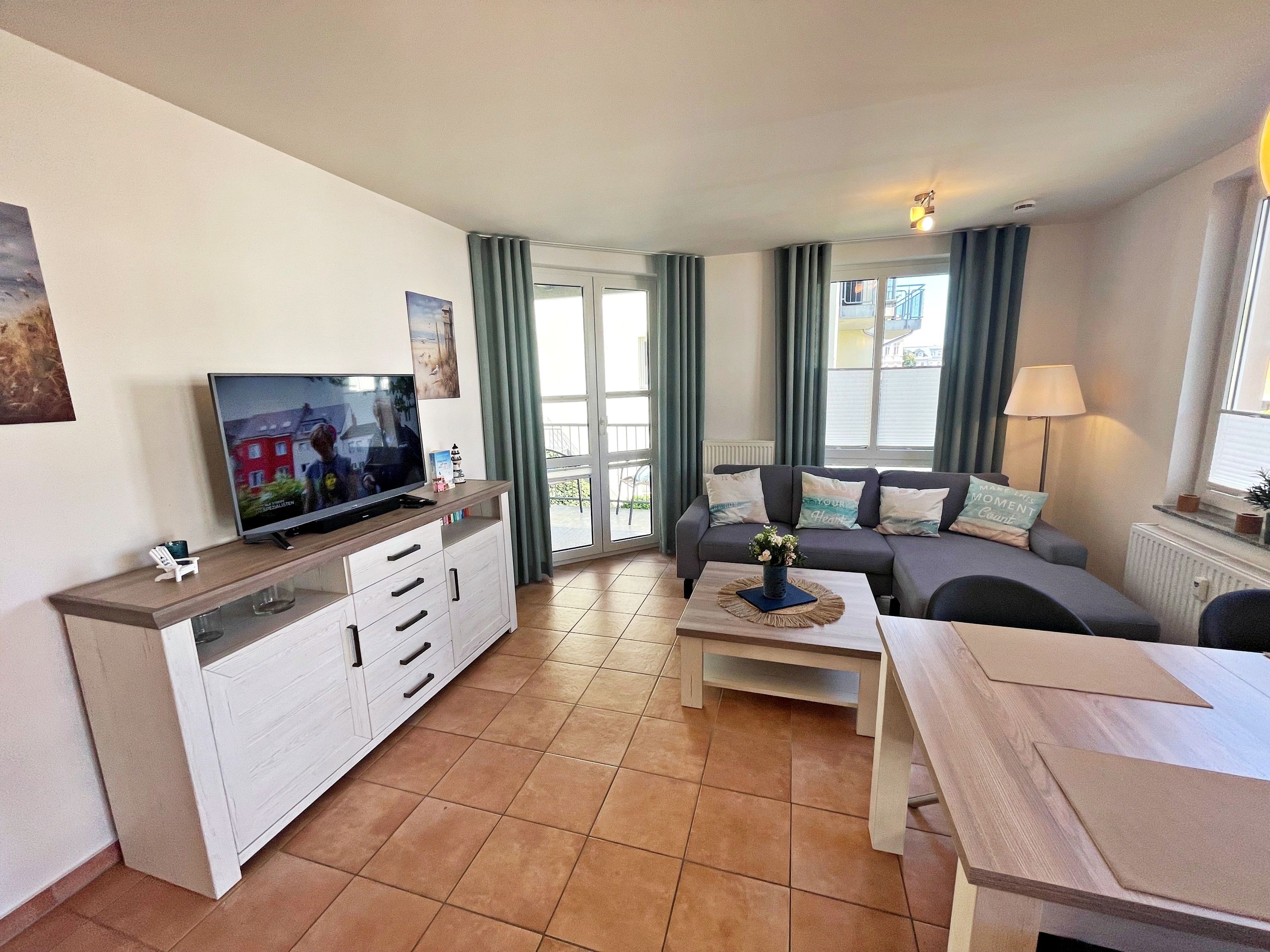 Diese helle und freundliche Ferienwohnung im Erdgeschoss des Neubaus lädt Sie mit ihrem ansprechendem Ambiente zum Verweilen ein und bietet Ihnen ein schönes Zuhause auf Zeit. Auf 65 Quadratmetern finden bis zu vier Personen gemütlich Platz. Die Wohnung ist hochwertig eingerichtet und verfügt über einen stilvollen Wohnbereich mit einer bequemen Sitzgruppe und einem Flat-TV. Die komplett ausgestattete Küchenzeile lässt keine Wünsche offen. Entspannen Sie in einem der beiden Schlafzimmer: Das erste ist mit einem komfortablen Doppelbett (1,80 m x 2,00 m) und einem zusätzlichen Flat-TV ausgestattet, während das zweite Schlafzimmer mit zwei Einzelbetten ideal für Familie oder Freunde ist. Das moderne Bad bietet Ihnen eine ebenerdige Dusche und WC und zwei Balkone laden dazu ein, die frische Luft zu genießen. Wenn Sie mit kleinen Kindern reisen, stellen wir Ihnen gerne ein Kinderbett (ohne Wäsche) und einen Hochstuhl zur Verfügung. Ein PKW-Stellplatz ist ebenfalls für Sie reserviert. Bitte beachten Sie, dass die Parkmöglichkeiten bei größeren Fahrzeugen etwas eng ausfallen könnten. Selbstverständlich steht Ihnen kostenfreies WLAN zur Verfügung, damit Sie Ihre Urlaubserlebnisse mit Freunden oder Familie daheim teilen können.
