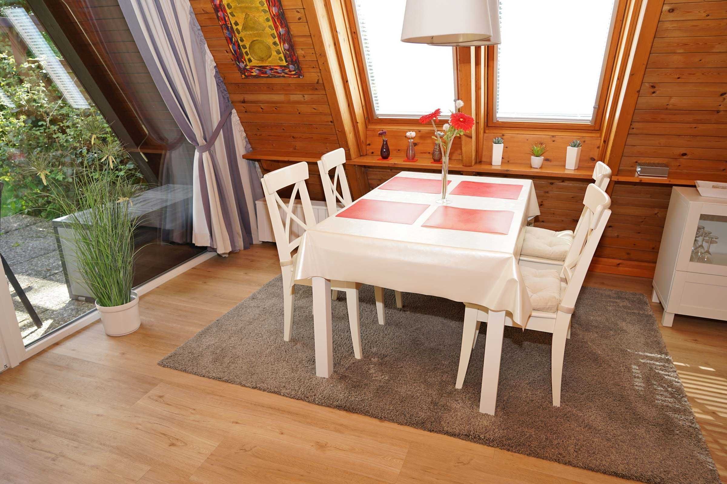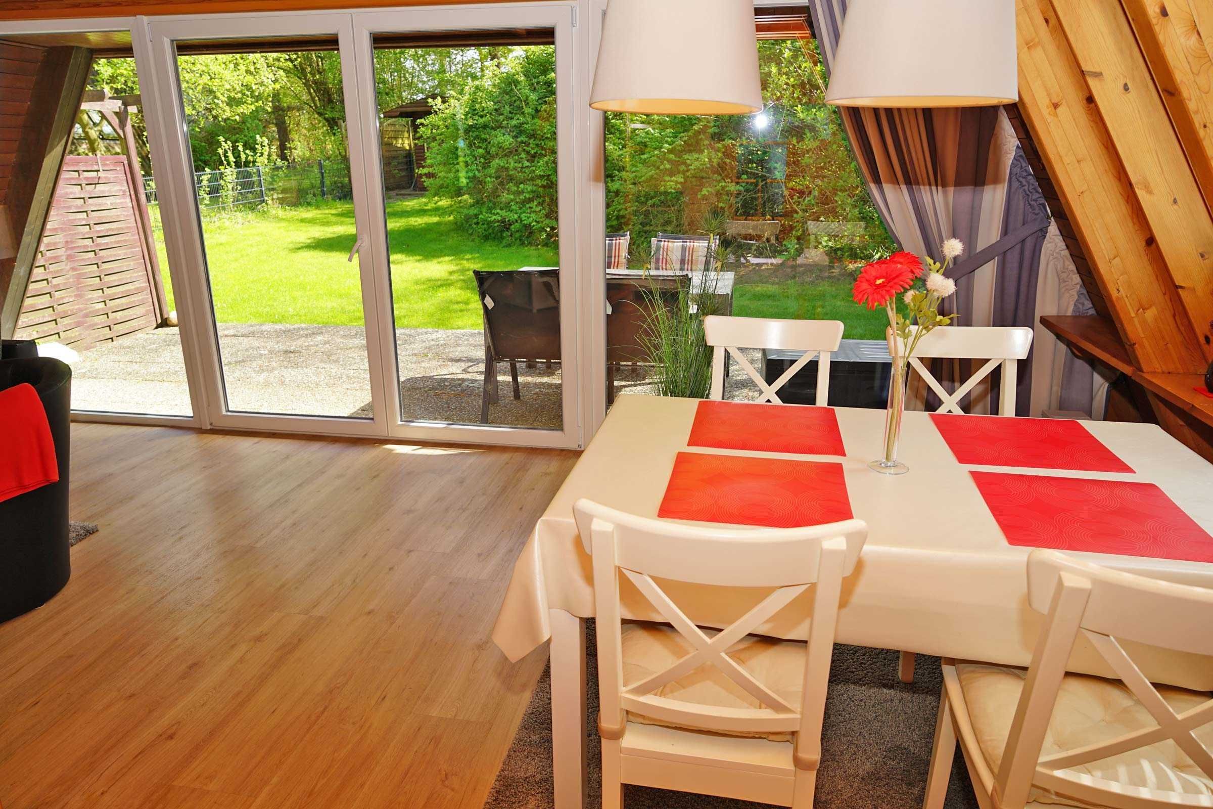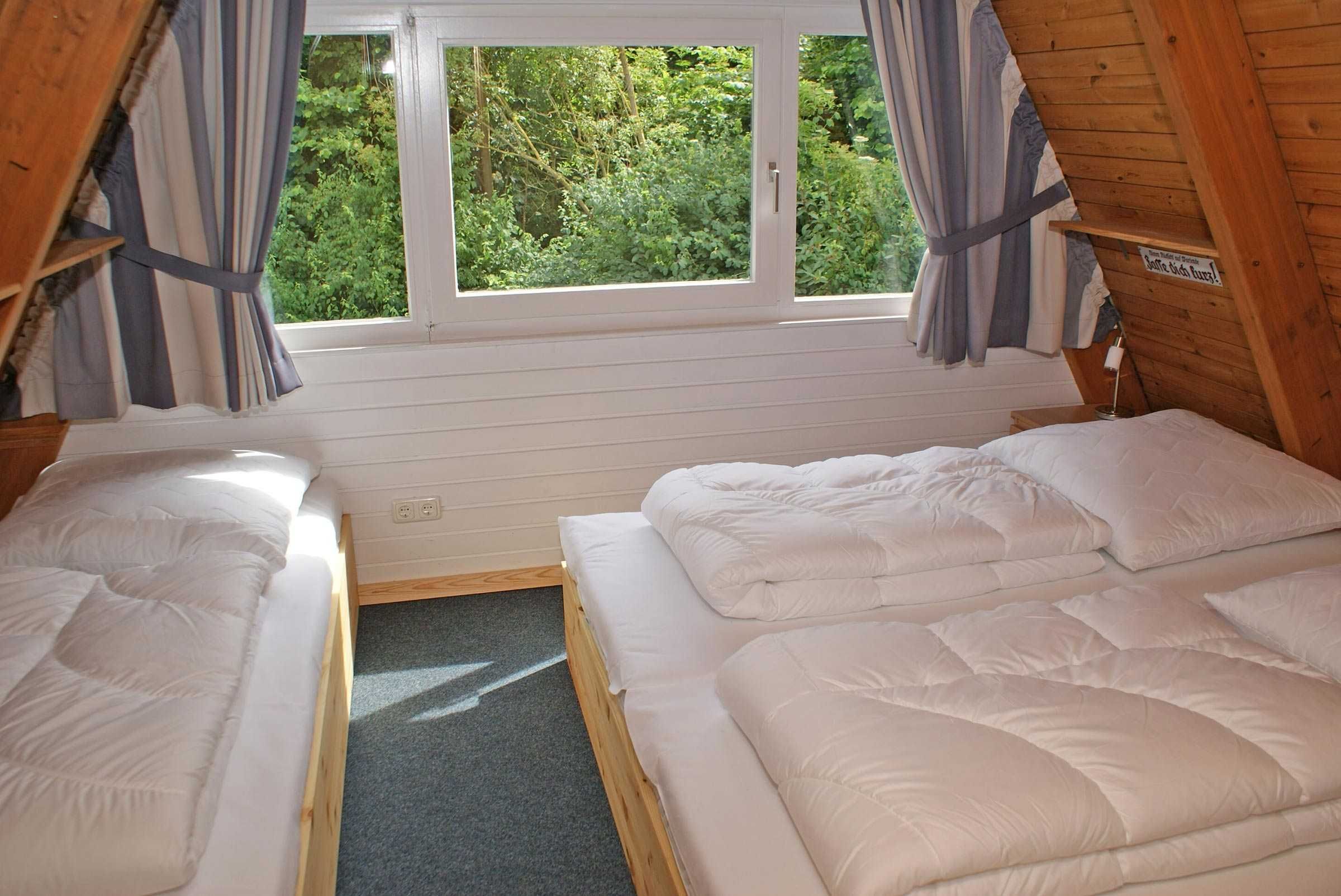 Unser Zeltdachhaus verfügt über zwei getrennte Schlafräume (im oberen Bereich des Hauses), kombiniertes Wohn- und Esszimmer, vollwertige Küche und Terrasse. Ein Kinderreisebett und Kinderhochstuhl sind immer vorhanden und kostenlos nutzbar. W-Lan kann für 1,00 Euro pro Tag gebucht werden.