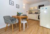 Der Essplatz, an dem die besten Urlaubsgerüchte ausgetauscht werden, bildet das Herzstück für gesellige Runden und ist zugleich das Bindeglied zur offenen Küchenzeile.