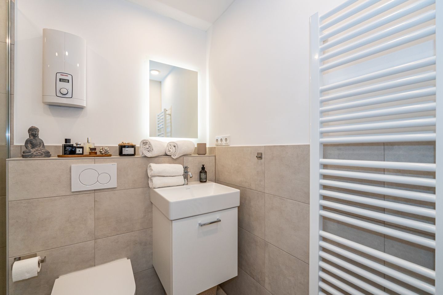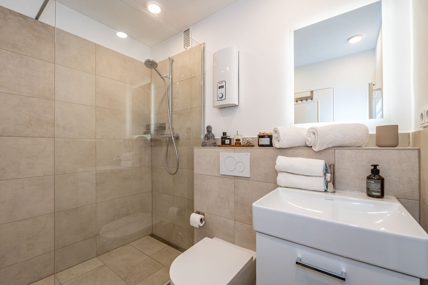 Das stilvolle und nagelneue Bad mit begehbarer Dusche und Regen-Handbrause, WC und Handtuchtrockner bietet einen Hauch von Wellness, während der Fön bereitsteht, um nach einem Strandtag für Frische zu sorgen.