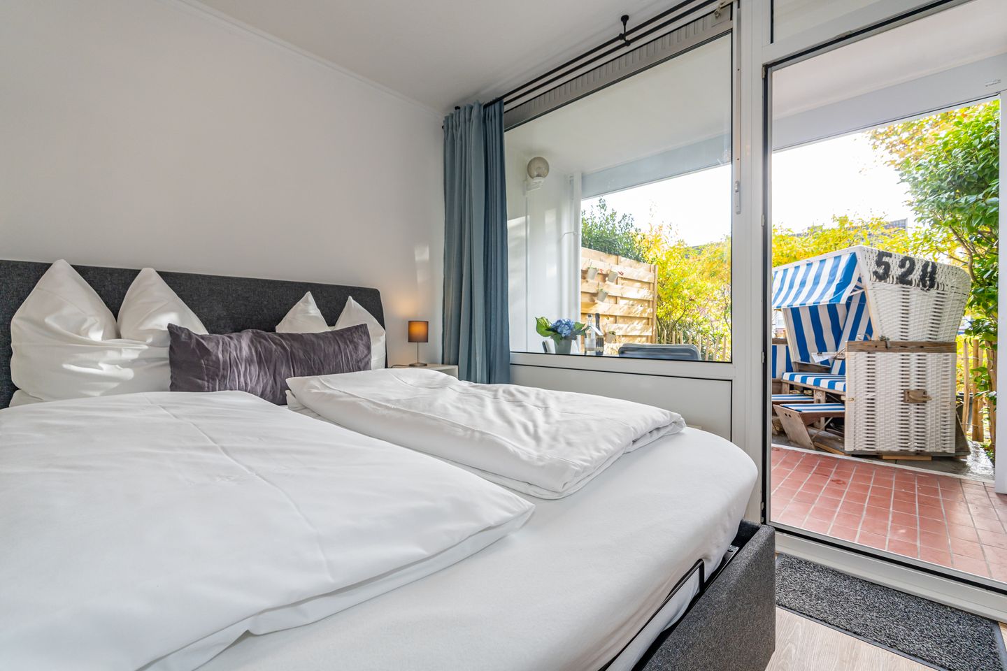 Der Kleiderschrank hat genügend Platz, auch für all Eure neuen Urlaubsmitbringsel, und die Terrasse erreicht Ihr auch direkt vom Schlafzimmer – für den perfekten Sonnenaufgang, sofern ihr die elektrische Rollade bereits habt hochlaufen lassen.