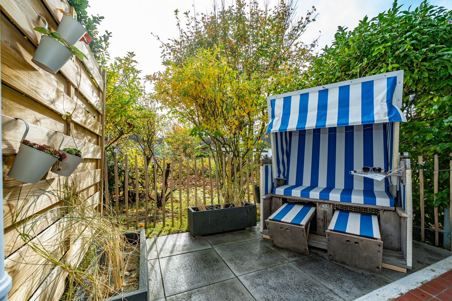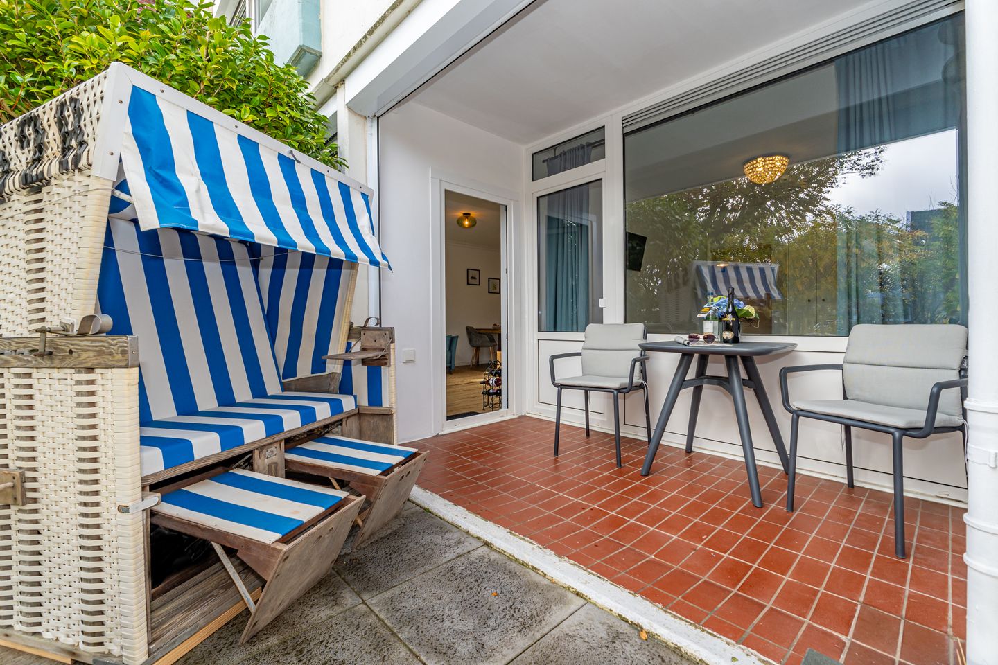 Genießt die teilüberdachte Terrasse mit einem Original Sylt-Strandkorb Nr. 528, ideal für ein Nickerchen. Zusätzlich steht ein Bistrotisch mit zwei Stühlen zur Verfügung, an dem Ihr gemütlich essen könnt.