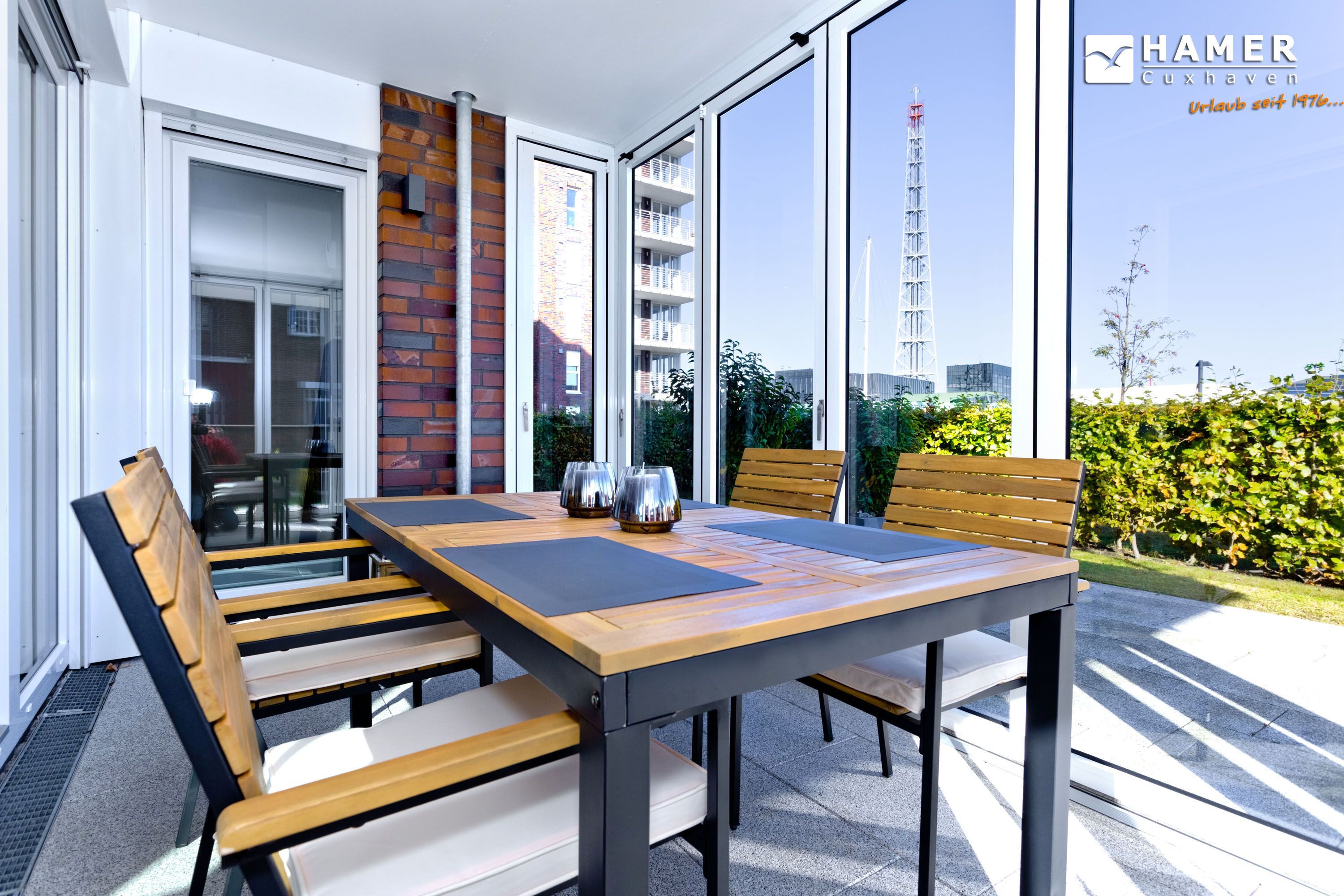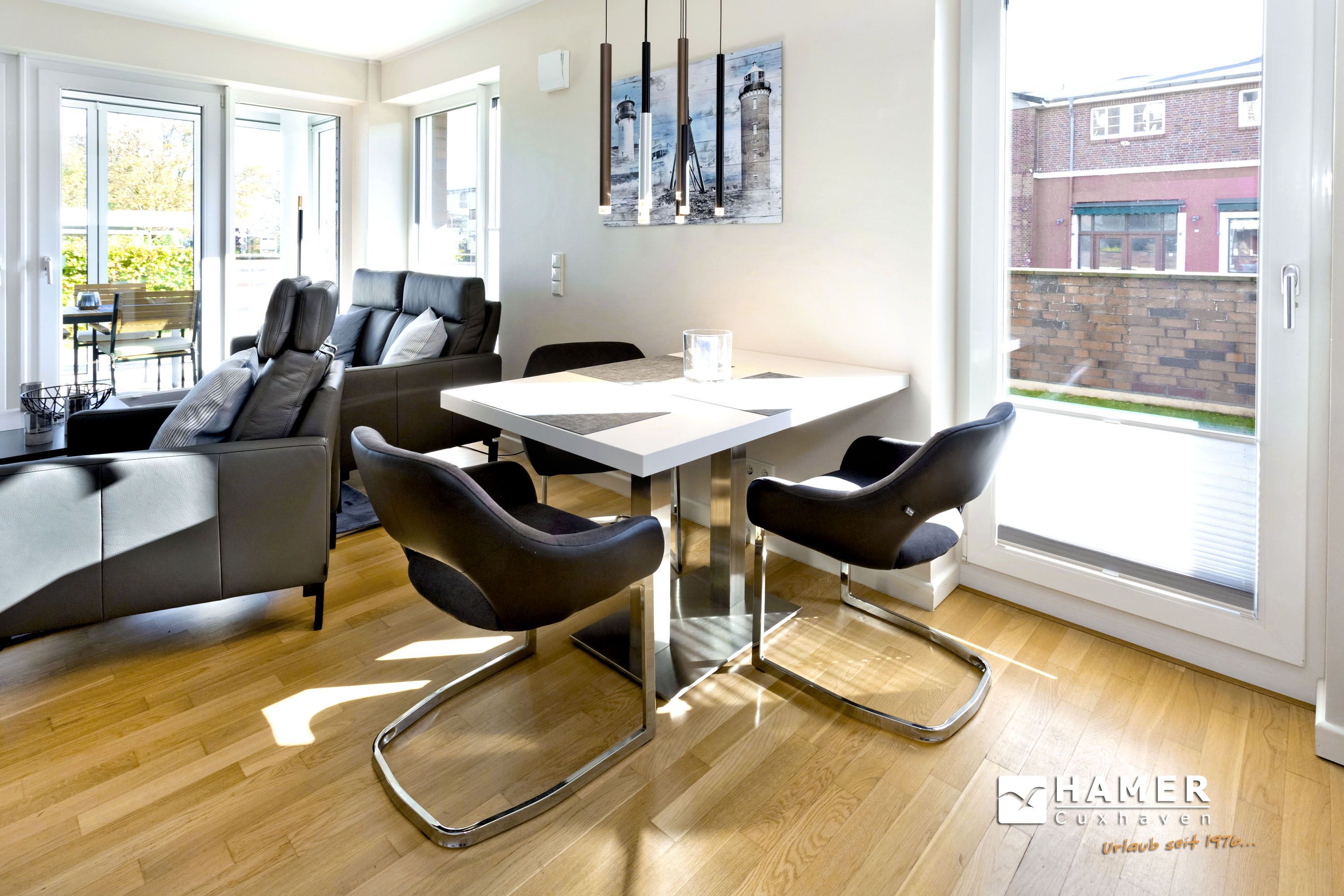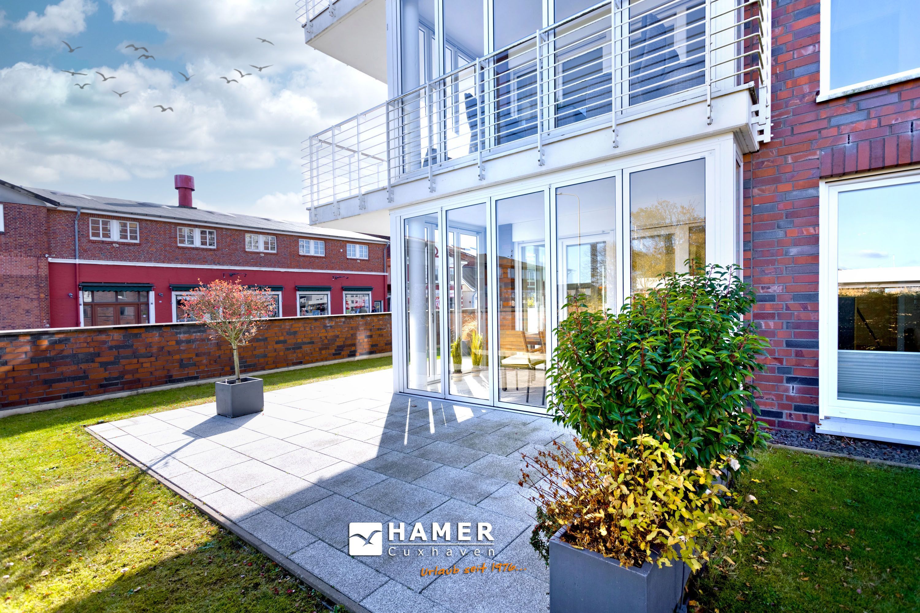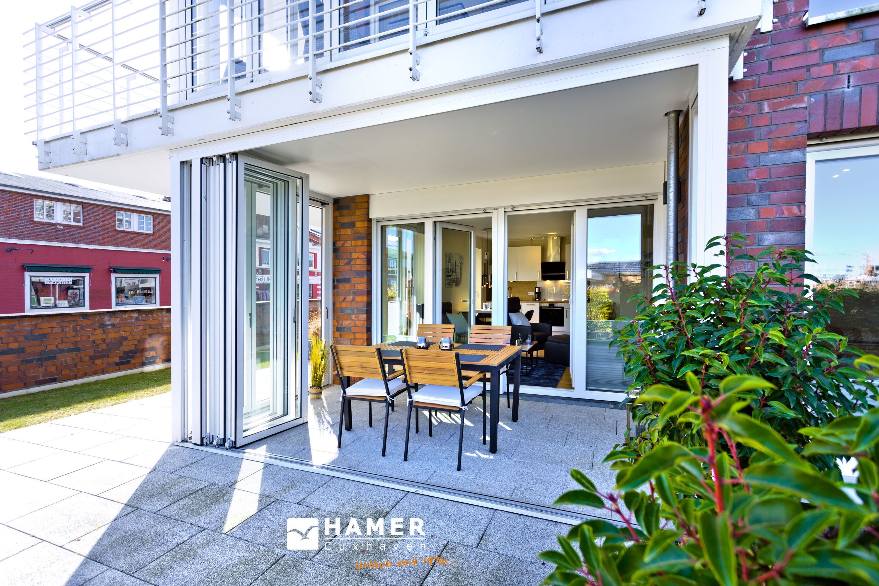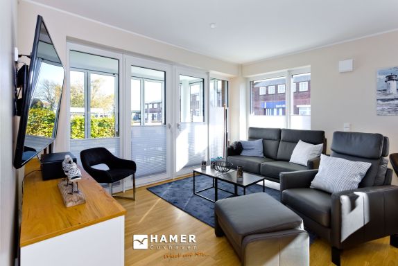 Haus Kapitän Alexander, direkt an der Marina Cuxhaven gelegene Neubauwohnung NEU RENOVIERT und NEU MÖBLIERT Oktober 2024 ca. 78m². Tolle 3 Zimmer-Luxus-Wohnung im Erdgeschoss für max. 3 Pers. ausgestattet. Großzügiges Wohnzimmer mit Terrasse (nord/ost). Die Terrasse ist teilweise windgeschützt als Loggia zu nutzen. Vollständig ausgestattete Küchenzeile, 1 Schlafzimmer mit Doppelbett (RÖWA Lattenrost elektr. verstellbar) und TV, Fliegengitter und großem Einbauschrank, 1 Schlafzimmer mit Einzelbett (Lattenrost elektr. verstellbar). Alle Räume sind über elektr. Außenjalousien zu verdunkeln. Fußbodenheizung, Kostenfreies W-Lan-Internet, Kabel-TV und Magenta TV, Nespresso Maschine, barrierefreie Dusche/WC, Miele-Waschmaschine und Miele-Trockner in der Wohnung. Reservierter Pkw-Stellplatz im Carport #8, Fahrradkeller, Nichtraucher und es sind keine Haustiere gestattet.