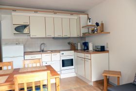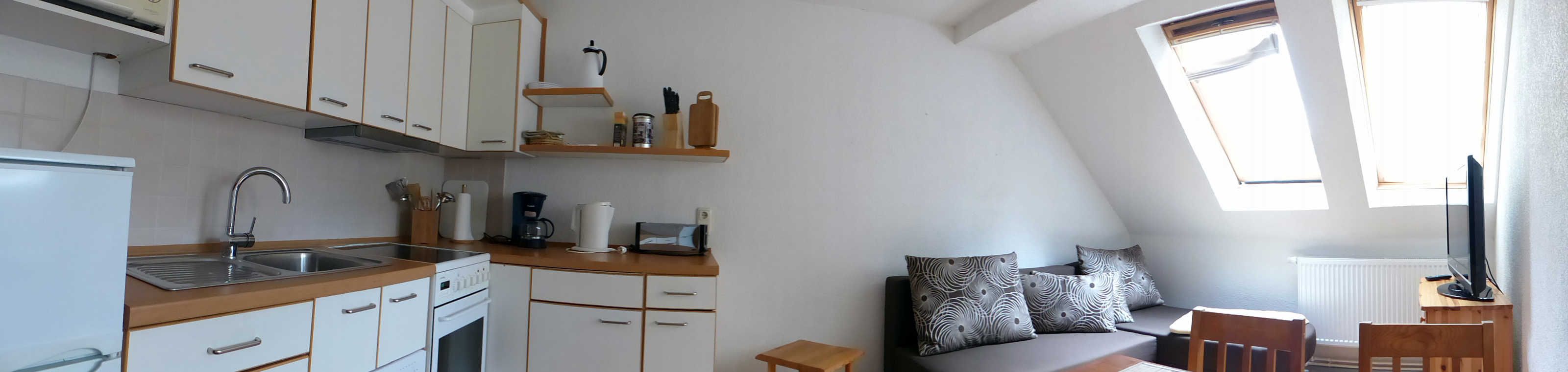 Die in beiden Wohnungen komplett ausgestattete Küchenzeile verfügt über einen Kühlschrank mit Gefrierfach, 4-Kochstellen-Ceranfeld, Backofen, Mikrowelle, Geschirrspüler, Wasserkocher, Kaffeemaschine, Toaster, etc.