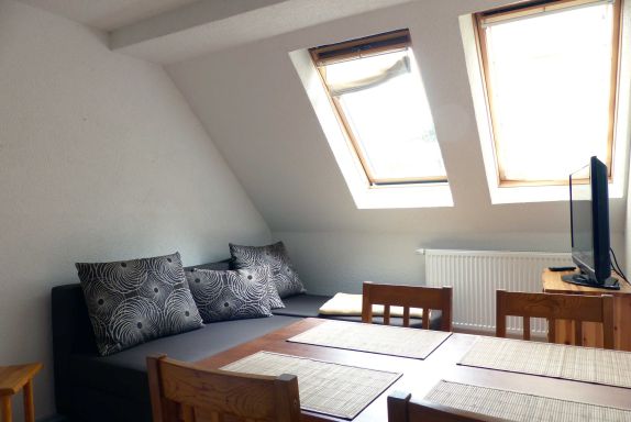 - Wohnraum mit integrierter Küchenzeile, Essecke, Sitzecke und Sat-TV