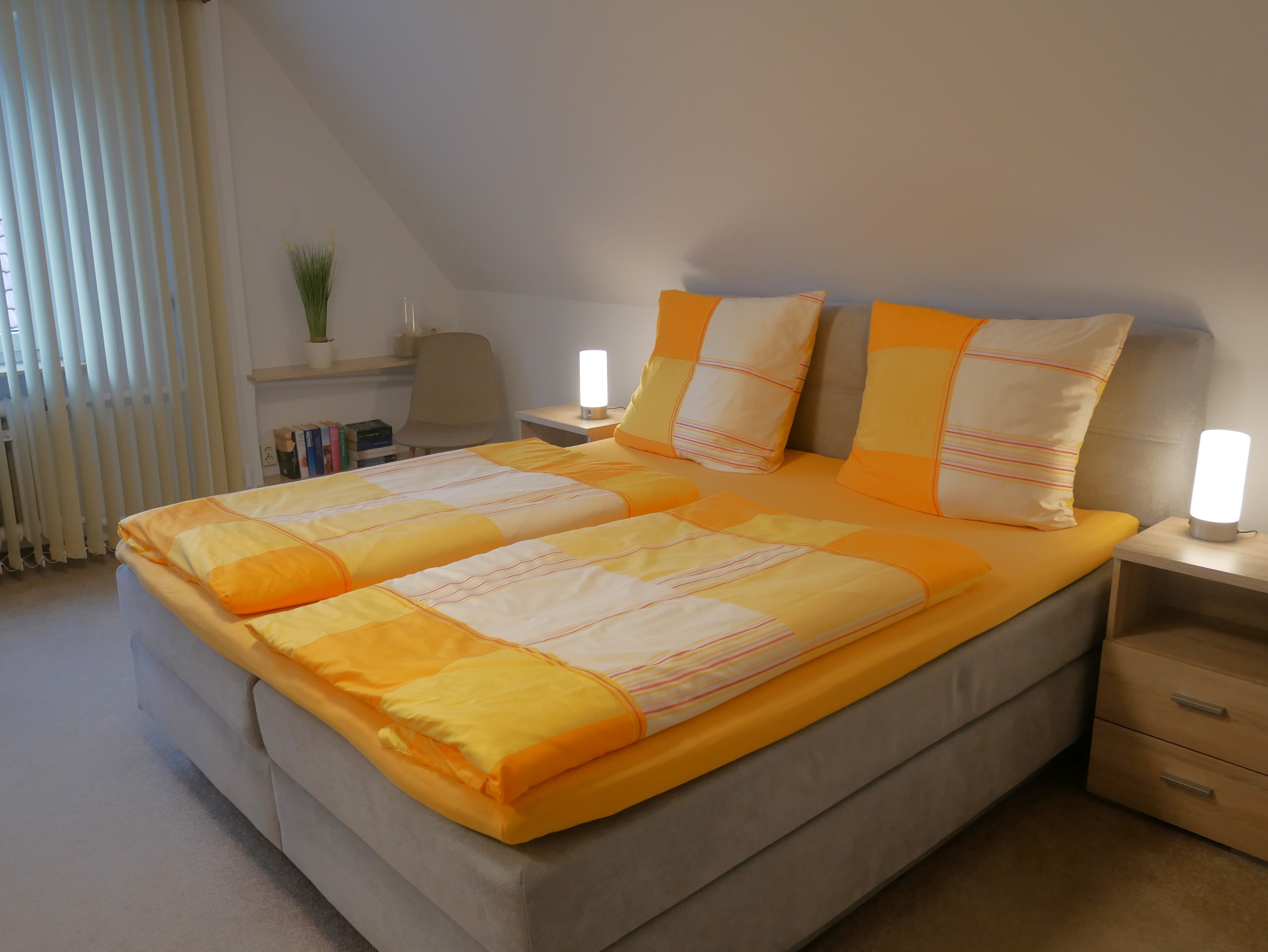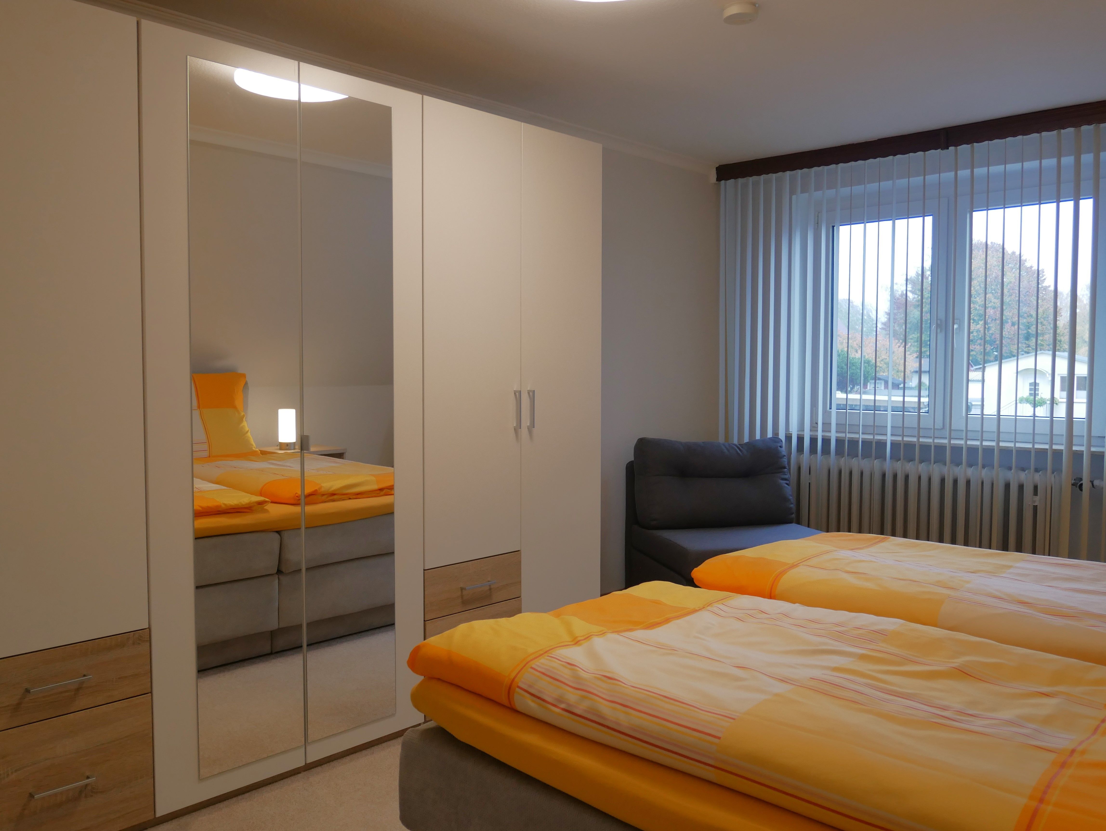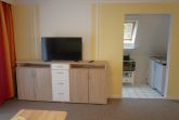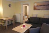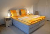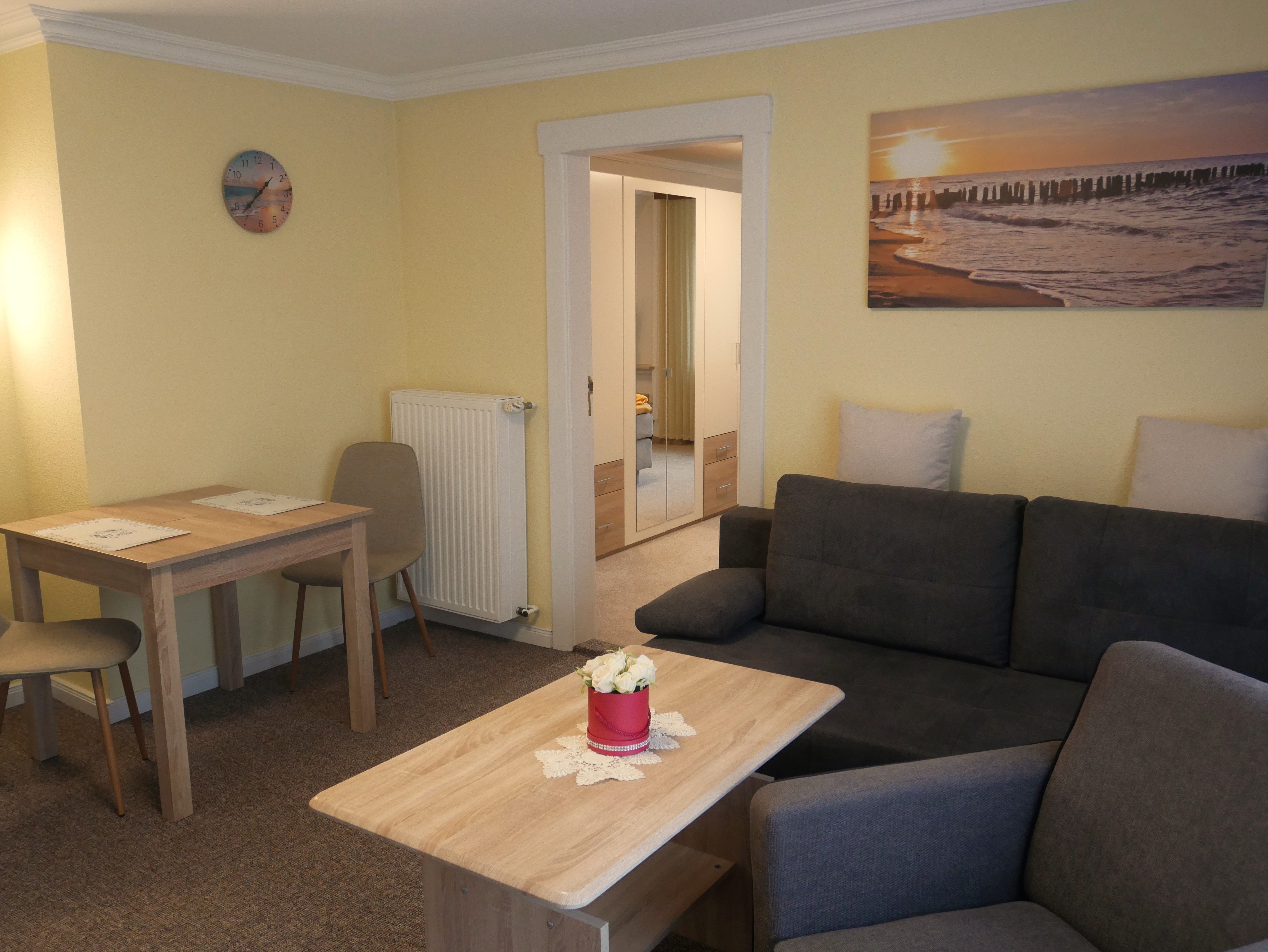 Die moderne und gemütliche 2-Raum-Fereinwohnung ist ca. 46m² groß und befindet sich im ersten Obergeschoss des Hauses. Das Wohnzimmer ist mit einer Couchsitzgruppe (ausklappbare Couch, Liegefläche 1,50 x 1,90 m), Couchtisch, Flachbild-TV und mit einem Radio ausgestattet. Das Schlafzimmer verfügt über ein Doppelbett und über einen Kleiderschrank. Die separate Pantry-Küche ist ausgestattet mit einem 2-Platten-Herd, Kühlschrank, Kaffeemaschine, Wasserkocher, Mikrowelle und mit einem Toaster. Der Essbereich ist im Wohnzimmer integriert. Das Badezimmer ist mit einer Dusche/WC ausgestattet. Haustiere nur auf Anfrage erlaubt und gegen Gebühr für 6,-€/Tag.