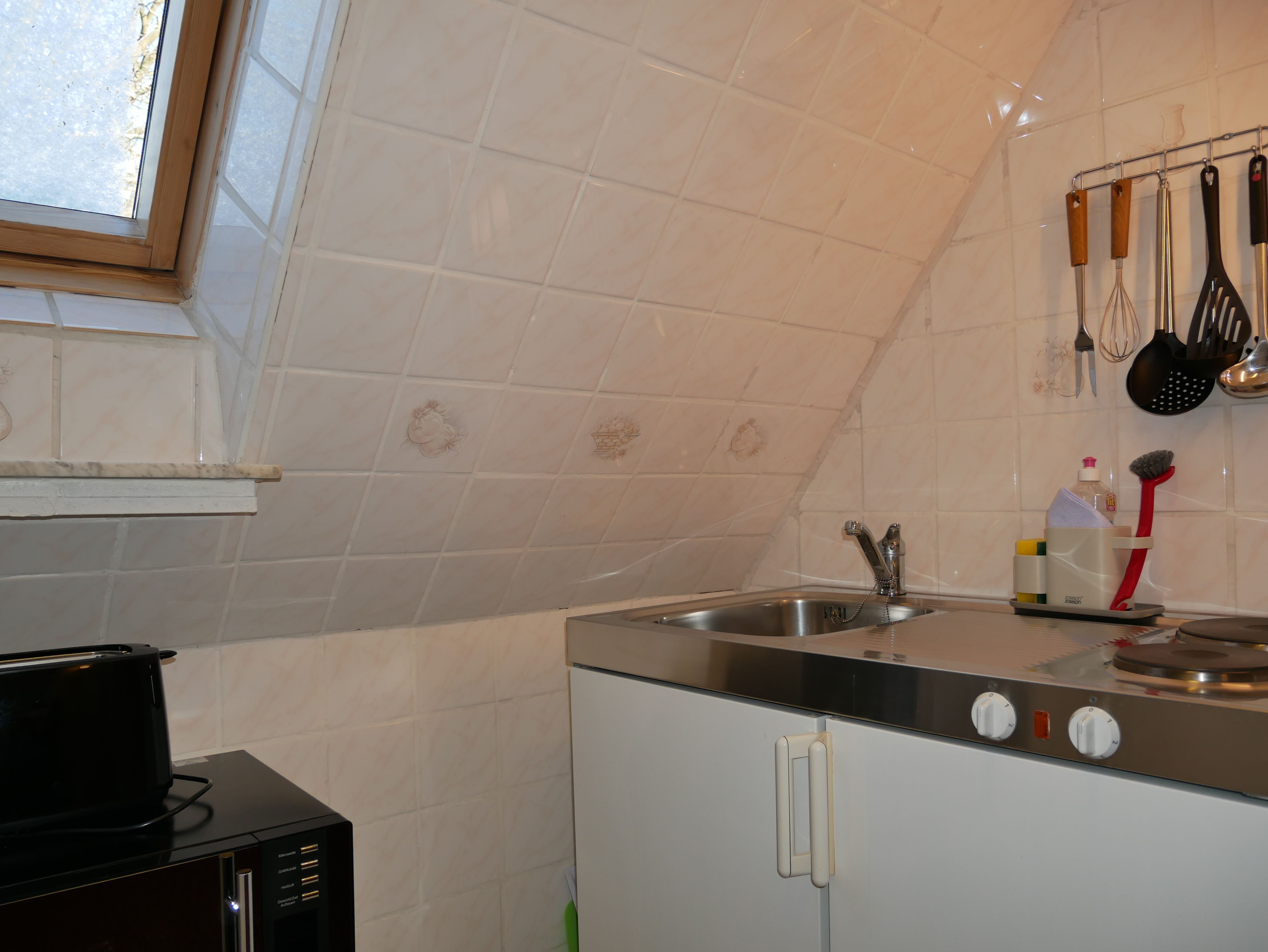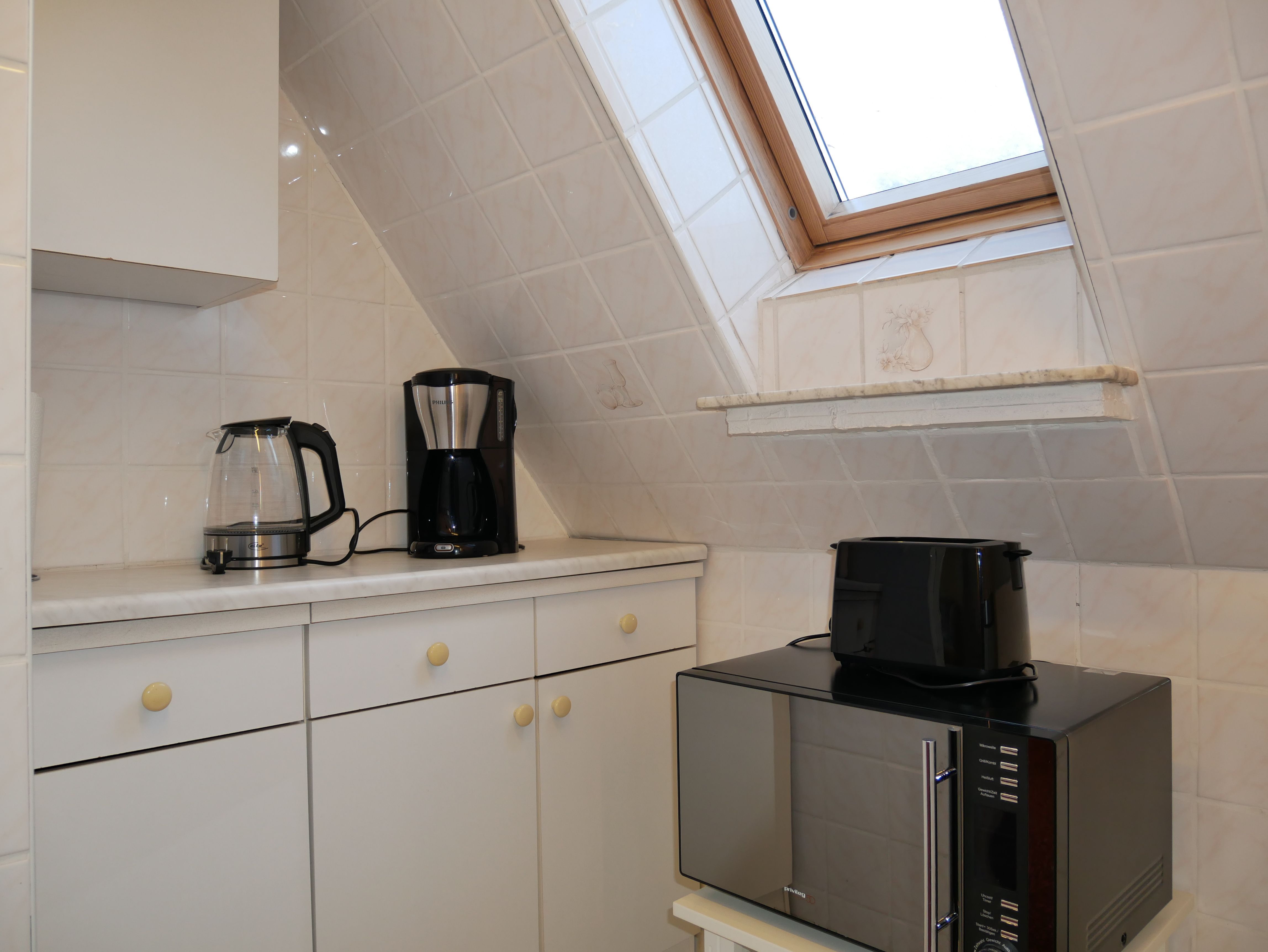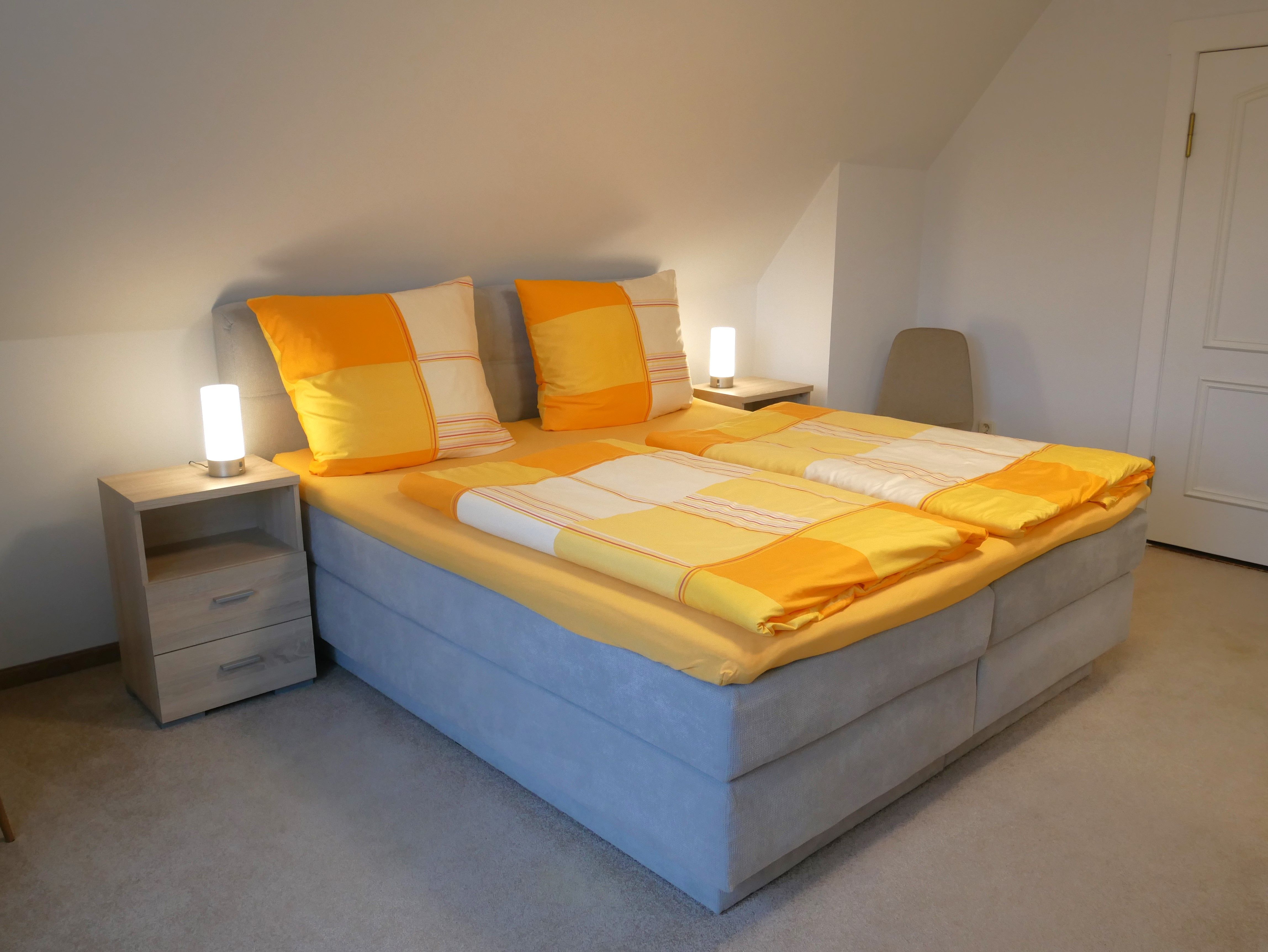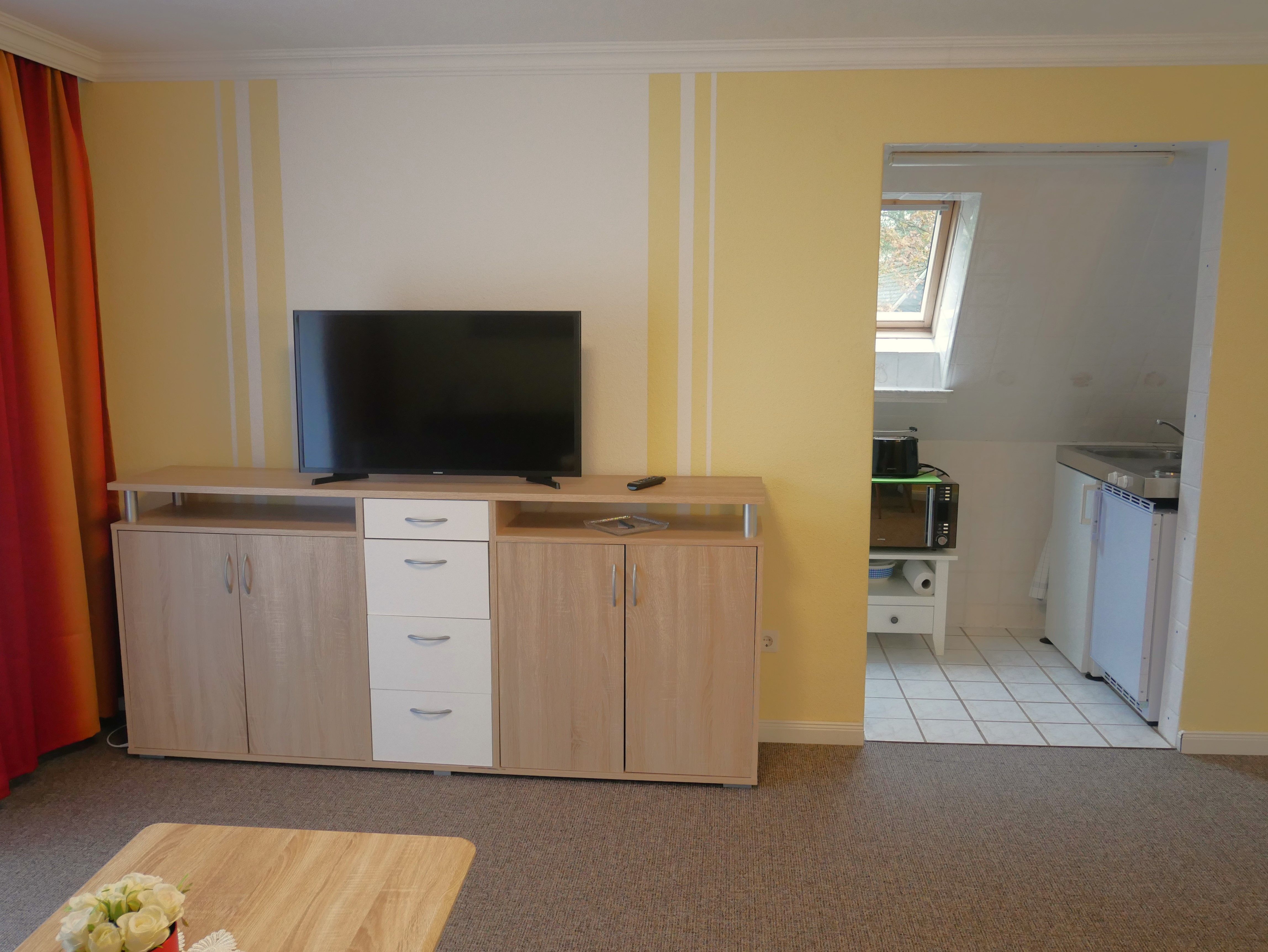 Die moderne und gemütliche 2-Raum-Fereinwohnung ist ca. 46m² groß und befindet sich im ersten Obergeschoss des Hauses. Das Wohnzimmer ist mit einer Couchsitzgruppe (ausklappbare Couch, Liegefläche 1,50 x 1,90 m), Couchtisch, Flachbild-TV und mit einem Radio ausgestattet. Das Schlafzimmer verfügt über ein Doppelbett und über einen Kleiderschrank. Die separate Pantry-Küche ist ausgestattet mit einem 2-Platten-Herd, Kühlschrank, Kaffeemaschine, Wasserkocher, Mikrowelle und mit einem Toaster. Der Essbereich ist im Wohnzimmer integriert. Das Badezimmer ist mit einer Dusche/WC ausgestattet. Haustiere nur auf Anfrage erlaubt und gegen Gebühr für 6,-€/Tag.