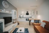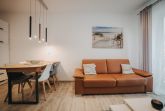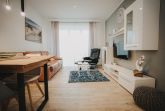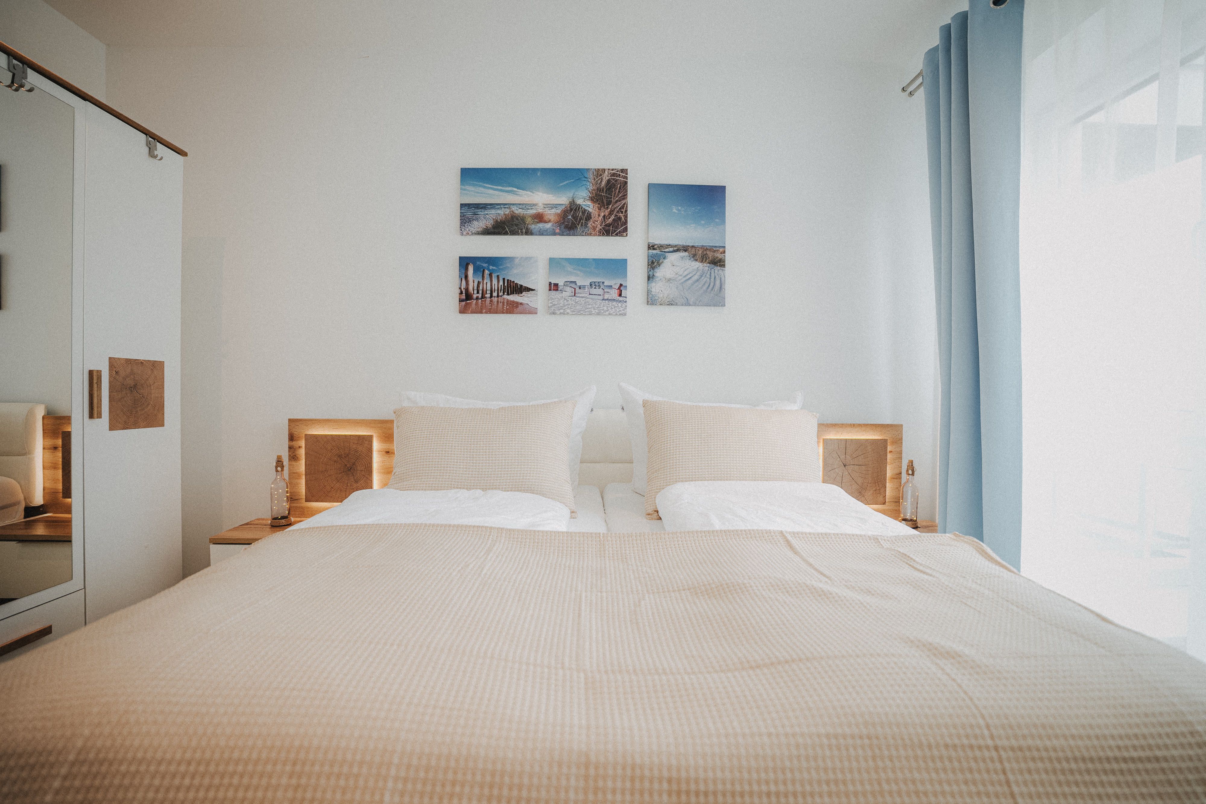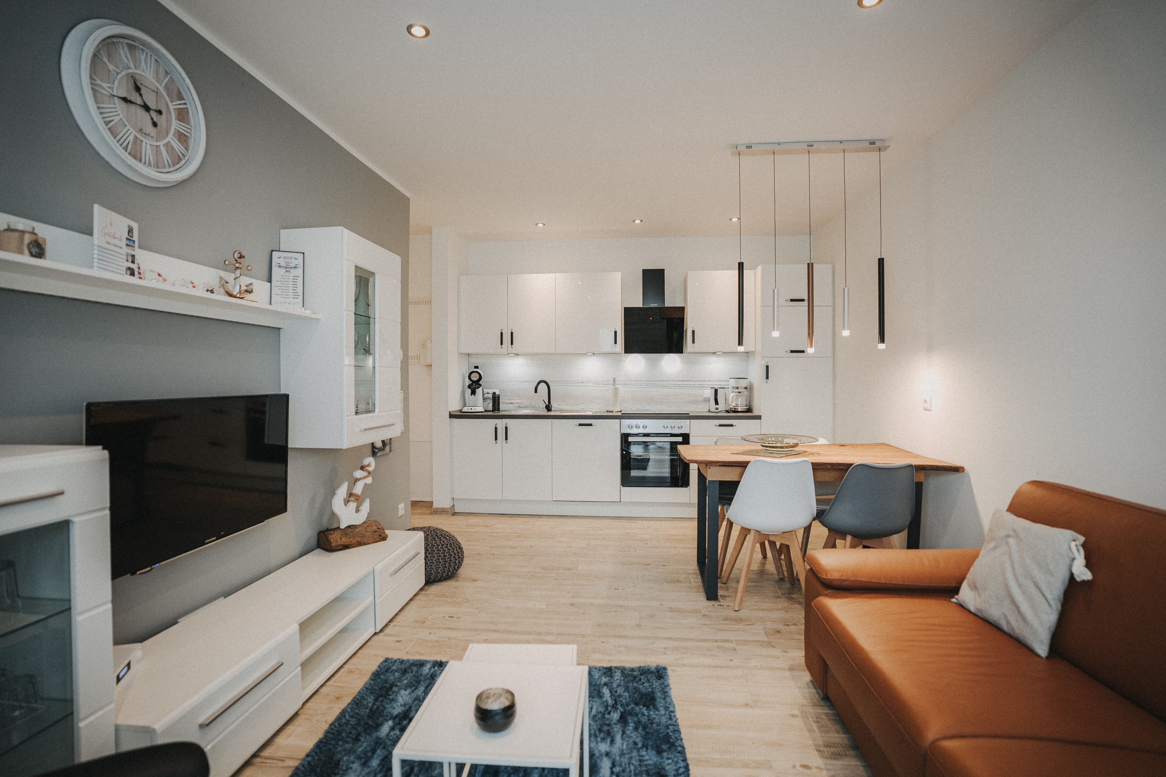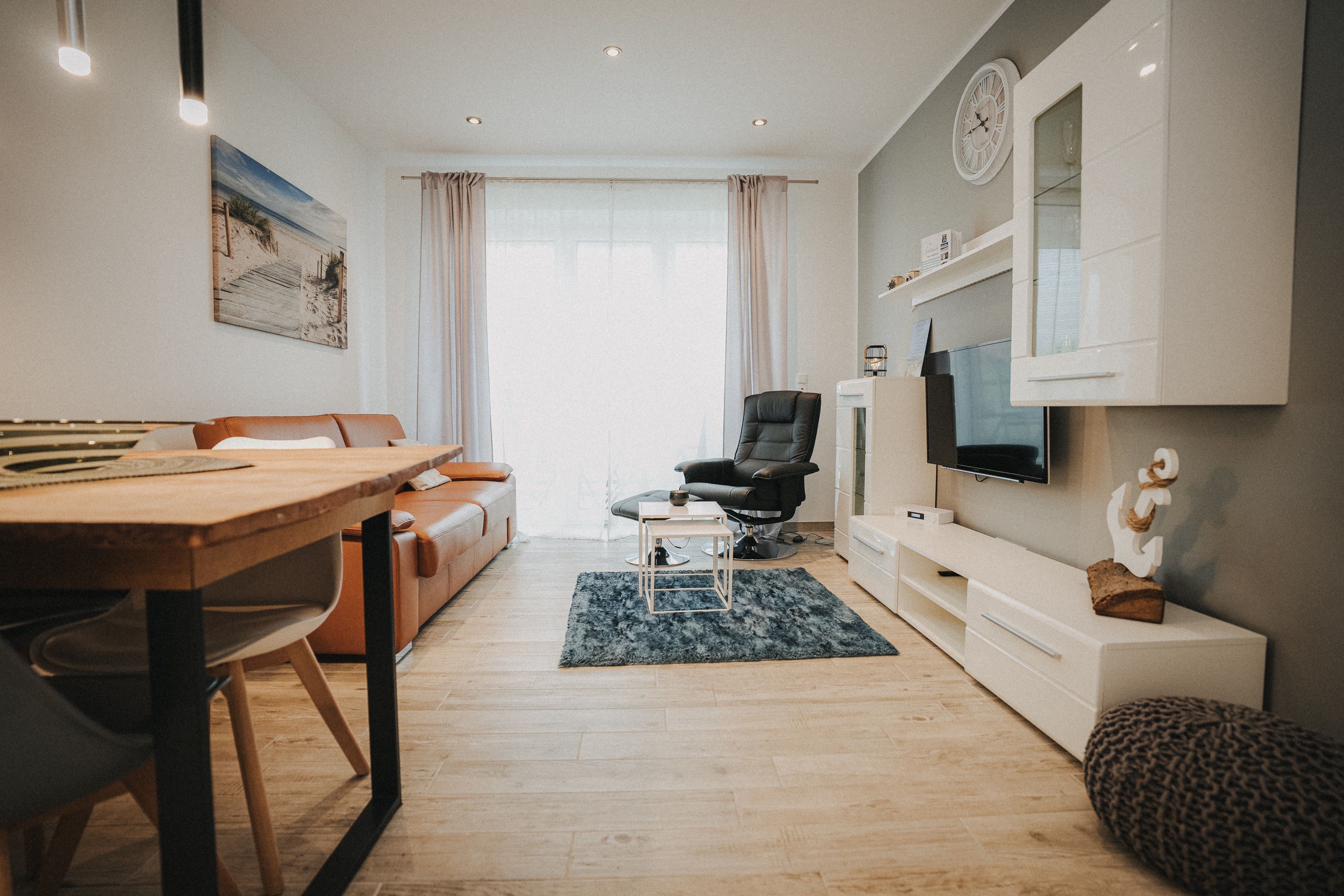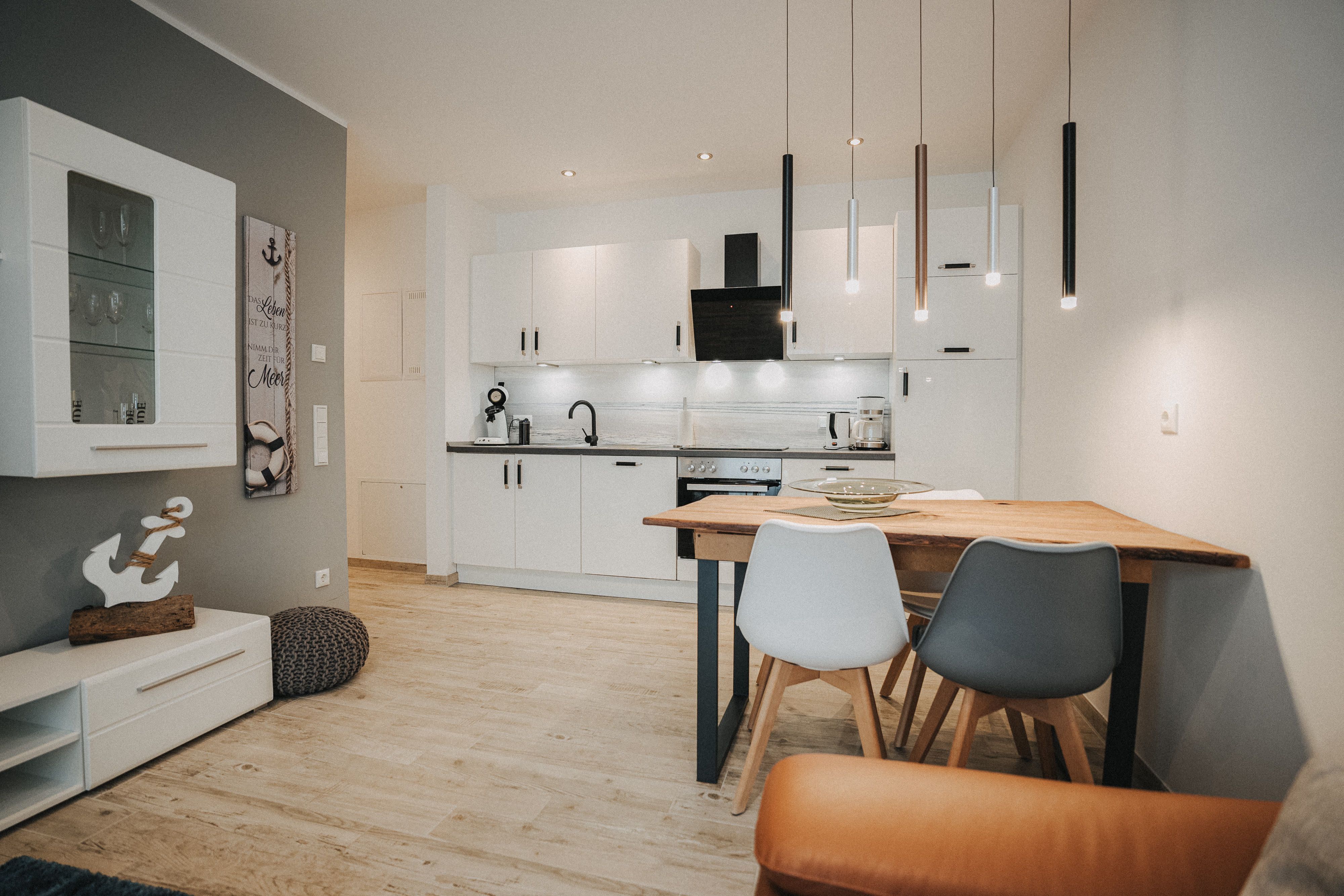 Unsere schicke Ferienwohnung Friedas Friesentraum heißt Sie  herzlich willkommen: Es empfängt Sie ein heller Eingangsbereich mit Flur und Garderobe. Stärken Sie sich in der voll ausgestatteten Küchenzeile mit  Esstisch in Naturholzoptik - Entspannen Sie im maritim gestalteten Wohnbereich mit großem Flat-TV auf der Ledercouch  - Ziehen Sie sich zurück ins Schlafzimmer mit Doppelbett - Konsolen wandhängend - , Kleiderschrank und zusätzlichem Flat-TV. Von hier aus gelangen Sie ins schicke komfortable Duschbad mit Flacheinstieg und Sommerregendusche  -  Rasten und entspannen Sie auf dem überdachten Balkon mit Mobiliar   -  Es steht Ihnen ebenfalls ein geräumiger Abstellraum zur Verfügung. Hier befinden sich Waschmaschine und Trockner.