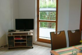 Couch und Flachbild- TV, Radio, Essplatz mit 4 Stühlen, Zugang zur Terrasse