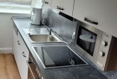 • separate Küche mit Einbauküche (E-Herd mit Ceranfeld und Backofen, Mikrowelle, Geschirrspüler, separat stehender Kühl- und Gefrierschrank (1,90 m Höhe))