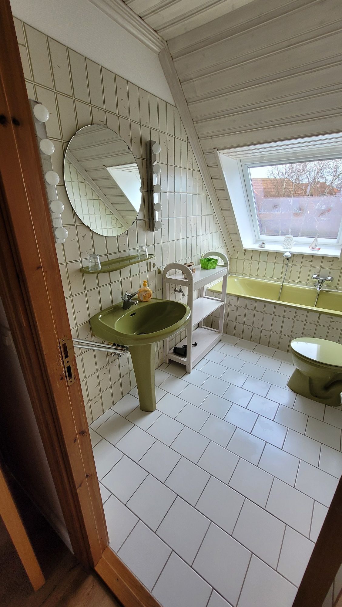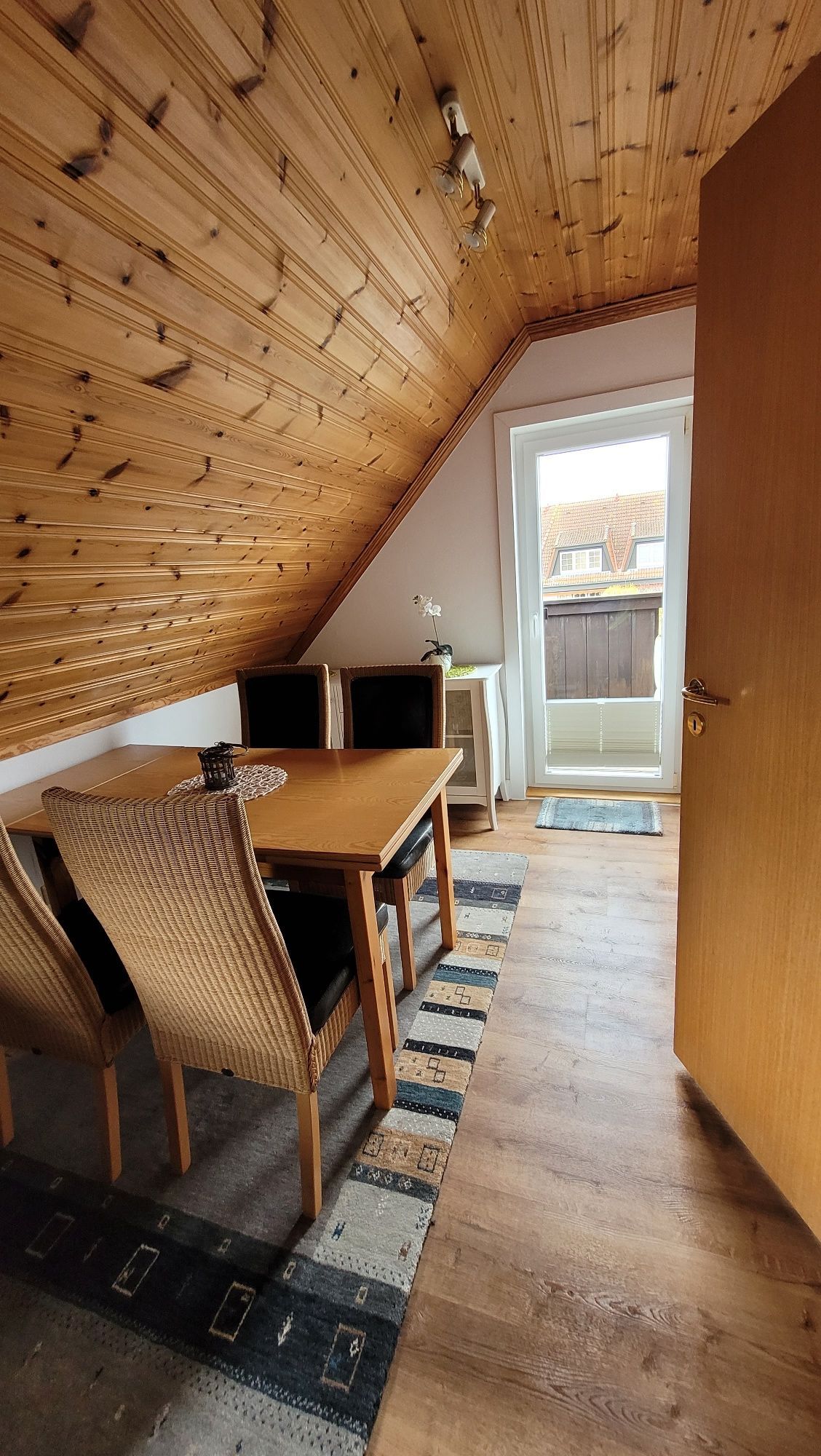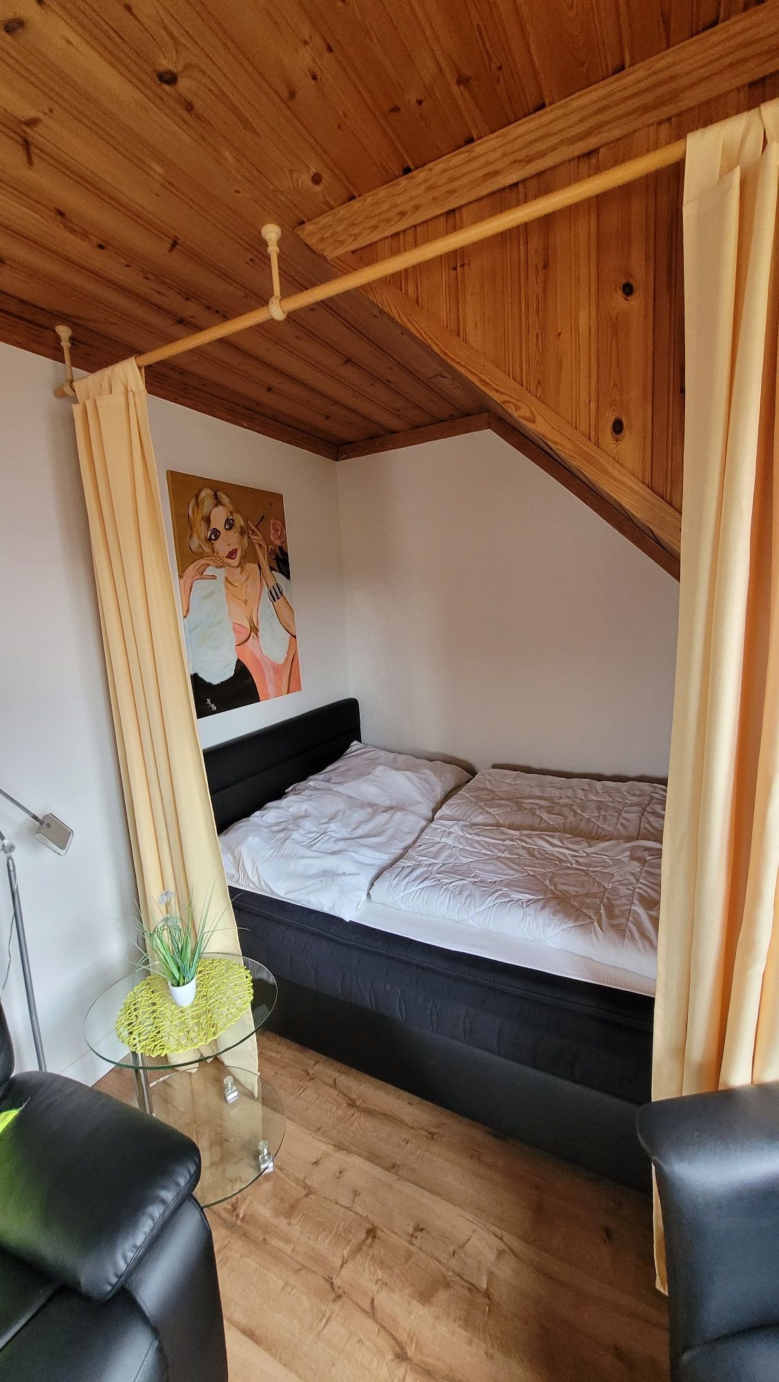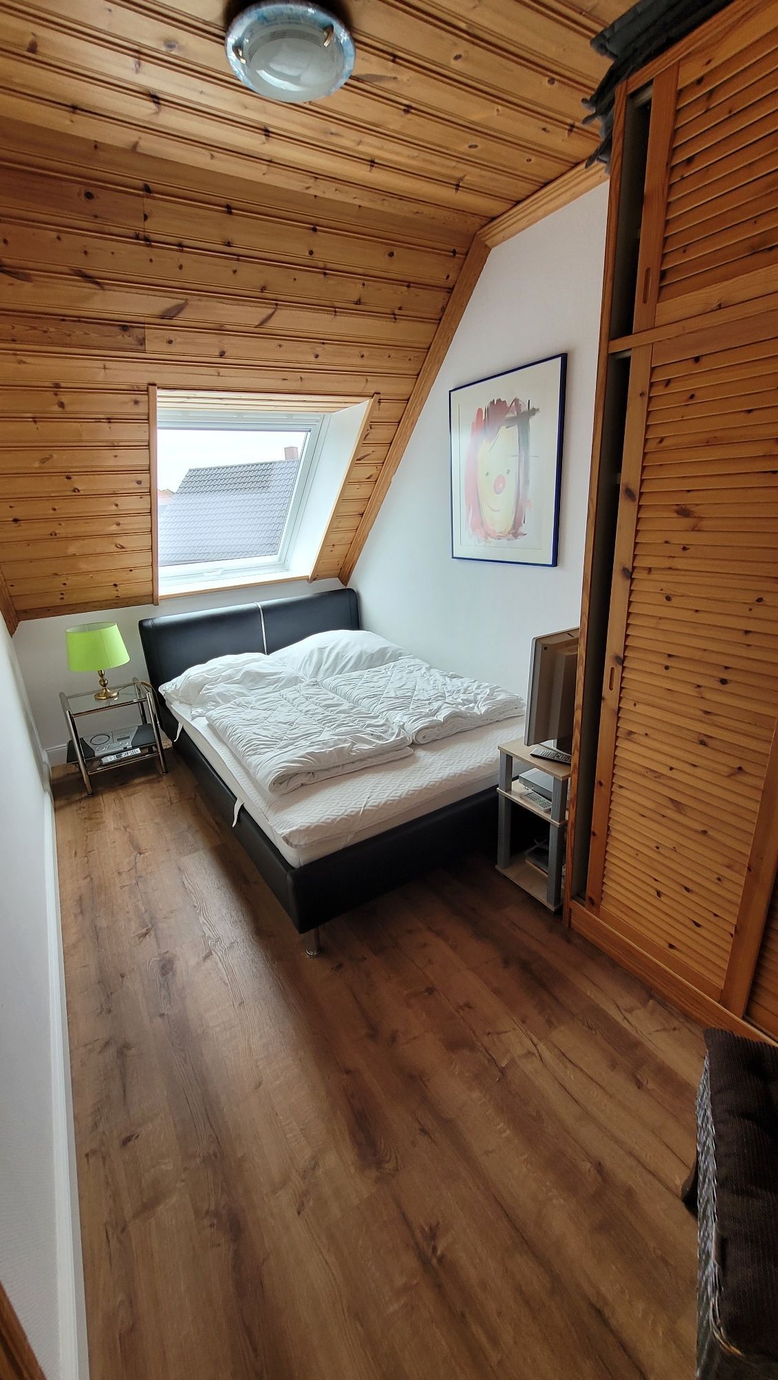 Dachgeschoss, bis drei Personen, ca. 45 m² große, gemütliche Wohnung mit Kieferndecken. In der Wohnung befinden sich Flur, gemütlicher Wohn-/Schlafraum mit Essecke, Badezimmer mit Wanne, separate Küche mit Einbauküche.