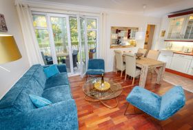 Herzstück Ihres Urlaubsdomizils ist das wunderbar geräumige und überaus behaglich eingerichtete Wohn-/Esszimmer mit integrierter Küchenzeile, bequemen Sitzmöbeln, Esstisch sowie einem großen Flachbild-TV, DVD-Player und Musikanlage. W-LAN ist gratis verfügbar.