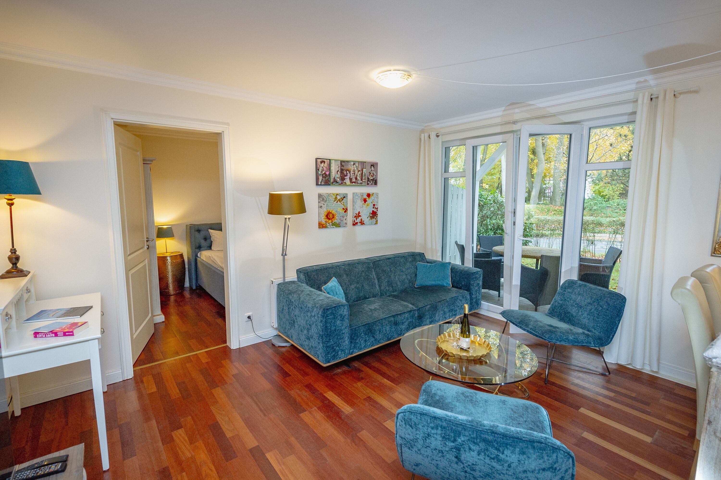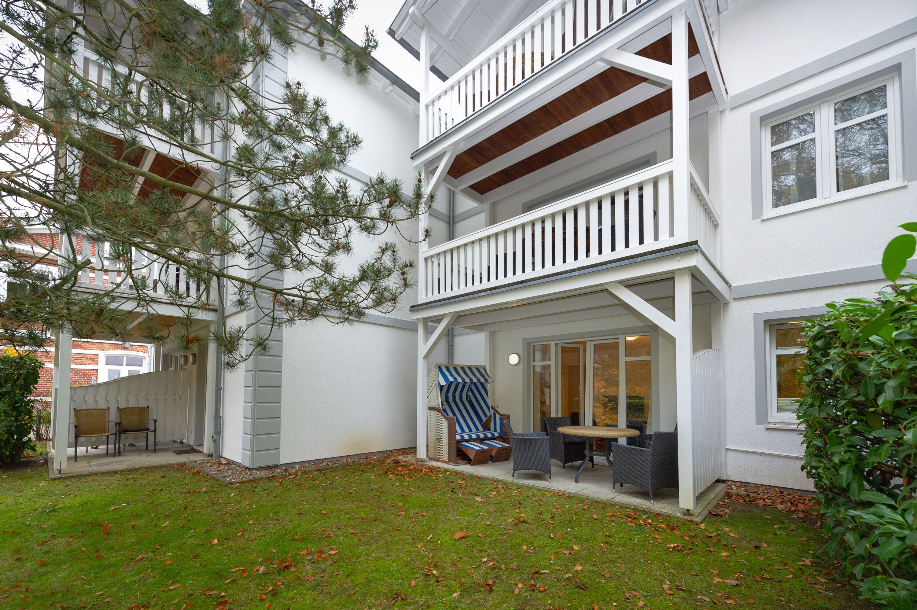 Vom Wohnbereich aus gelangen Sie durch eine breite Terrassentür auf Ihren Freiluftbereich mit Strandkorb, einem Tisch und 4 Stühlen. Ein Rasenstück ist vorgelagert.