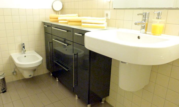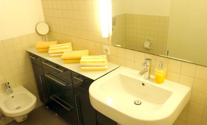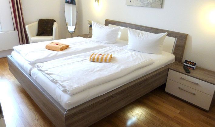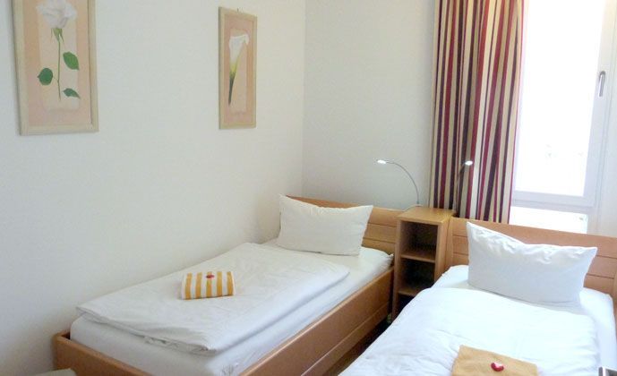 Es gibt 2 Schlafzimmer, für kleine Kinder stehen ein Babybett und ein Hochstuhl bereit. In einem der beiden Schlafzimmer befindet sich zudem ein weiterer Fernseher. Das Bad ist großzügig mit Bidet und begehbarer Dusche ausgestattet. Wie alle Wohnungen in der Kurparkresidenz ist auch diese barrierefrei gebaut.