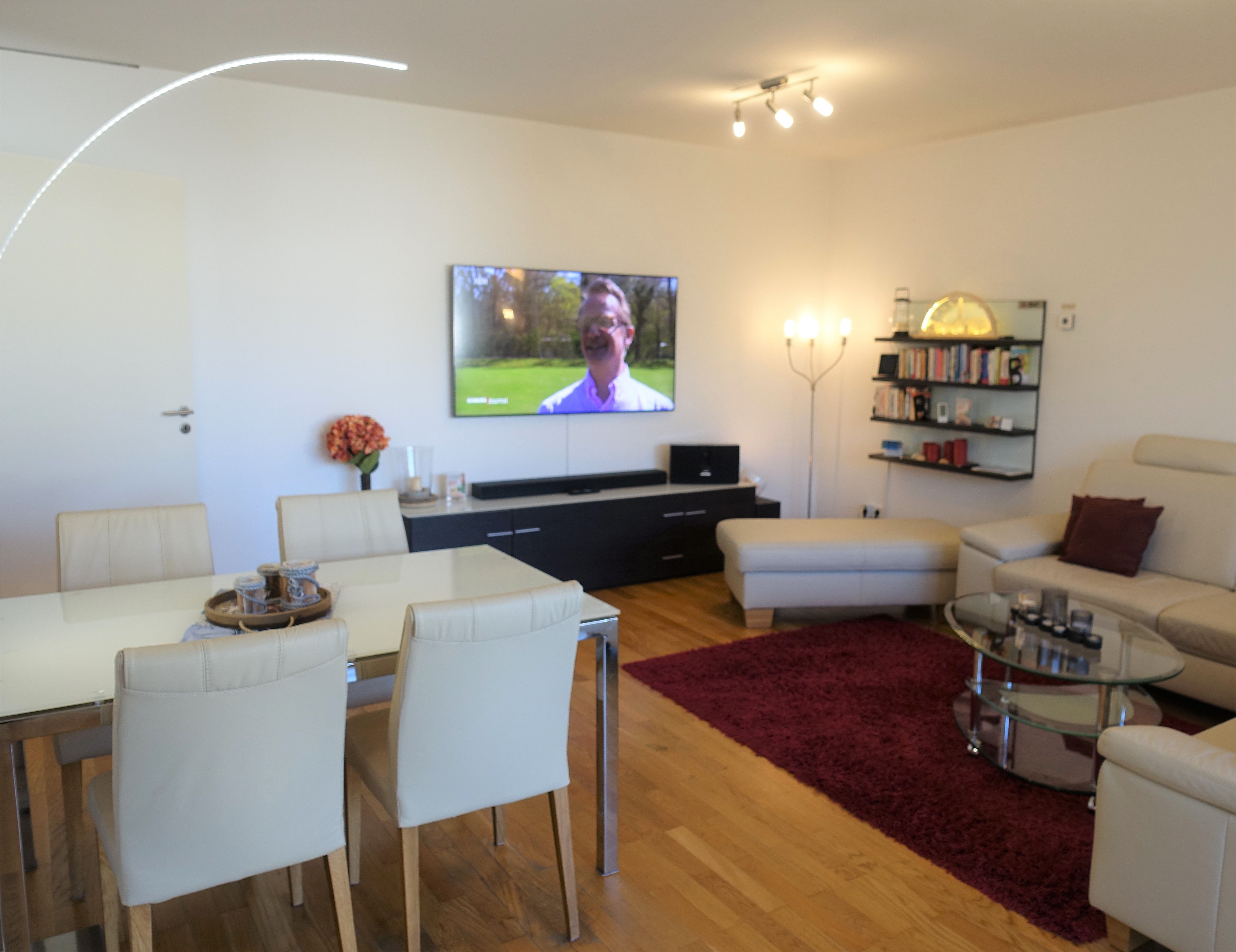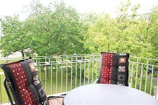Die Ferienwohnung liegt im 2. Obergeschoss. Bodentiefe Fenster geben den Blick frei auf die große Balkon-Terrasse und den grünen Garten vor der Residenz. Genießen Sie das schöne Ambiente dieser Wohnung.