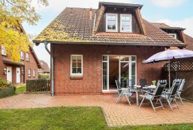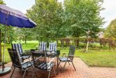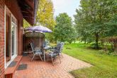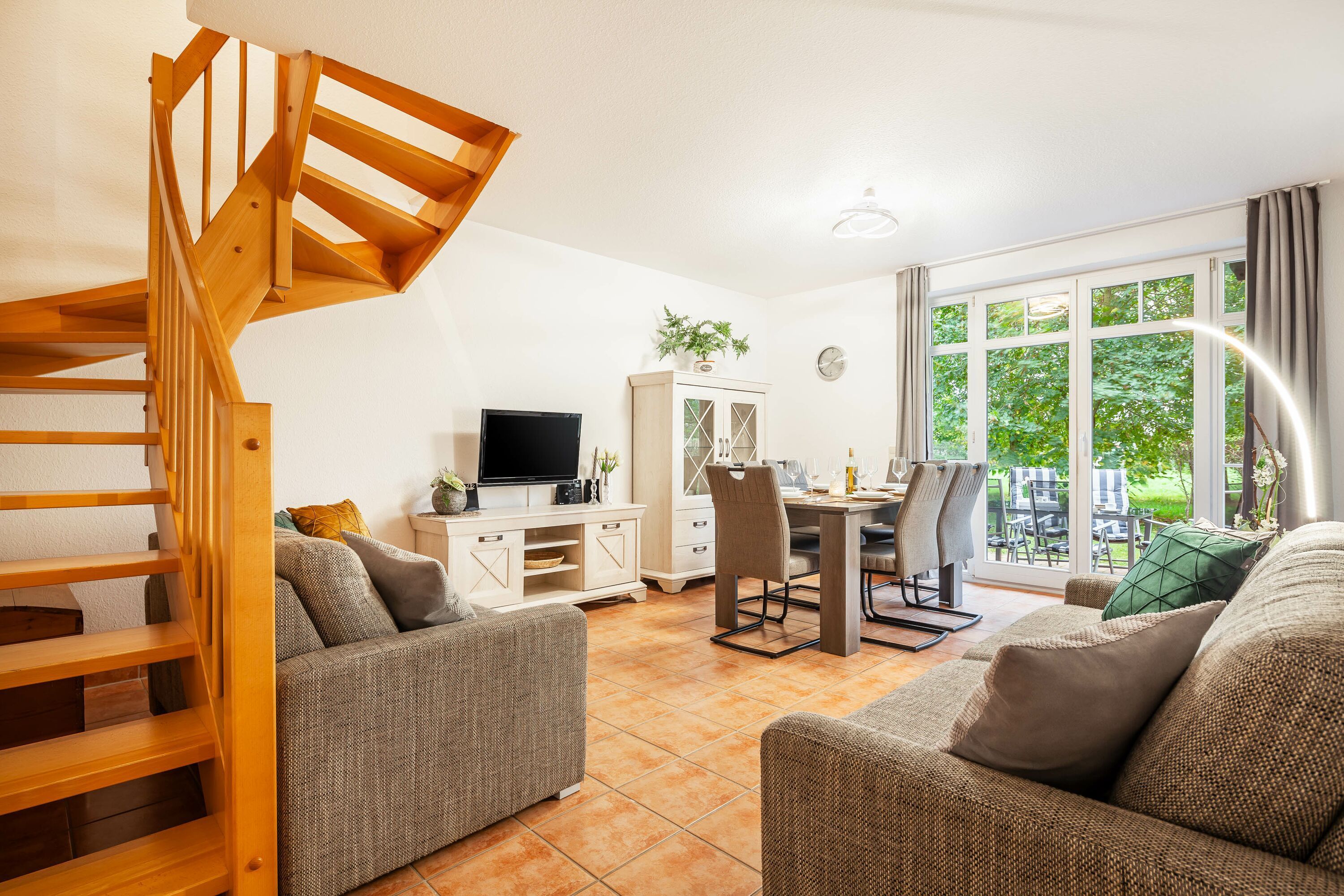 Das Wohn- und Esszimmer ist offen gestaltet und bietet durch bodentiefe Fenster viel Licht. Von hier aus gelangt man auf die sonnige Terrasse, die zum Entspannen und Genießen einlädt. Die Ausstattung des Ferienhauses umfasst unter anderem eine Waschmaschine, einen Kinderhochstuhl und ein Kinderbett.