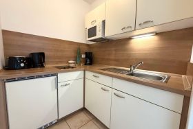 Die separate, voll ausgestattete Küche enthält einen Elektro-/Gasherd, eine Mikrowelle, einen Kühlschrank, einen Toaster und eine Kaffeemaschine. Zudem stehen Gefriermöglichkeiten und Geschirr sowie Besteck zur Verfügung.