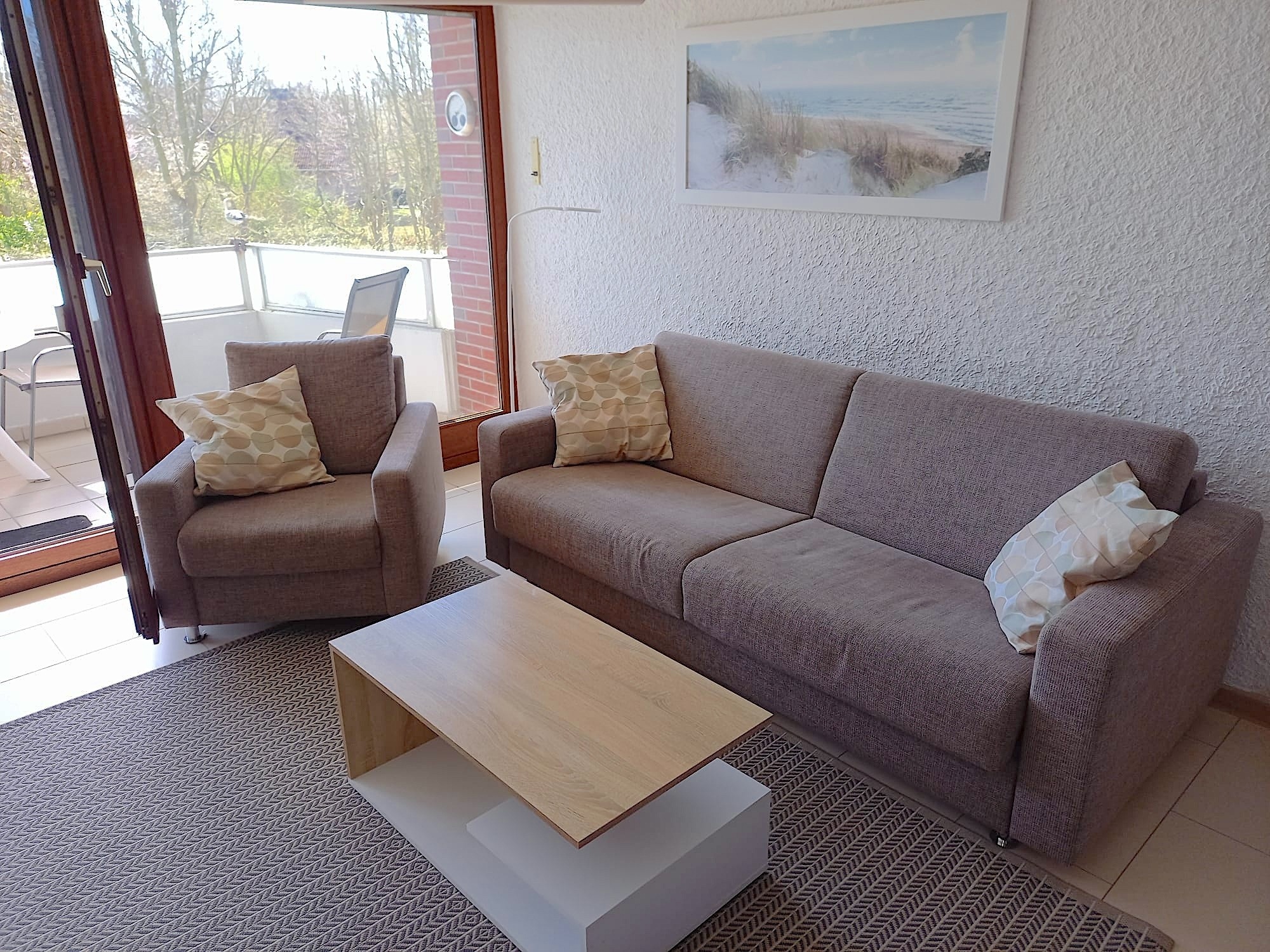 Das Apartment (52qm) bietet einen großzügigen Wohnbereich mit Laminatfußboden in Fliesenoptik, eine offene Küche und eine Essecke. Auf einem Schlafsofa zum Aufklappen mit Lattenrost (140 x 200) im Wohnbereich finden bis 2 Personen gemütliche Nachtruhe. Bei schlechtem Wetter gibt es Fernsehen in HD, Bücher und Gesellschaftsspiele. Ein Notfall- u. Verbandskasten ist vorhanden.