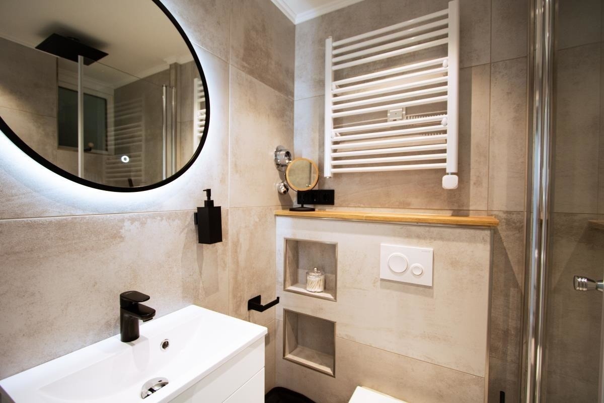 Dieser kleinen Wohlfühloase fehlt es an nichts, denn Sie ist mit ein paar Highlights wie USB Anschlüssen in den Steckdosen und einer Fußbodenheizung im Badezimmer perfekt geplant worden.