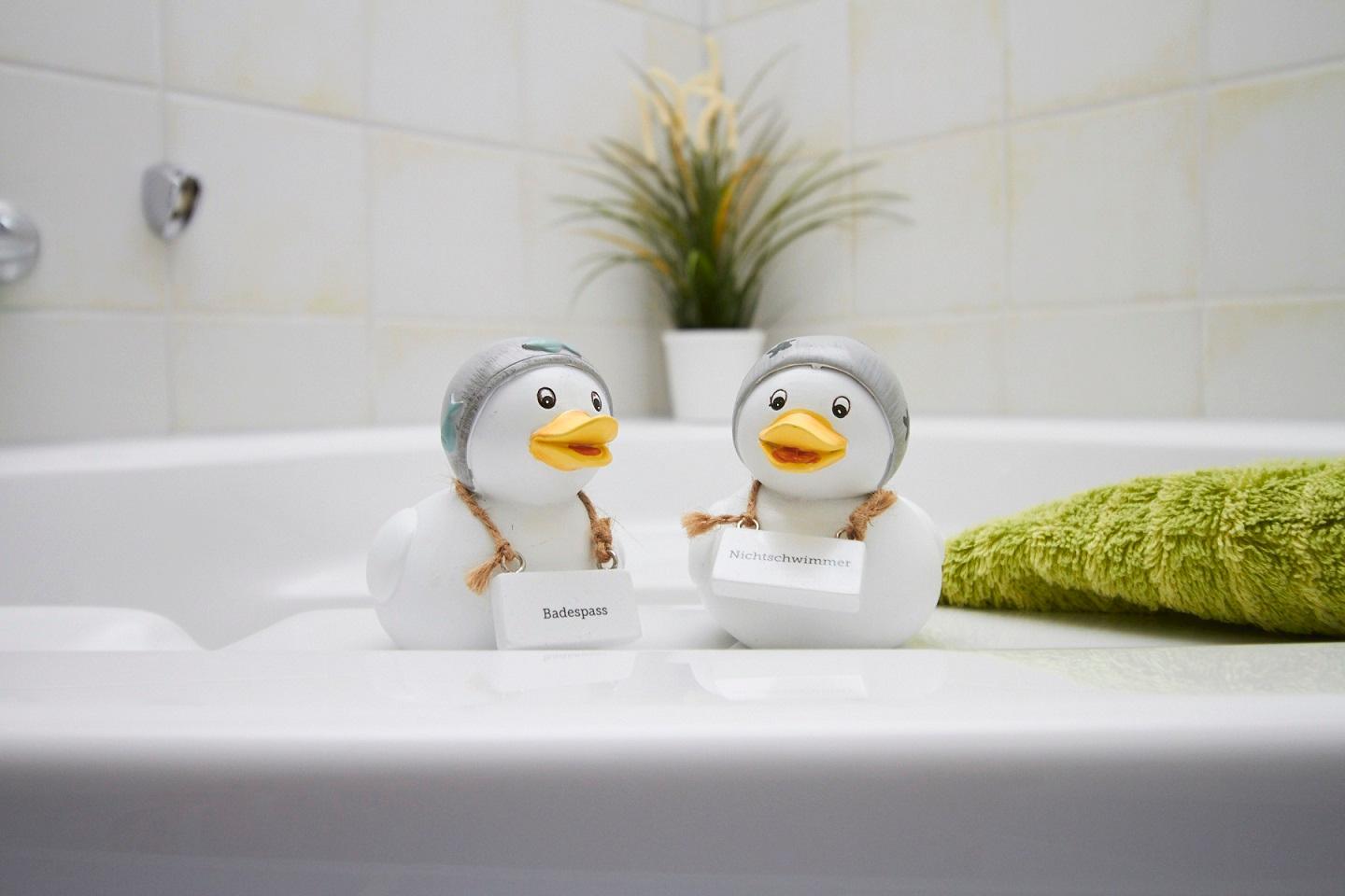 Das Badezimmer ist in maritimem Design aufwendig gefliest. Es gibt eine große Eckbadewanne und eine separate barrierefreie Dusche inklusive Duschhocker.